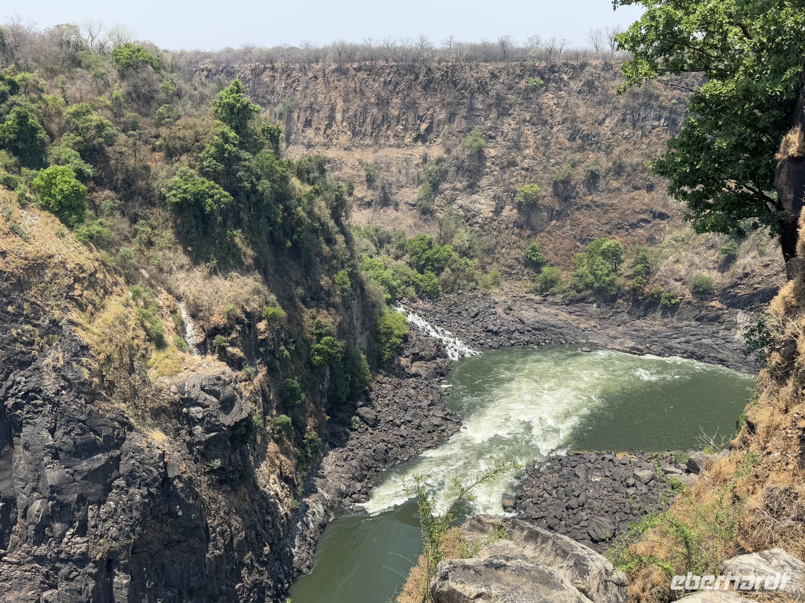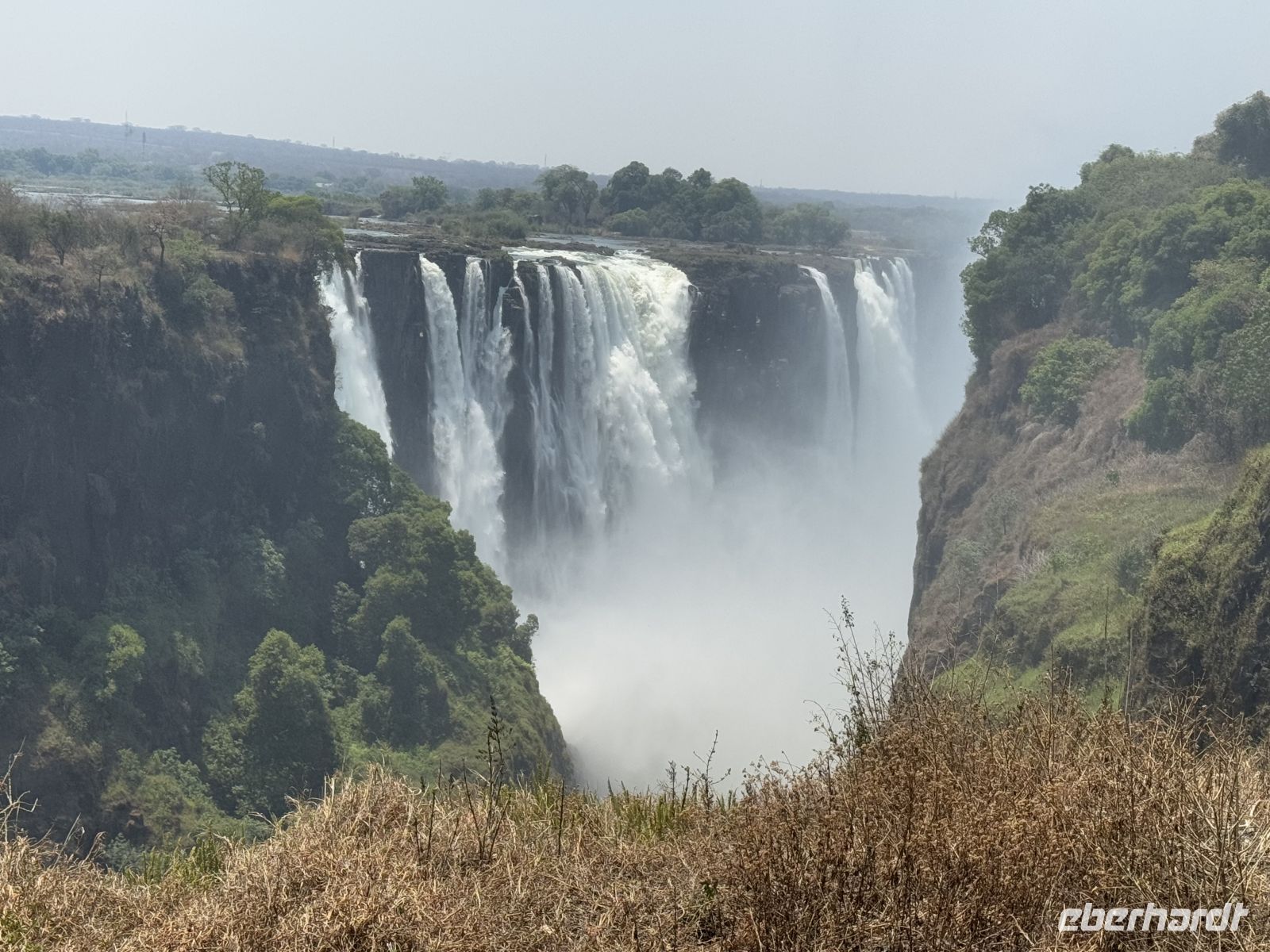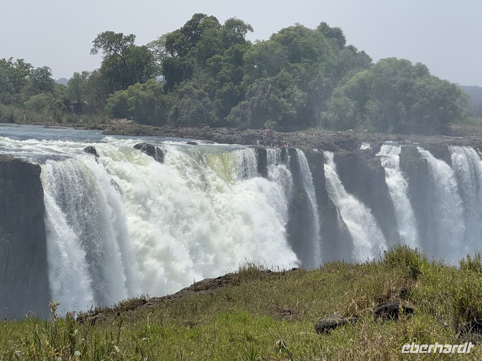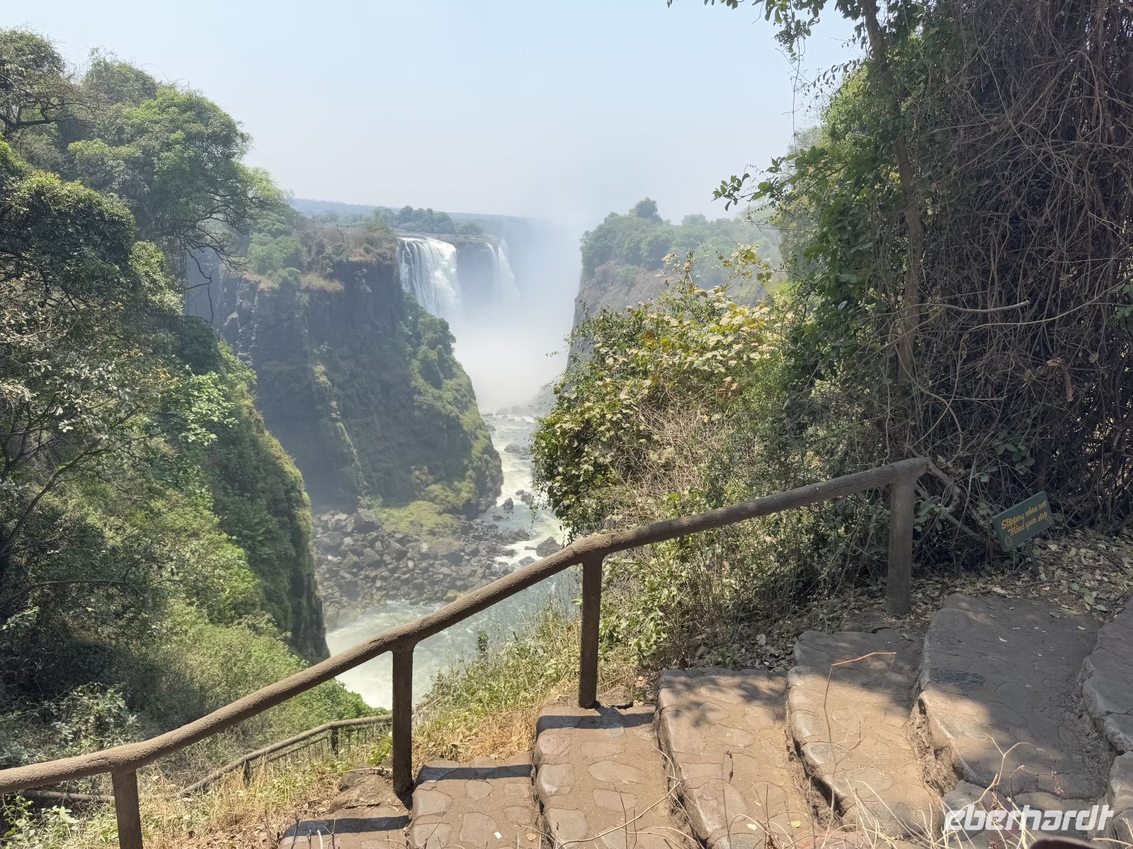 Wir filmen und fotografieren aus jeder erdenklichen Perspektive und laufen uns alle immer wieder über den Weg. Aufregend ist es hier. Immer wieder stürzen von der gegenüberliegenden Seite, dann schon Sambia, riesige Wassermassen in die Tiefe. Nach jeder Biegung sieht es wieder anders aus.