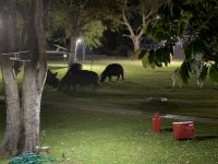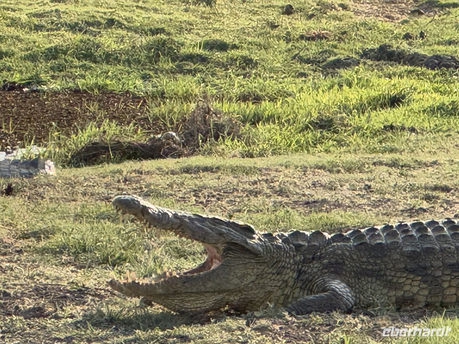 Aber es hört noch nicht auf, bewegen sich doch jetzt unsere 4 dicken Rasenmäher vor unseren Zimmern gleichmäßig nebeneinander malmend. Hier ist es wirklich wie im Dschungelbuch. Warzenschweine, Hippos, Elefanten, Krokodile, Reiher und sonstiges lümmelt und tümmelt sich in unserem Garten. Besser die Terrassentür bleibt heute Abend verschlossen.