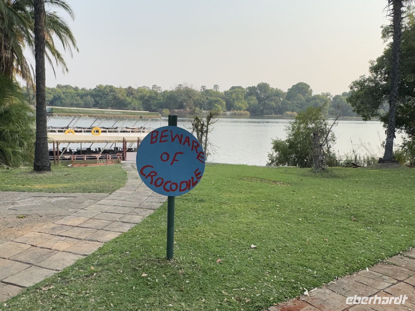 Los geht’s, der Bus wartet für die 200 Meter bis zum Bootsableger. Ähm. Keiner weiß warum, aber Safety first. Sehen wir doch hier überall Schilder, die vor Krokodilen, Hippos und anderen großen Tieren warnen. Also immer schön die Augen auf.