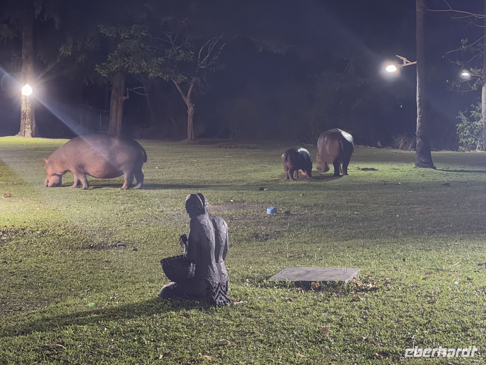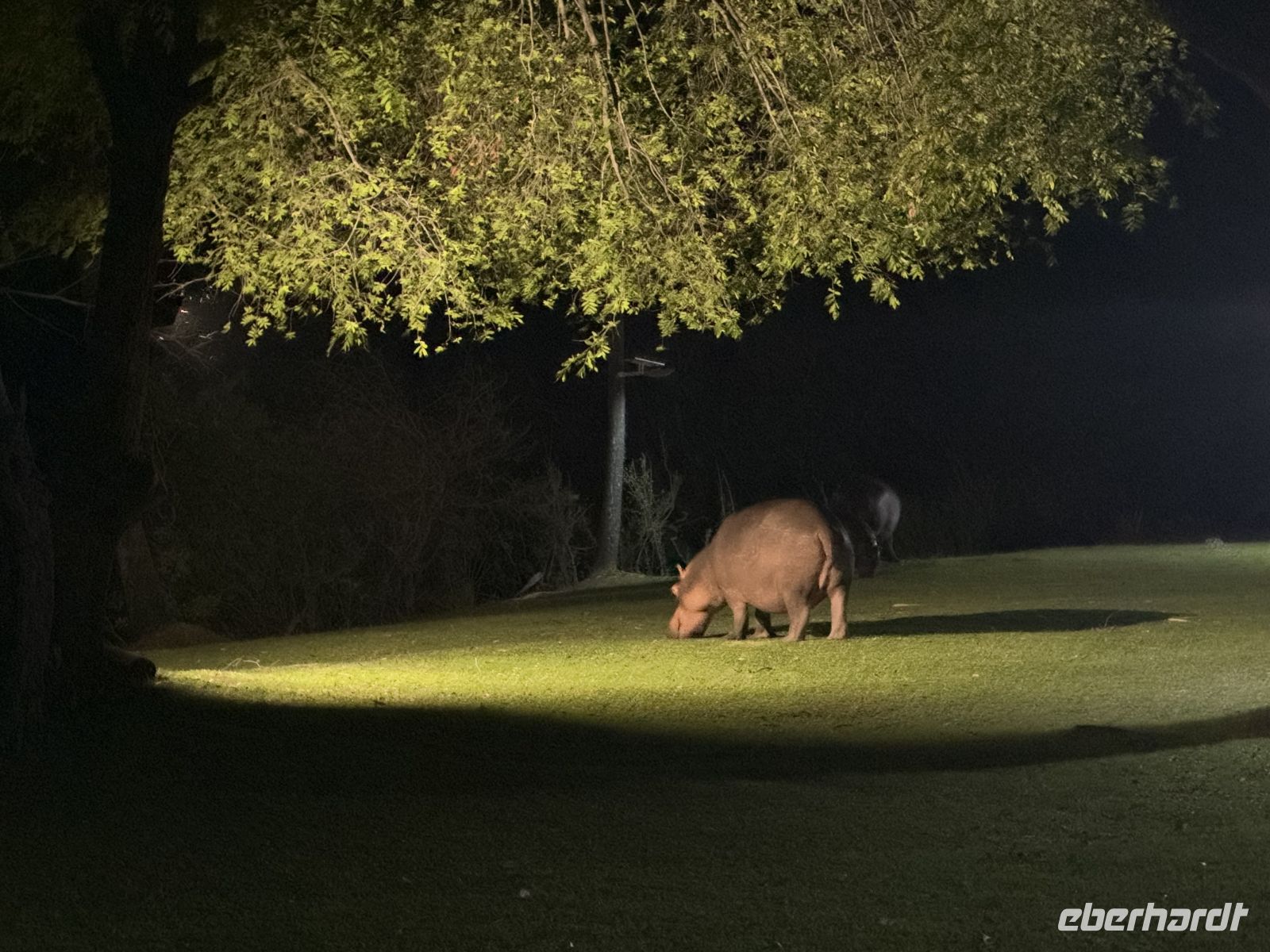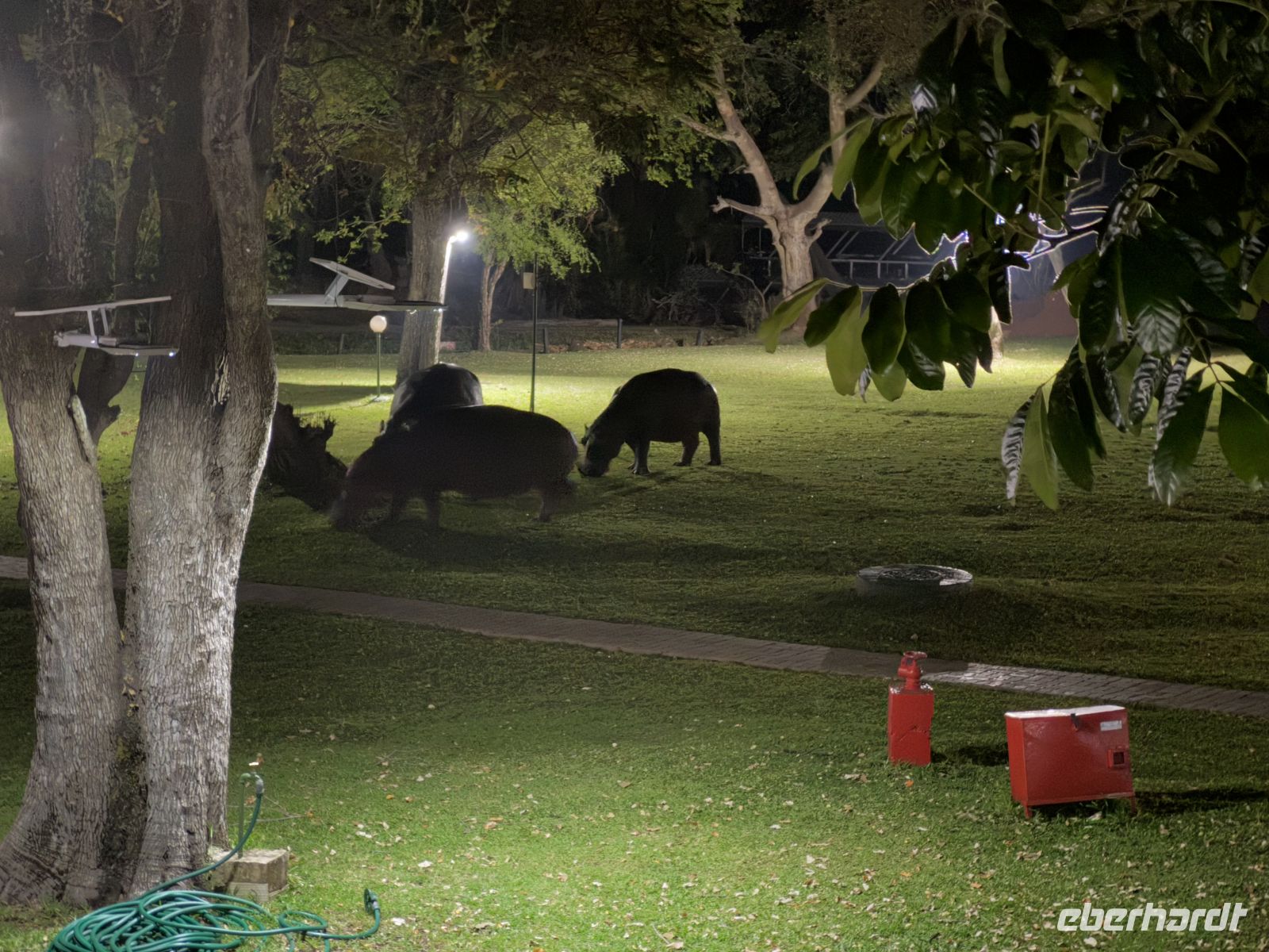 Wir stoßen nochmal an, reden, essen und lachen. Plötzlich kommt Bewegung in die Runde. Im Garten stehen Hippos. Was? Im Hotelgarten? 20 Meter entfernt? Aber ja, das stimmt. Auf wirklich kurze Distanz sehen wir 2 Nilpferddamen, dick und rund und kurzbeinig auf der Wiese.