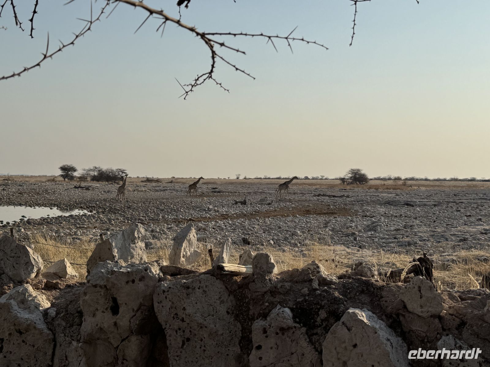 Bei uns ist es später Nachtmittag und es ist warm. Sehr warm sogar. Das Thermometer zeigt noch 30 Grad und das um 17 Uhr. Und außer einer Gruppe Giraffen und einem Schakal ist es wohl auch dem Rest der Tiere zu warm. Am Horizont eine Herde Zebras und ein einzelnes Gnu welches gemütlich seine Runde dreht. Dafür singen die Vögel mehrstimmig und die Grillen zirpen dazu. Wir sitzen gemütlich und völlig entspannt im Schatten mit Blick auf die Wasserstelle und genießen diese Stimmung.