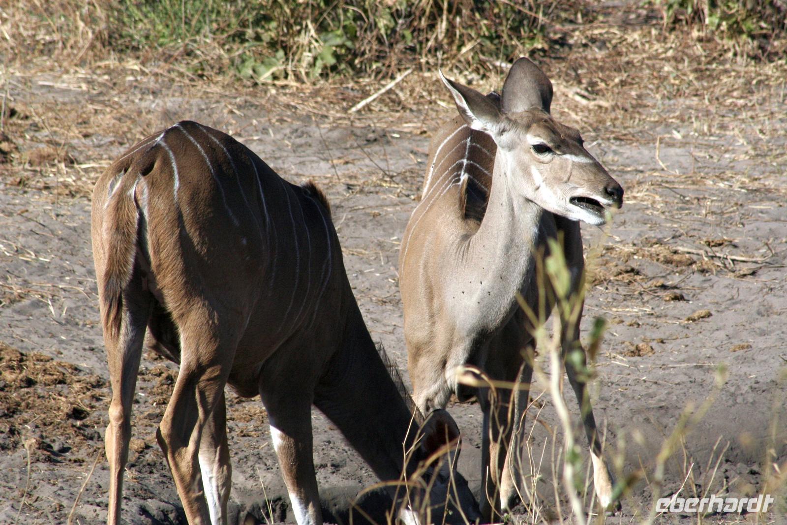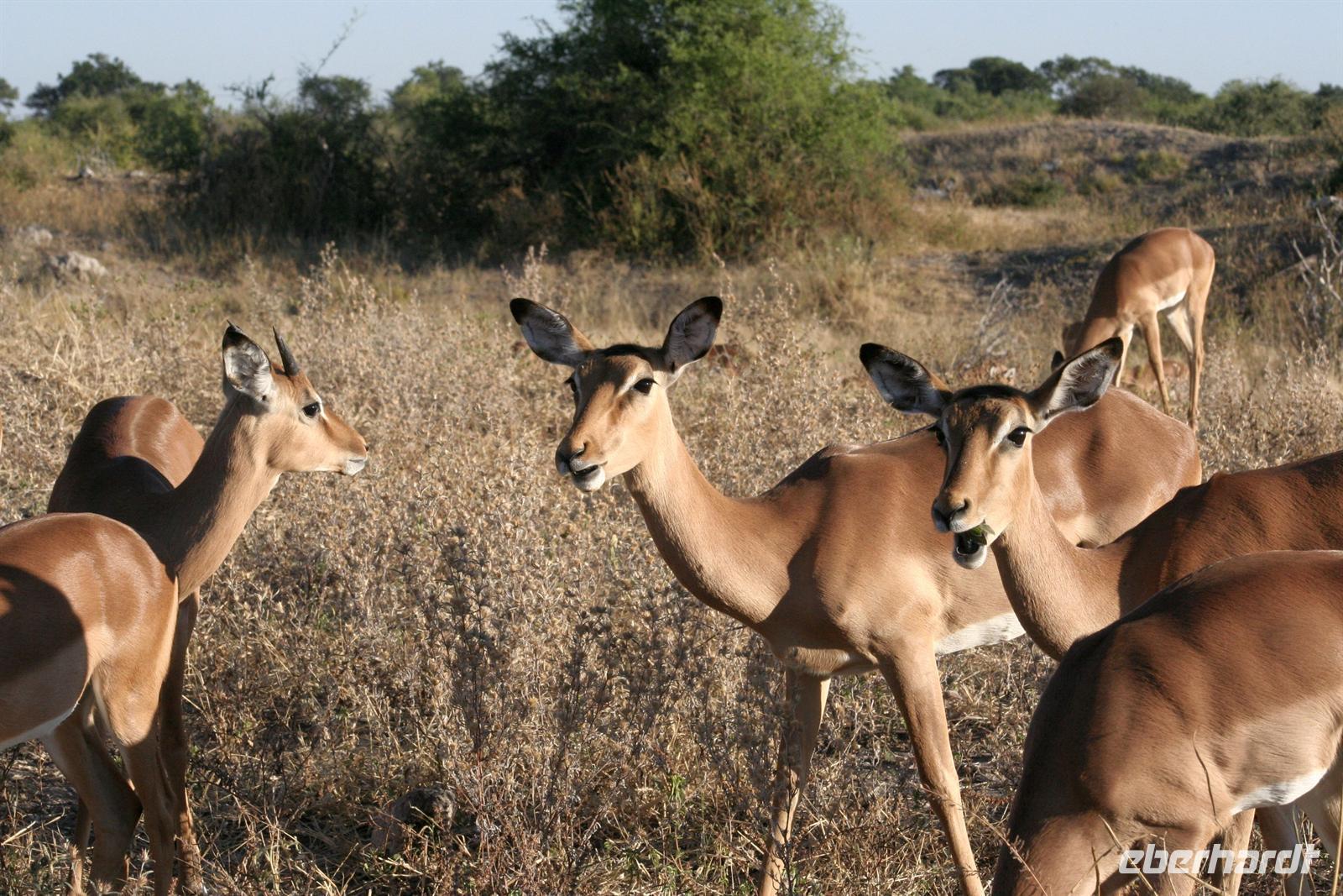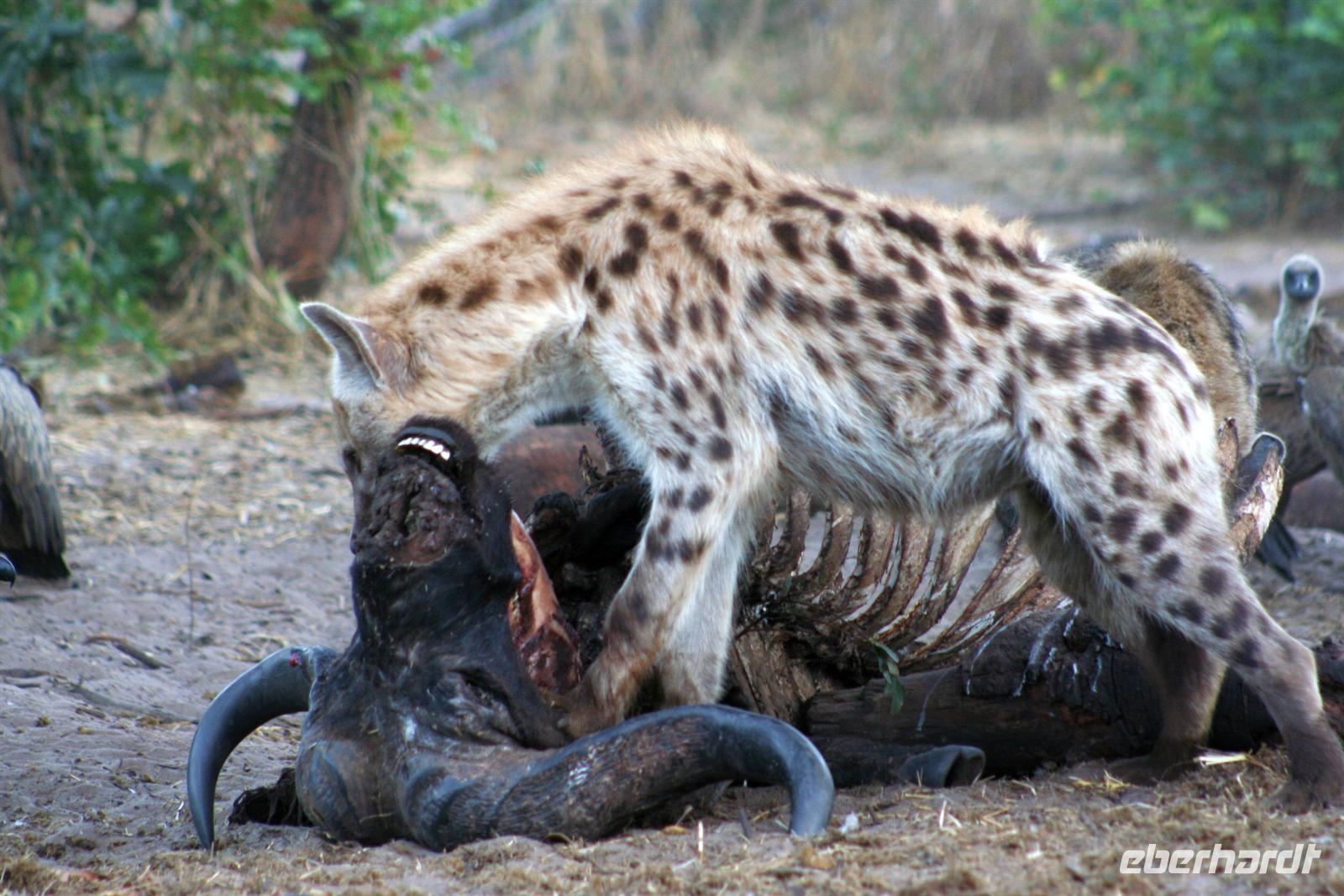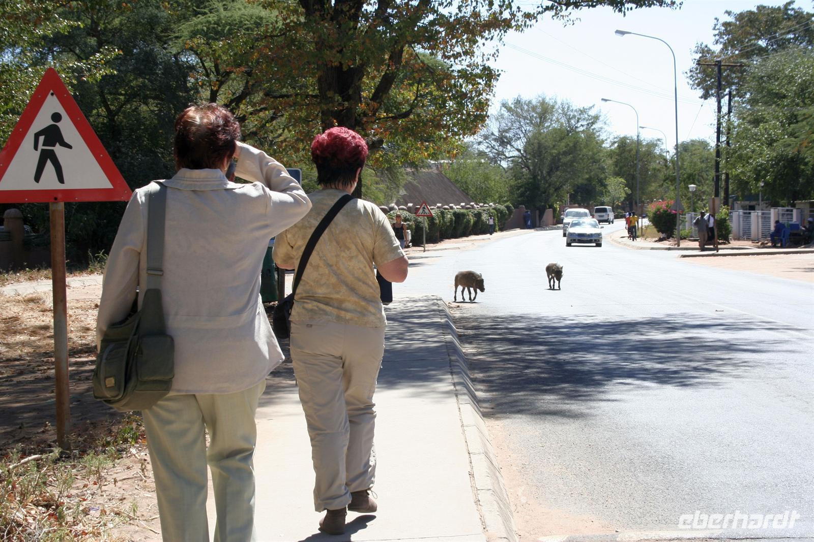 Die Teerstraße nach Kasane führt direkt durch den Chobe NP. Zunächst begrüßten uns nur auf Warnschildern Elefanten, wir sahen nur einige Giraffen und Hornraben. Bald erreichten wir die komfortable, wunderschöne "Chobe Safari Lodge" in Kasane, direkt am Ufer des gewaltigen Chobe Flusses gelegen. Hier war alles vorhanden: Poollandschaft, Restaurant, Bar, eigene Schiffsanlegestelle, Shops und und.... In den gepflegten Grünanlagen begrüßten uns einzelne Meerkatzen und Warzenschweine grasten friedlich auf der Wiese. Am Ufer, vor den Flusschalets weckten diverse Warnschilder unser Interesse: Vorsicht Krokodile! Also gingen wir äußerst aufmerksam am Flussufer entlang. Das Abendessen genossen wir in vollen Zügen: ein riesiges Buffet mit Schauküche, Grill und allen erdenklichen Köstlichkeiten erwartete uns. Noch vor Morgengrauen waren wir am nächsten Tag bereit, um auf spannende Jeep-Safari in den Chobe NPaufzubrechen. Ein spannendes Gefühl im Dunklen die geheimnisvollen Geräusche des afrikanischen Busches zu deuten, aus dem Dickicht blitzten uns scheu die Augen von Impalas an. Später beobachten wir Hyänen beim Frühstück.