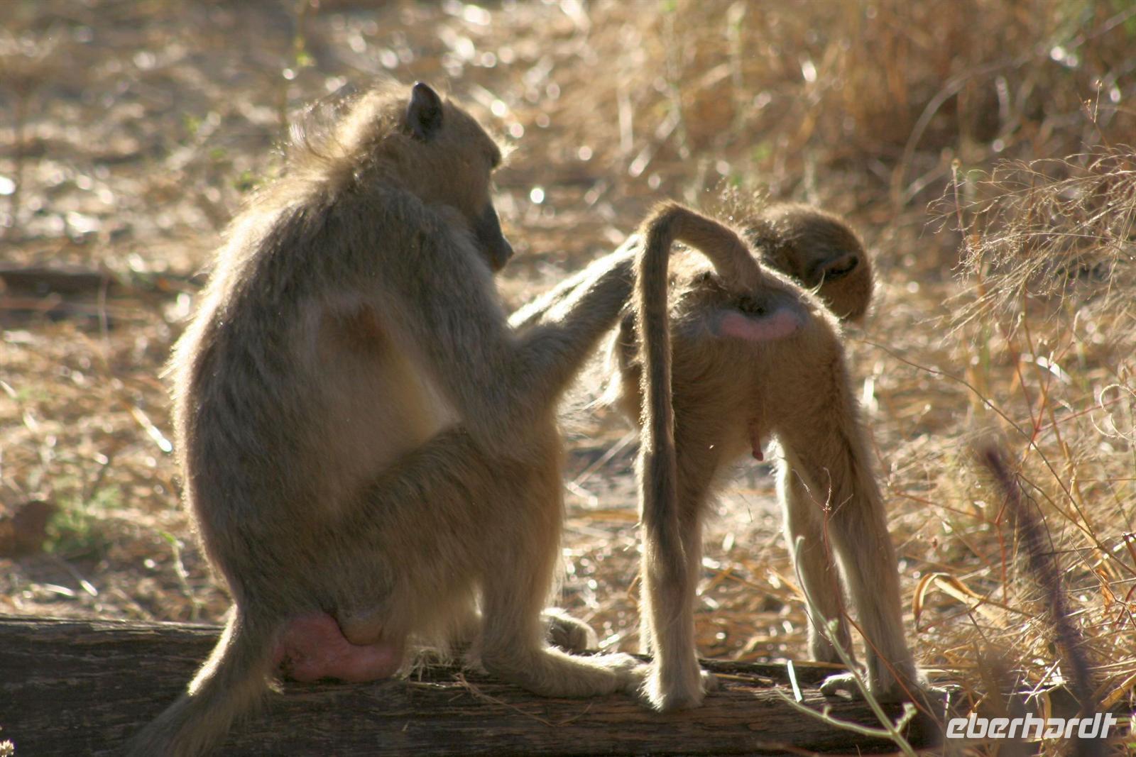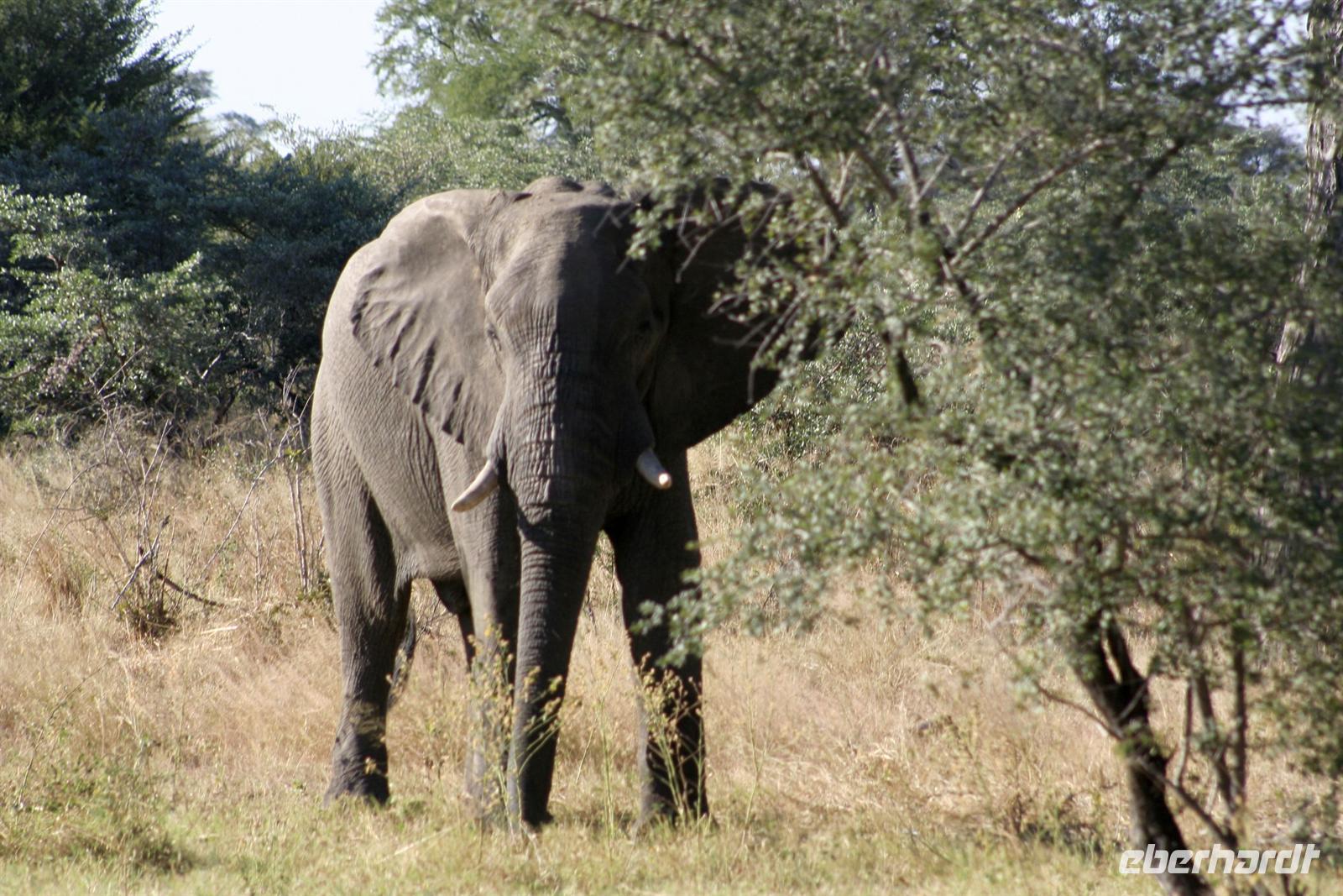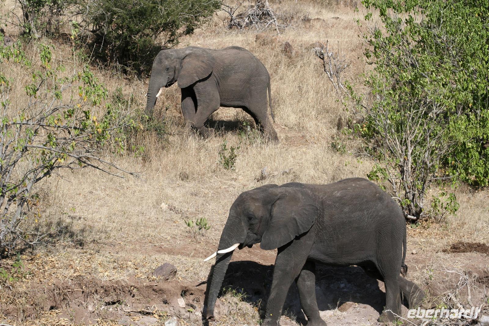 Die Teerstraße nach Kasane führt direkt durch den Chobe NP. Zunächst begrüßten uns nur auf Warnschildern Elefanten, wir sahen nur einige Giraffen und Hornraben. Bald erreichten wir die komfortable, wunderschöne "Chobe Safari Lodge" in Kasane, direkt am Ufer des gewaltigen Chobe Flusses gelegen. Hier war alles vorhanden: Poollandschaft, Restaurant, Bar, eigene Schiffsanlegestelle, Shops und und.... In den gepflegten Grünanlagen begrüßten uns einzelne Meerkatzen und Warzenschweine grasten friedlich auf der Wiese. Am Ufer, vor den Flusschalets weckten diverse Warnschilder unser Interesse: Vorsicht Krokodile! Also gingen wir äußerst aufmerksam am Flussufer entlang. Das Abendessen genossen wir in vollen Zügen: ein riesiges Buffet mit Schauküche, Grill und allen erdenklichen Köstlichkeiten erwartete uns. Noch vor Morgengrauen waren wir am nächsten Tag bereit, um auf spannende Jeep-Safari in den Chobe NPaufzubrechen. Ein spannendes Gefühl im Dunklen die geheimnisvollen Geräusche des afrikanischen Busches zu deuten, aus dem Dickicht blitzten uns scheu die Augen von Impalas an. Später beobachten wir Hyänen beim Frühstück.