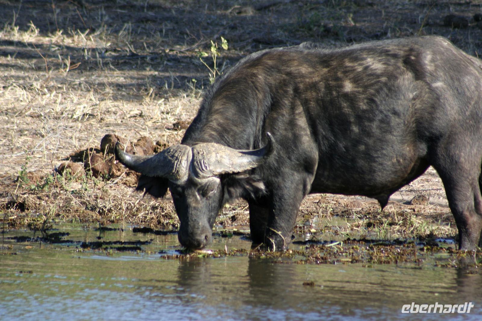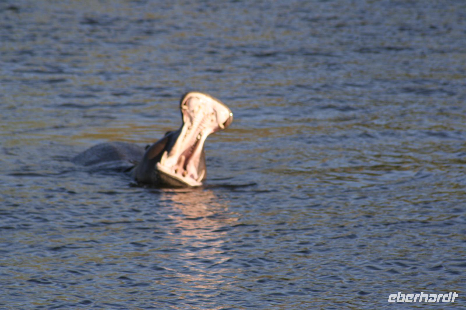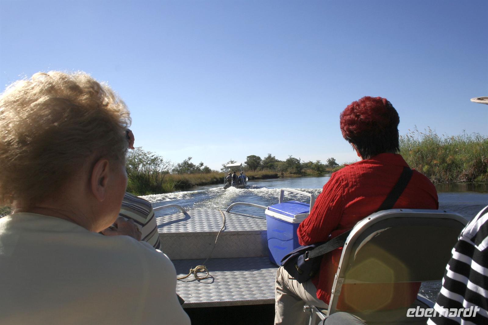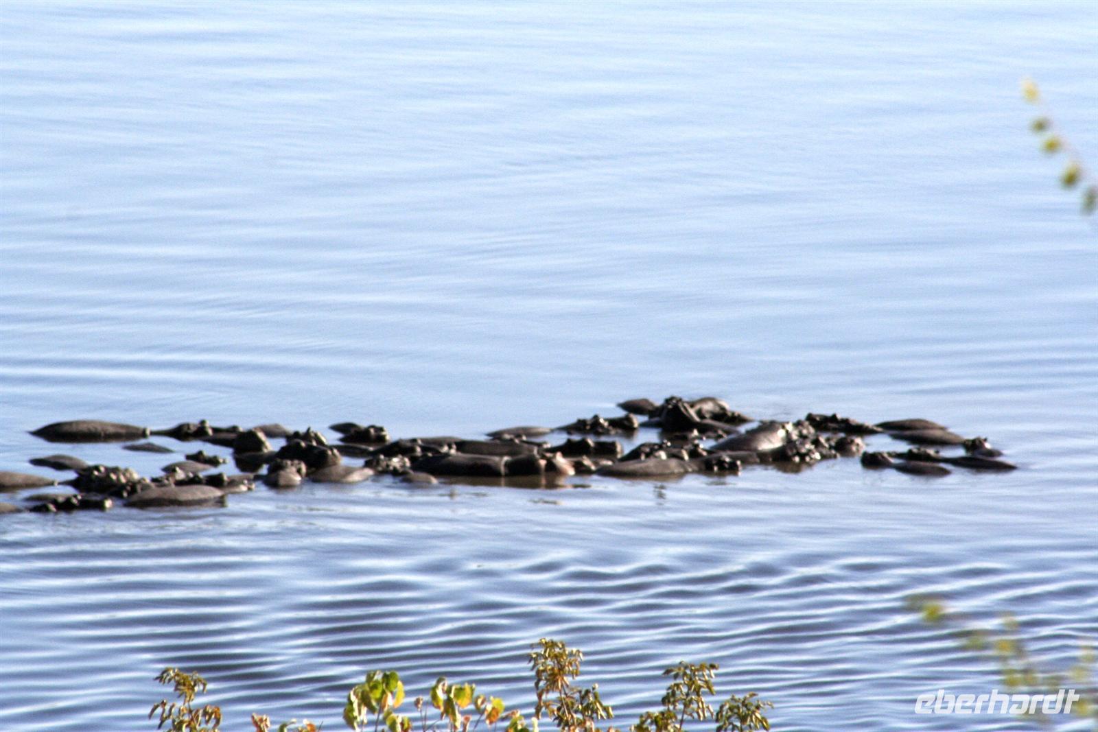 Es gab Büffel, dessen Unterkiefer sich trotz der gruseligen Szenerie zu einem Lächeln öffnete. Eine Horde Geier versammelte sich bereits in der Nähe und wartete auf den Rest des Hyänenfrühstücks. Später schlürften wir unseren warmen Kaffee oder Tee, während ein Büffel gemütlich vor uns graste. Eine Staubwolke kündigte nun das Eintreffen einer riesigen Büffelherde an. Und weiter gings, uns hatte das Jagdfieber gepackt. Überall sahen wir Elefantenspuren, doch die Dickhäuter schienen "ausgestorben" zu sein. Wir sahen Giraffen, Impalas, eine Herde Flusspferde im Chobe, Warzenschweine, Affen, Zebramangusten, Kudus, "bunte" Vögel und zum Schluss doch noch eine Elefantenherde mit Jungtieren, keine 3 m von uns entfernt. Auch auf der Rückfahrt zur Lodge begegnete uns eine weitere Elefantenherde, die die Strasse in Kasane überquerte. Zurück in der Lodge genossen wir das späte Frühstück. Alles war noch ausreichend da und so machten wir aus dem eigentlichen Frühstück einen Brunch. Über die heiße Mittagszeit war relaxen angesagt. Einige bummelten mit mir durch Kasane, die Hauptstraße hoch und wieder runter, stöberten in den Geschäften und im Supermarkt. Vor der 7-Tage-Adventistenkirche bildete sich ein Menschenauflauf, weil das Juliäum des Chores gefeiert wurde. Am Nachmittag gings dann mit dem Boot auf Pirschfahrt.