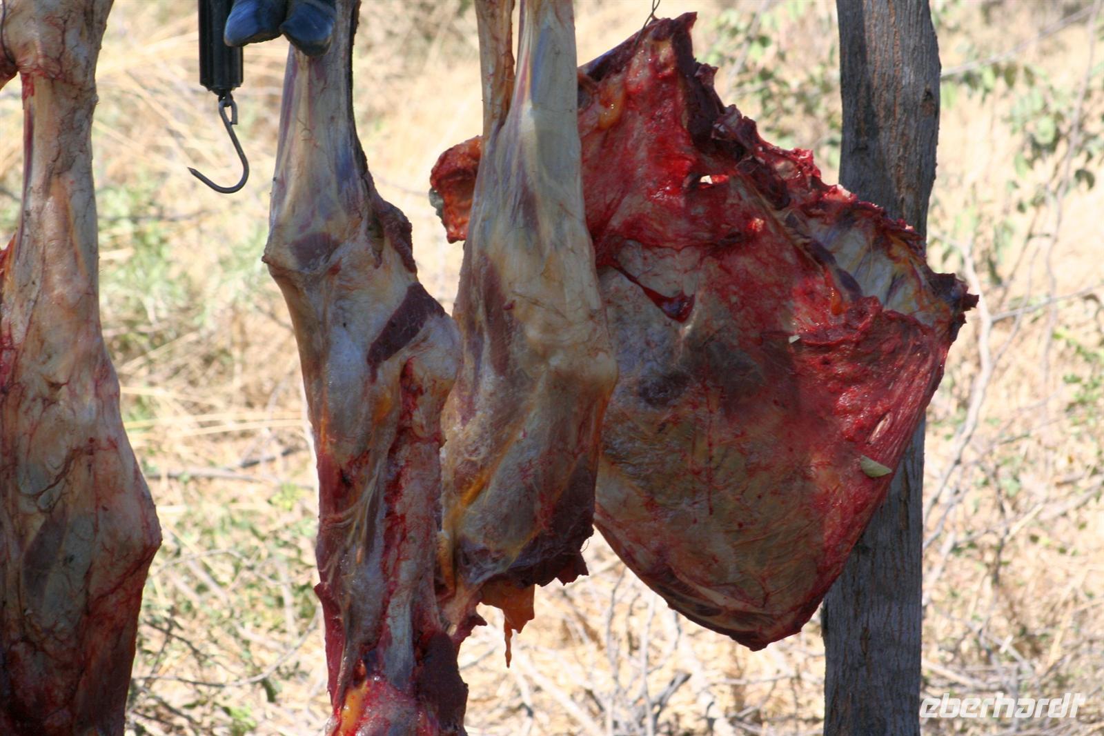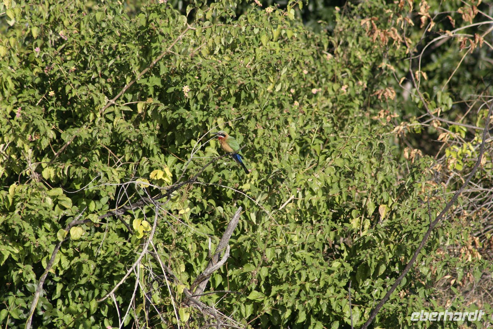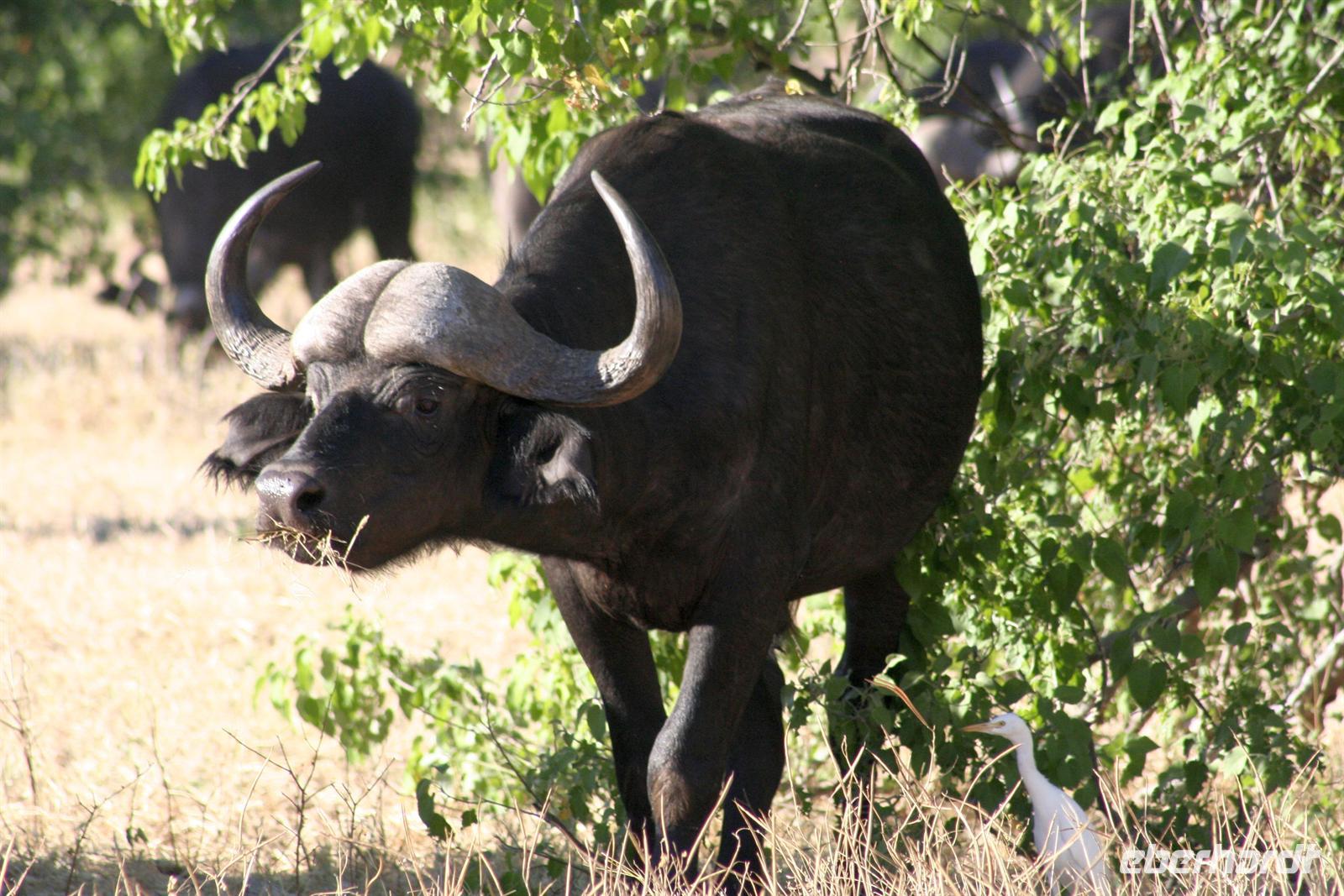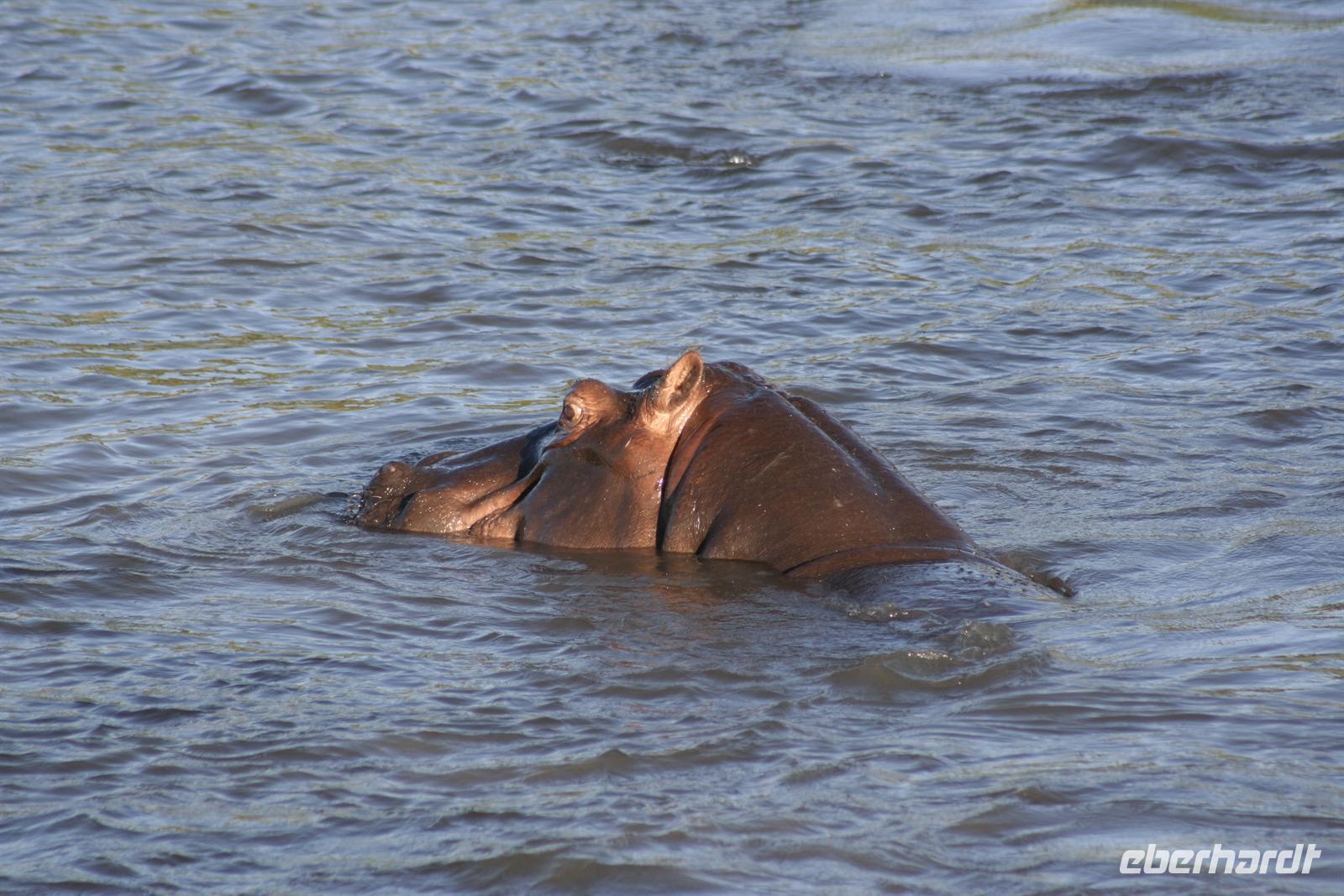 Es gab Büffel, dessen Unterkiefer sich trotz der gruseligen Szenerie zu einem Lächeln öffnete. Eine Horde Geier versammelte sich bereits in der Nähe und wartete auf den Rest des Hyänenfrühstücks. Später schlürften wir unseren warmen Kaffee oder Tee, während ein Büffel gemütlich vor uns graste. Eine Staubwolke kündigte nun das Eintreffen einer riesigen Büffelherde an. Und weiter gings, uns hatte das Jagdfieber gepackt. Überall sahen wir Elefantenspuren, doch die Dickhäuter schienen "ausgestorben" zu sein. Wir sahen Giraffen, Impalas, eine Herde Flusspferde im Chobe, Warzenschweine, Affen, Zebramangusten, Kudus, "bunte" Vögel und zum Schluss doch noch eine Elefantenherde mit Jungtieren, keine 3 m von uns entfernt. Auch auf der Rückfahrt zur Lodge begegnete uns eine weitere Elefantenherde, die die Strasse in Kasane überquerte. Zurück in der Lodge genossen wir das späte Frühstück. Alles war noch ausreichend da und so machten wir aus dem eigentlichen Frühstück einen Brunch. Über die heiße Mittagszeit war relaxen angesagt. Einige bummelten mit mir durch Kasane, die Hauptstraße hoch und wieder runter, stöberten in den Geschäften und im Supermarkt. Vor der 7-Tage-Adventistenkirche bildete sich ein Menschenauflauf, weil das Juliäum des Chores gefeiert wurde. Am Nachmittag gings dann mit dem Boot auf Pirschfahrt.
