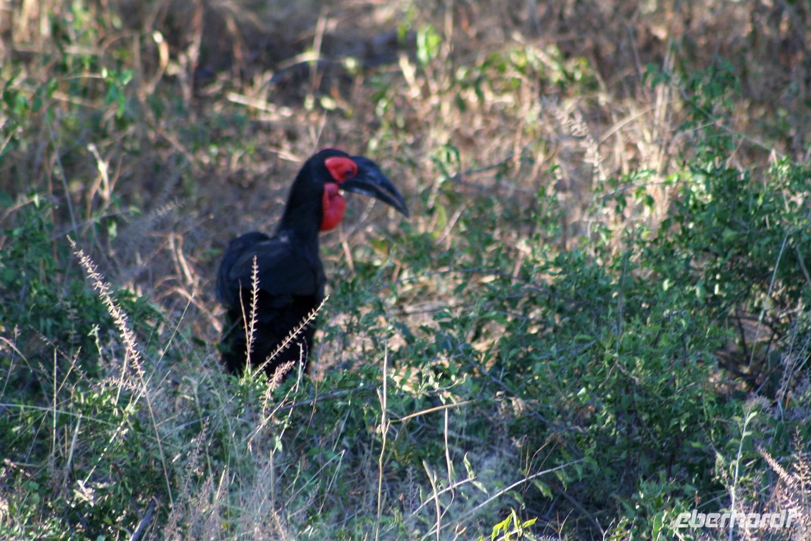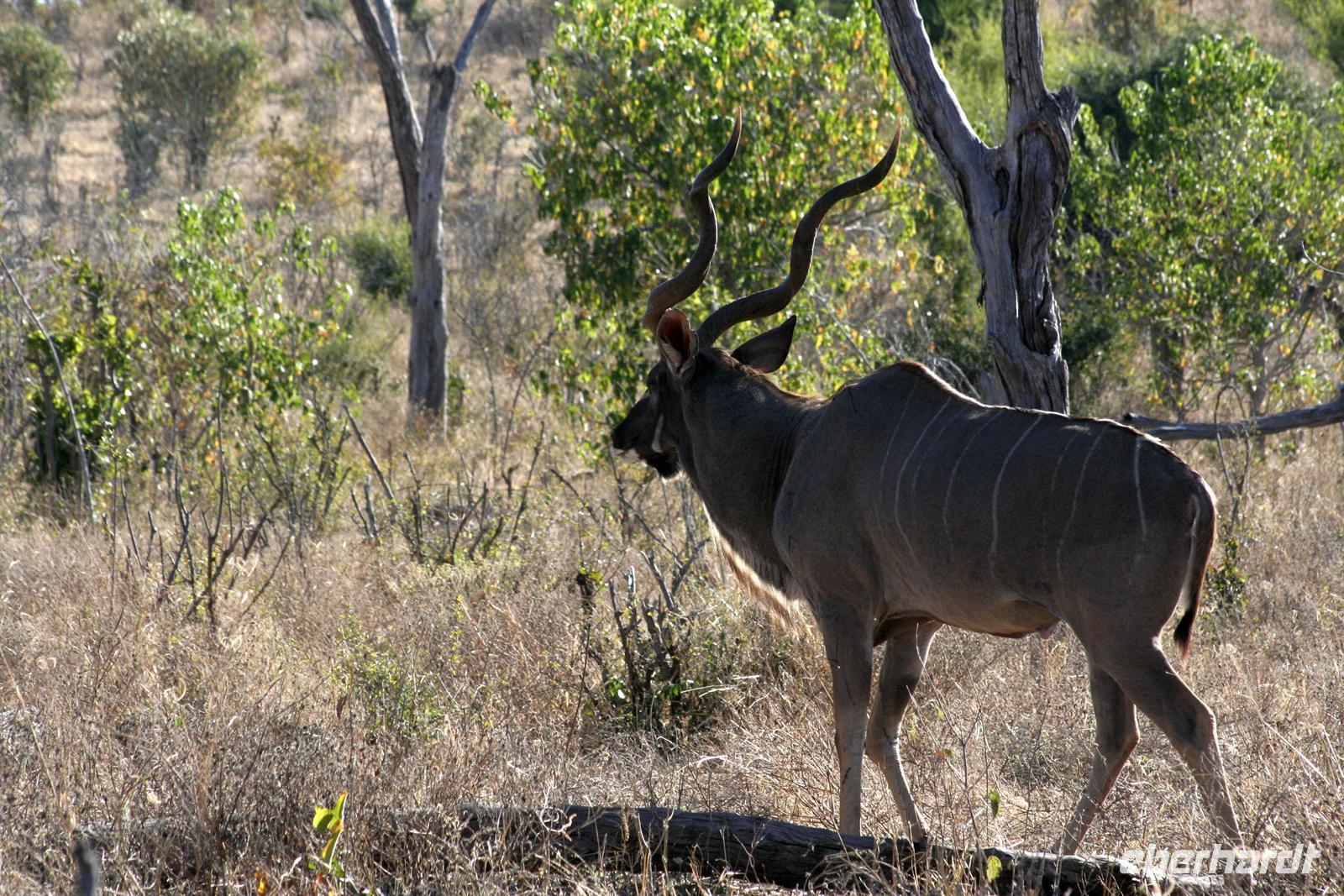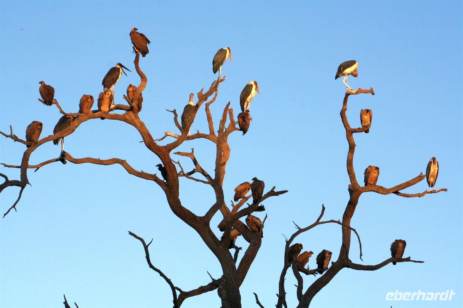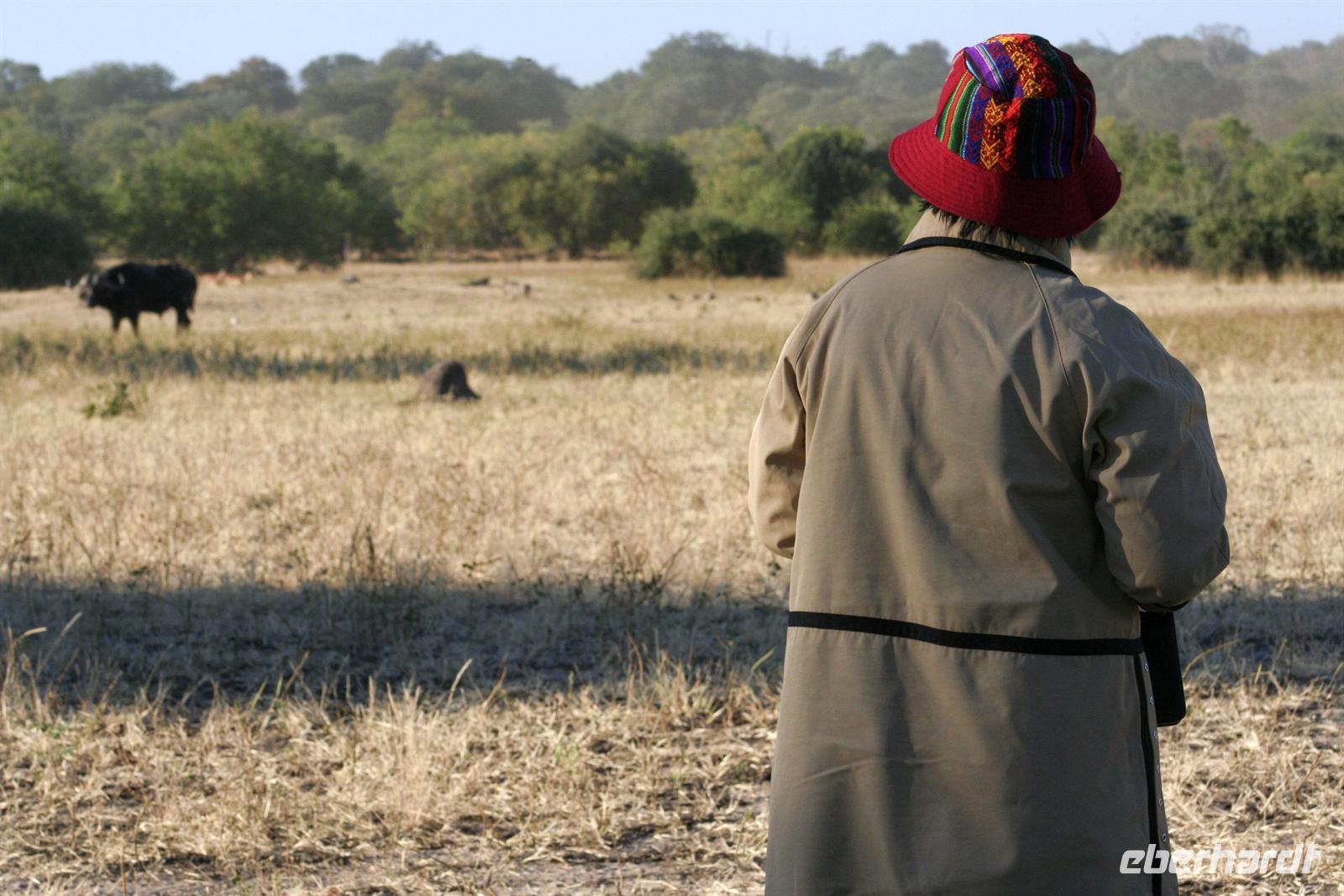 Es gab Büffel, dessen Unterkiefer sich trotz der gruseligen Szenerie zu einem Lächeln öffnete. Eine Horde Geier versammelte sich bereits in der Nähe und wartete auf den Rest des Hyänenfrühstücks. Später schlürften wir unseren warmen Kaffee oder Tee, während ein Büffel gemütlich vor uns graste. Eine Staubwolke kündigte nun das Eintreffen einer riesigen Büffelherde an. Und weiter gings, uns hatte das Jagdfieber gepackt. Überall sahen wir Elefantenspuren, doch die Dickhäuter schienen "ausgestorben" zu sein. Wir sahen Giraffen, Impalas, eine Herde Flusspferde im Chobe, Warzenschweine, Affen, Zebramangusten, Kudus, "bunte" Vögel und zum Schluss doch noch eine Elefantenherde mit Jungtieren, keine 3 m von uns entfernt. Auch auf der Rückfahrt zur Lodge begegnete uns eine weitere Elefantenherde, die die Strasse in Kasane überquerte. Zurück in der Lodge genossen wir das späte Frühstück. Alles war noch ausreichend da und so machten wir aus dem eigentlichen Frühstück einen Brunch. Über die heiße Mittagszeit war relaxen angesagt. Einige bummelten mit mir durch Kasane, die Hauptstraße hoch und wieder runter, stöberten in den Geschäften und im Supermarkt. Vor der 7-Tage-Adventistenkirche bildete sich ein Menschenauflauf, weil das Juliäum des Chores gefeiert wurde. Am Nachmittag gings dann mit dem Boot auf Pirschfahrt.