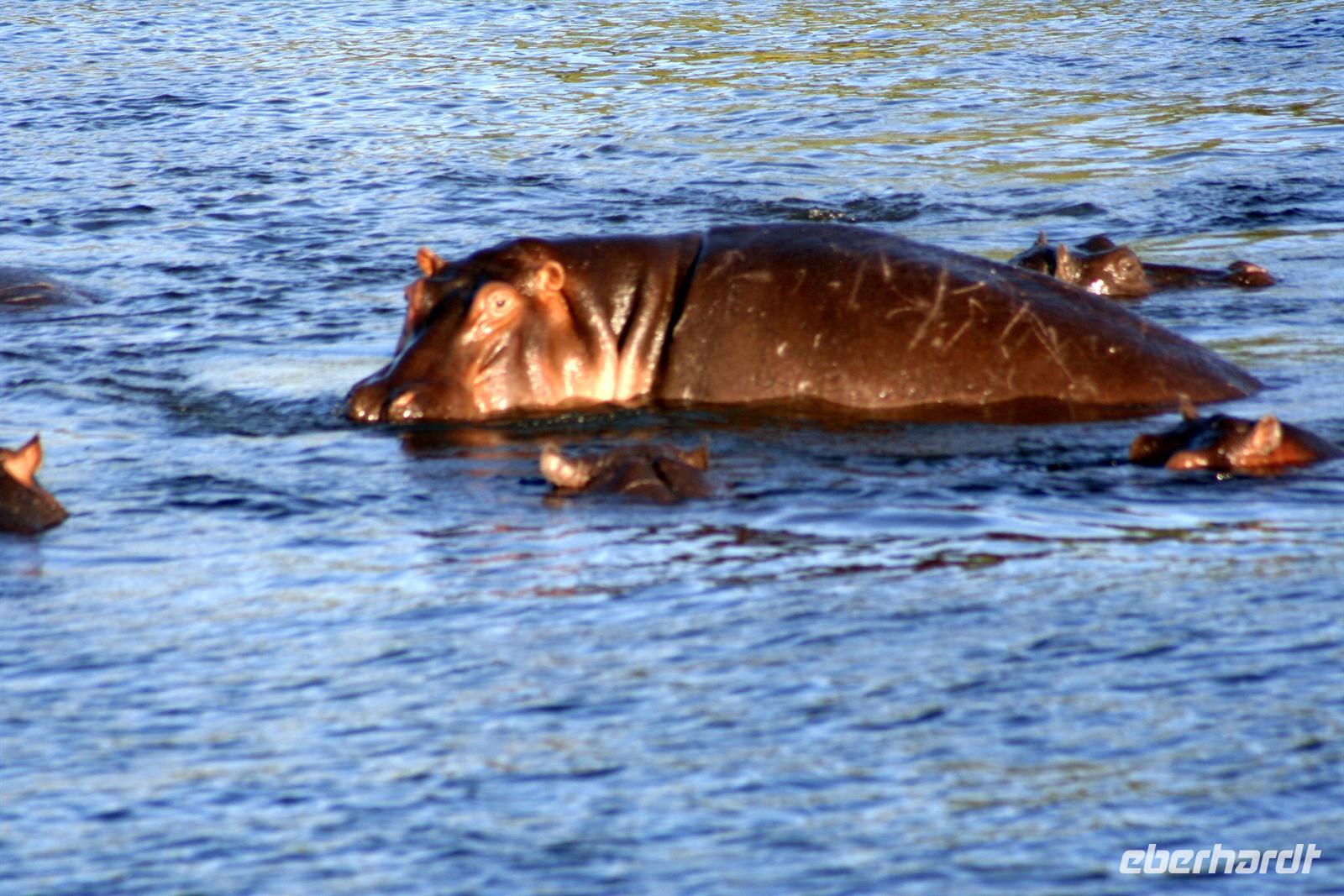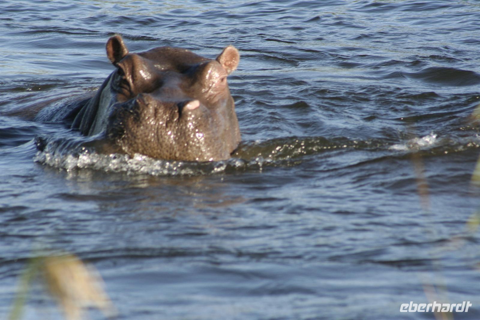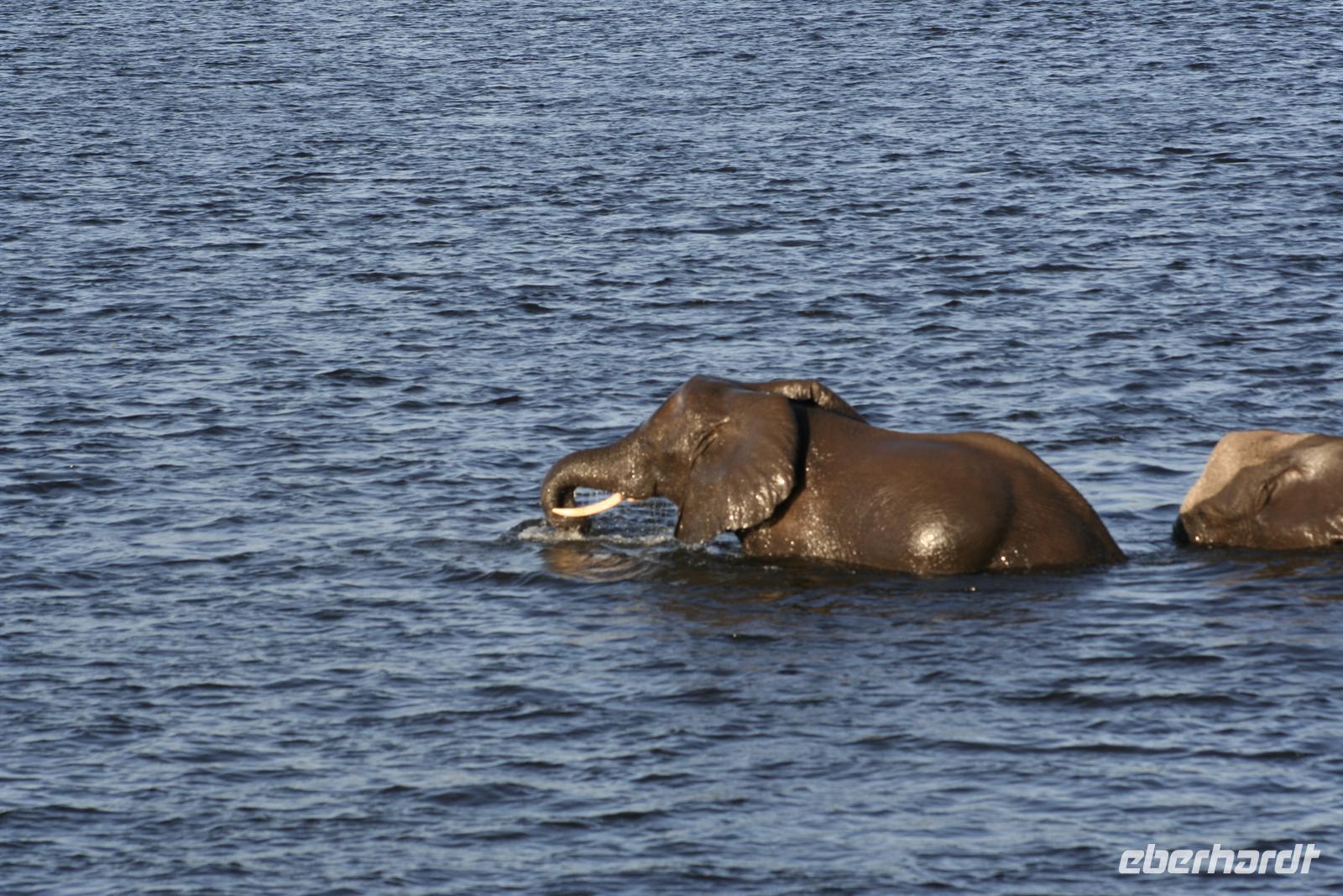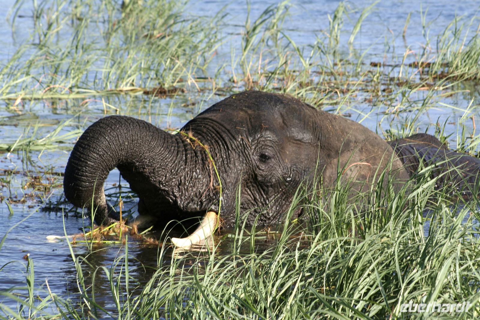 Neben unzähligen Elefanten und Flusspferden wimmelte es auch von Booten, aber der Chobe ist so groß, dass kein Gedränge entstand und jeder zu seinem Schnappschuss kam. In der Mitte des Flusses entdeckten wir eine Elefantengruppe, die bauchhoch im Wasser graste. Natürlich fuhren wir hin, mußten aber immer wieder auf die gefährlichen Flusspferde achten, die man nicht so schnell im Wasser sieht. Auf 3 m waren wir dann an den grauen Riesen dran, die sich ganz ungestört von uns beobachten liessen.