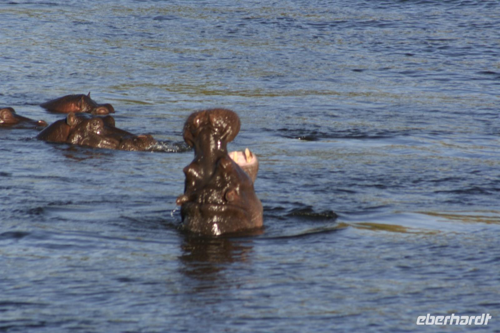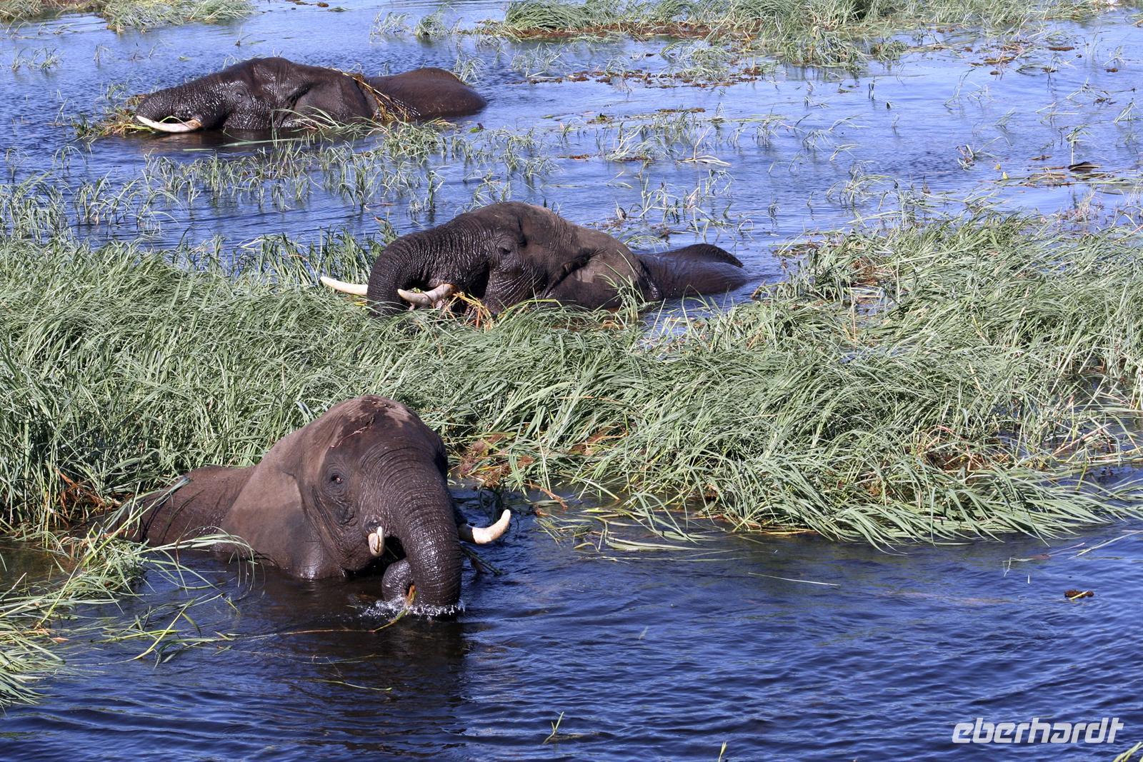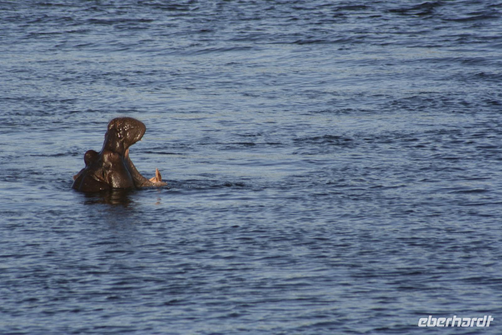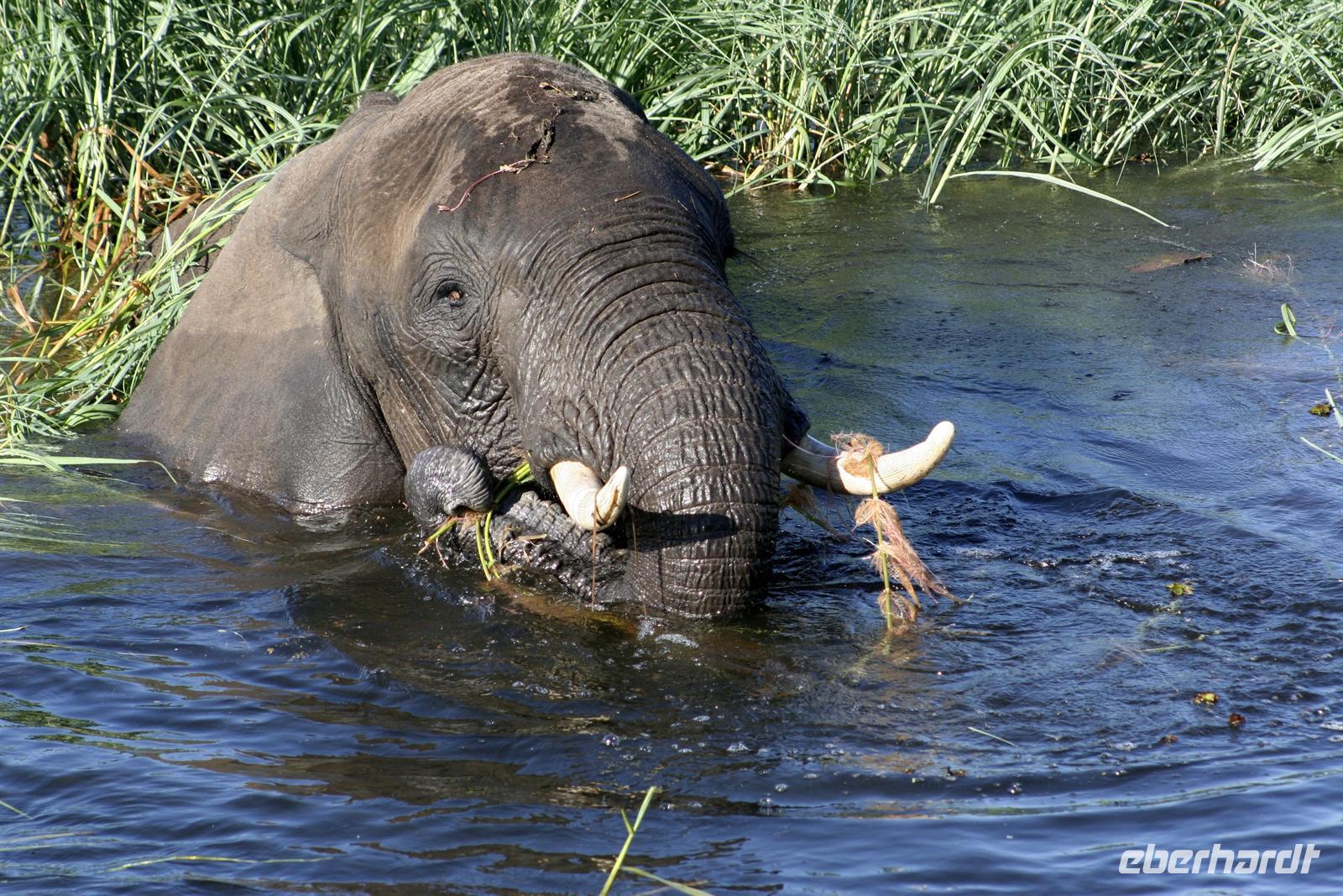Neben unzähligen Elefanten und Flusspferden wimmelte es auch von Booten, aber der Chobe ist so groß, dass kein Gedränge entstand und jeder zu seinem Schnappschuss kam. In der Mitte des Flusses entdeckten wir eine Elefantengruppe, die bauchhoch im Wasser graste. Natürlich fuhren wir hin, mußten aber immer wieder auf die gefährlichen Flusspferde achten, die man nicht so schnell im Wasser sieht. Auf 3 m waren wir dann an den grauen Riesen dran, die sich ganz ungestört von uns beobachten liessen.