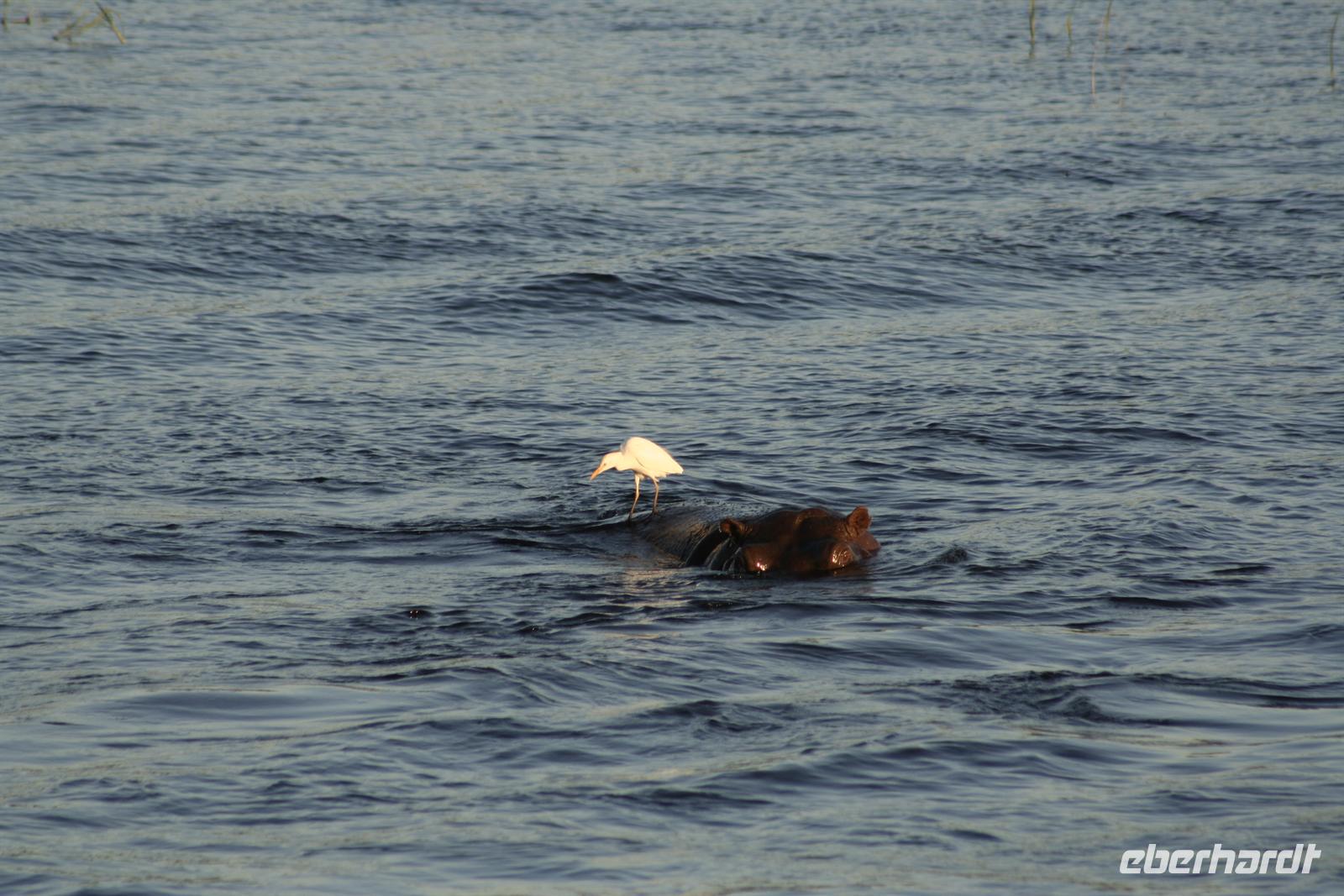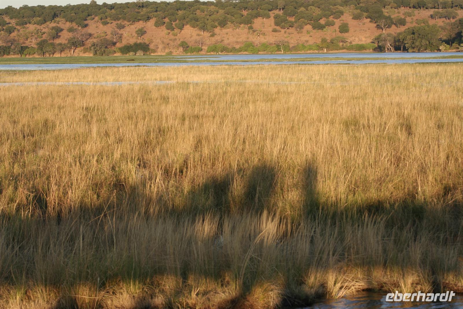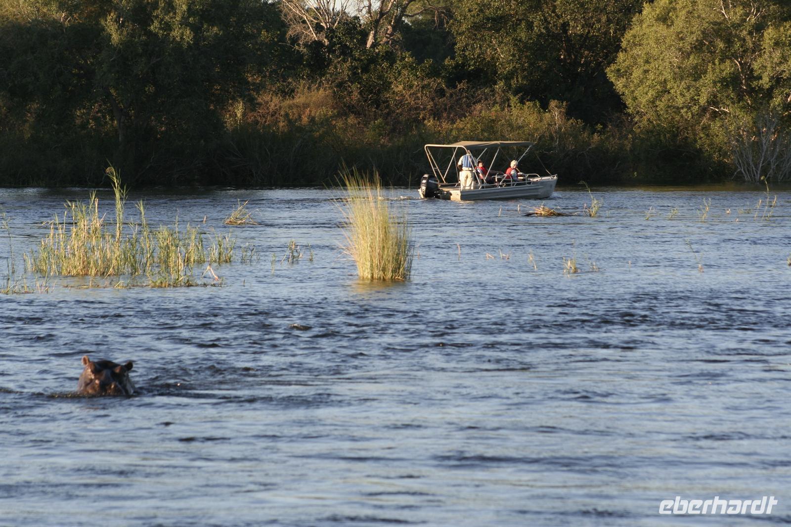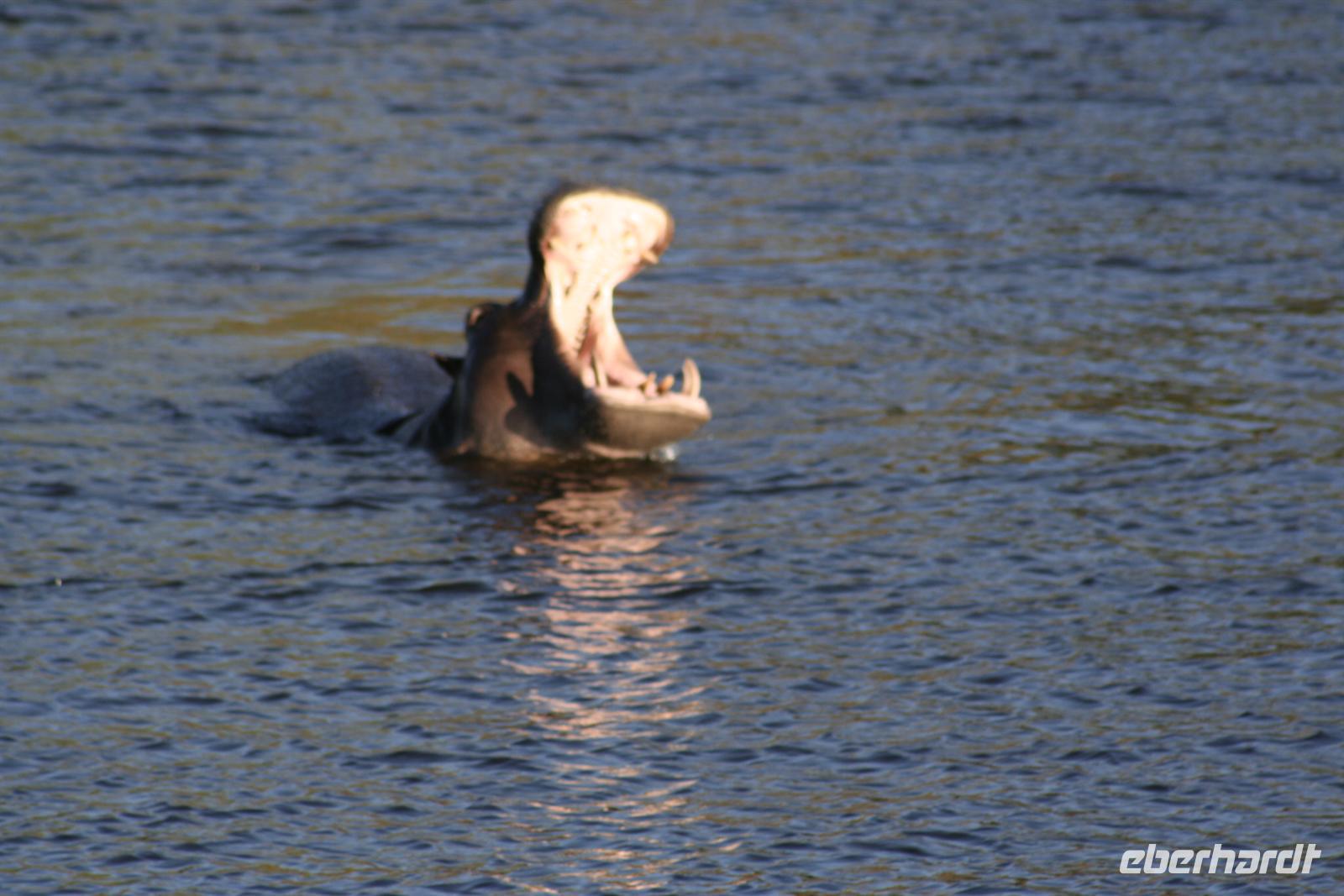 Neben unzähligen Elefanten und Flusspferden wimmelte es auch von Booten, aber der Chobe ist so groß, dass kein Gedränge entstand und jeder zu seinem Schnappschuss kam. In der Mitte des Flusses entdeckten wir eine Elefantengruppe, die bauchhoch im Wasser graste. Natürlich fuhren wir hin, mußten aber immer wieder auf die gefährlichen Flusspferde achten, die man nicht so schnell im Wasser sieht. Auf 3 m waren wir dann an den grauen Riesen dran, die sich ganz ungestört von uns beobachten liessen.