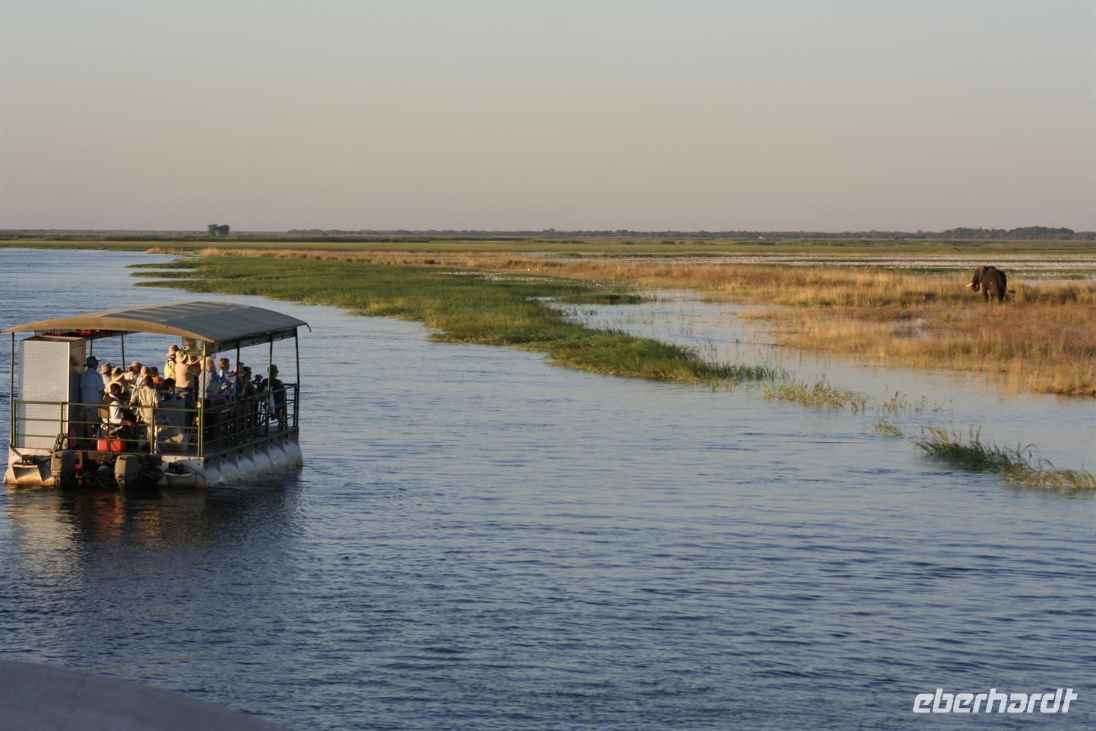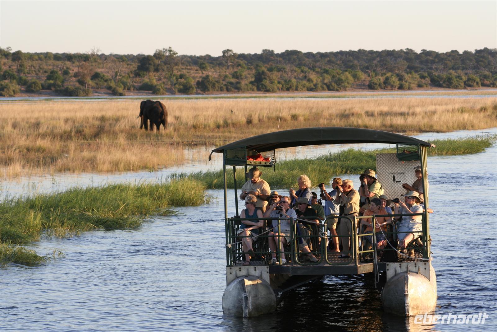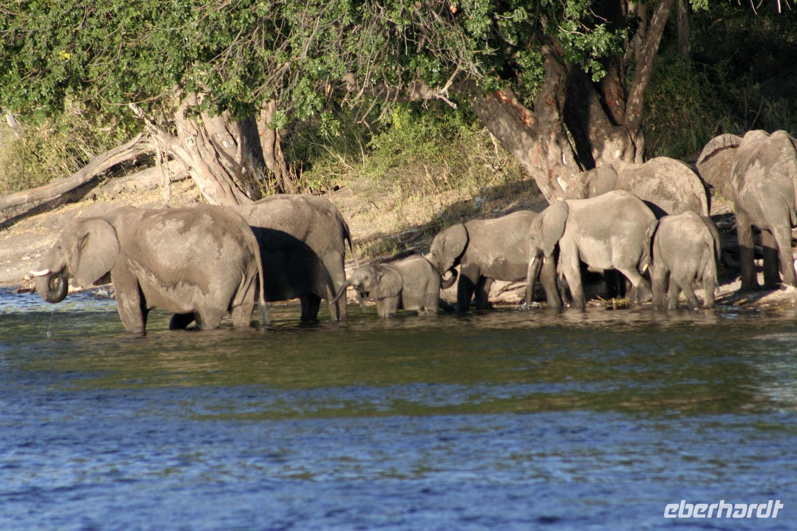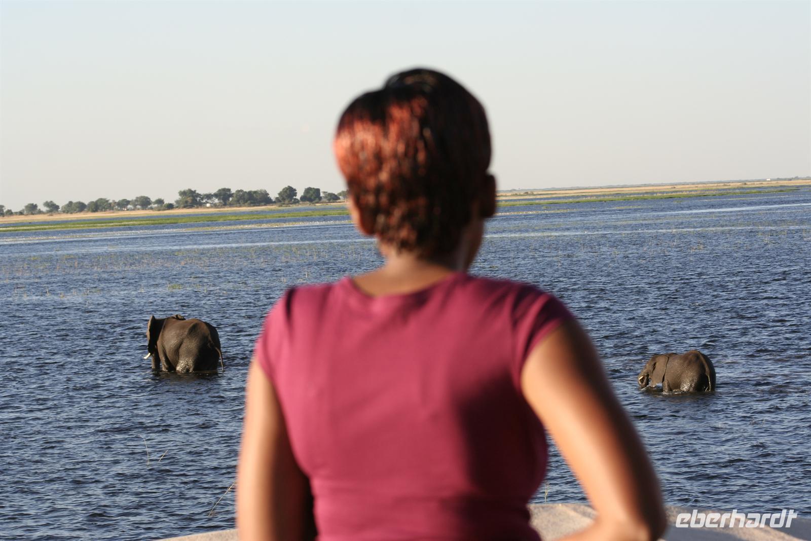 In unserem geräumigen Boot und kühlen Getränken an Bord schipperten wir gemütlich den Chobe entlang. Ganz nah beobachteten wir Wasserwarane und Krokodile am Ufer. In den Lüften schwebte ein Fish Eagle. Bald darauf wurde es noch "tierischer": Elefantenherden, Kudus, Büffel, Wasserböcke kamen am späten Nachmittag zum Fluss, um zu trinken. Elefantenherden mit "Babyfanten" schwammen durch den Fluss zur Insel, um noch saftigeres Grün zu naschen. Die gefühlten 398 Elefanten, die wir nun sahen, entschädigten die magere Ausbeute am Morgen.