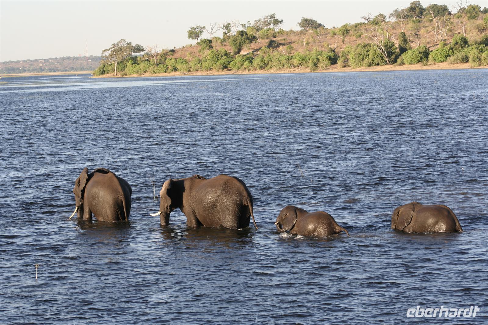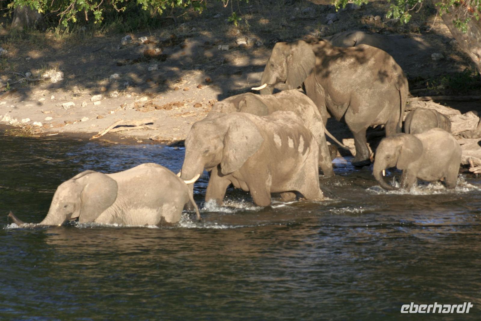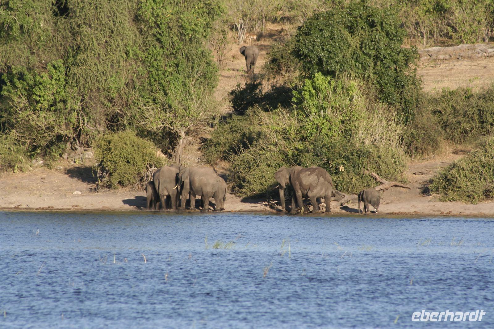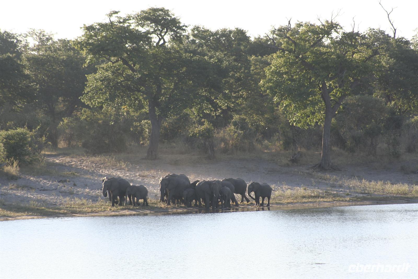 In unserem geräumigen Boot und kühlen Getränken an Bord schipperten wir gemütlich den Chobe entlang. Ganz nah beobachteten wir Wasserwarane und Krokodile am Ufer. In den Lüften schwebte ein Fish Eagle. Bald darauf wurde es noch "tierischer": Elefantenherden, Kudus, Büffel, Wasserböcke kamen am späten Nachmittag zum Fluss, um zu trinken. Elefantenherden mit "Babyfanten" schwammen durch den Fluss zur Insel, um noch saftigeres Grün zu naschen. Die gefühlten 398 Elefanten, die wir nun sahen, entschädigten die magere Ausbeute am Morgen.