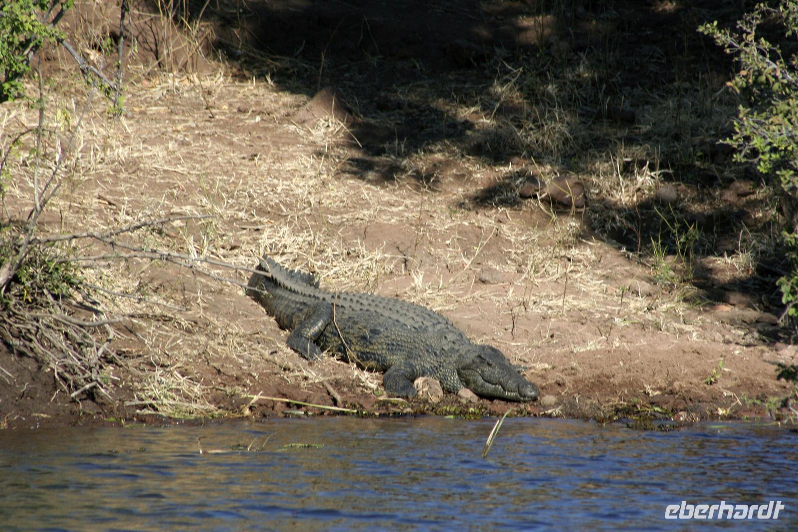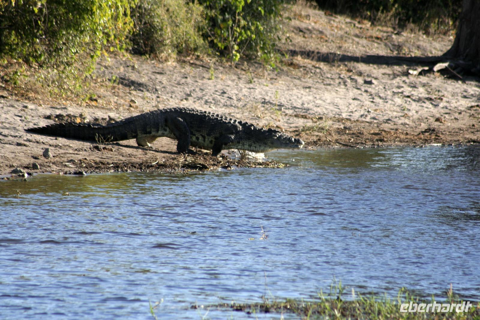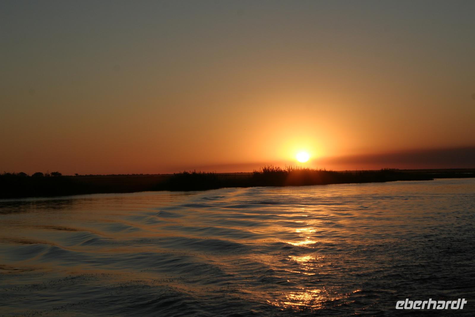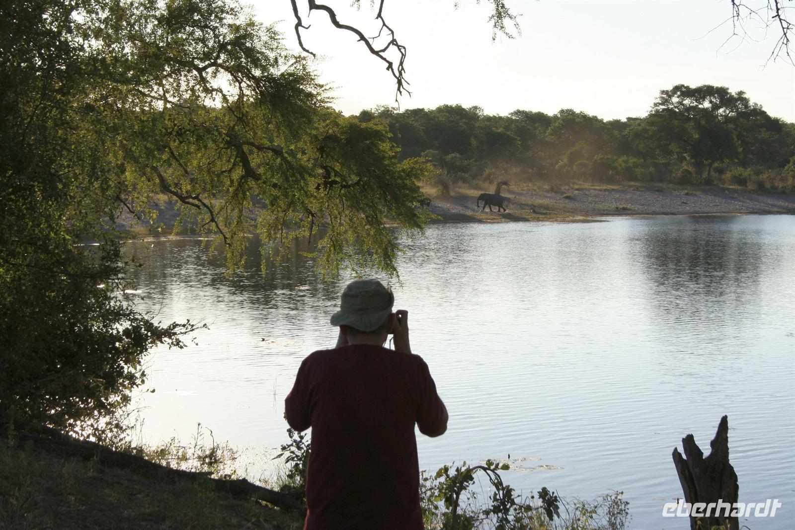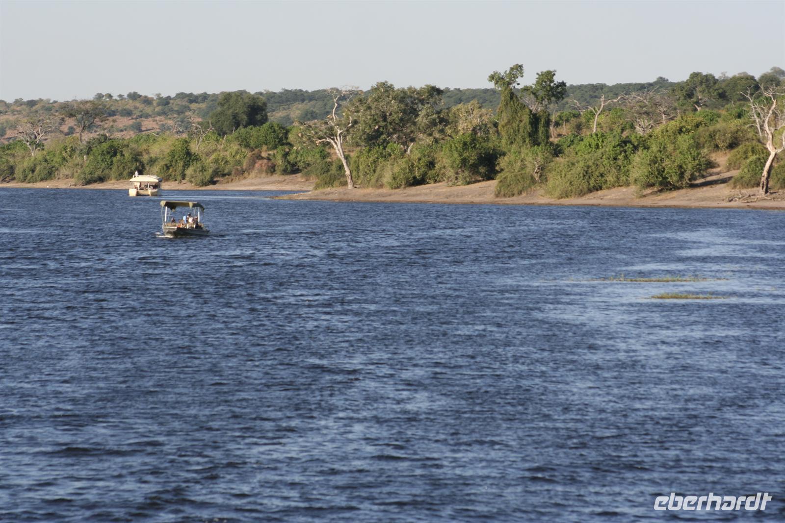 In unserem geräumigen Boot und kühlen Getränken an Bord schipperten wir gemütlich den Chobe entlang. Ganz nah beobachteten wir Wasserwarane und Krokodile am Ufer. In den Lüften schwebte ein Fish Eagle. Bald darauf wurde es noch "tierischer": Elefantenherden, Kudus, Büffel, Wasserböcke kamen am späten Nachmittag zum Fluss, um zu trinken. Elefantenherden mit "Babyfanten" schwammen durch den Fluss zur Insel, um noch saftigeres Grün zu naschen. Die gefühlten 398 Elefanten, die wir nun sahen, entschädigten die magere Ausbeute am Morgen.