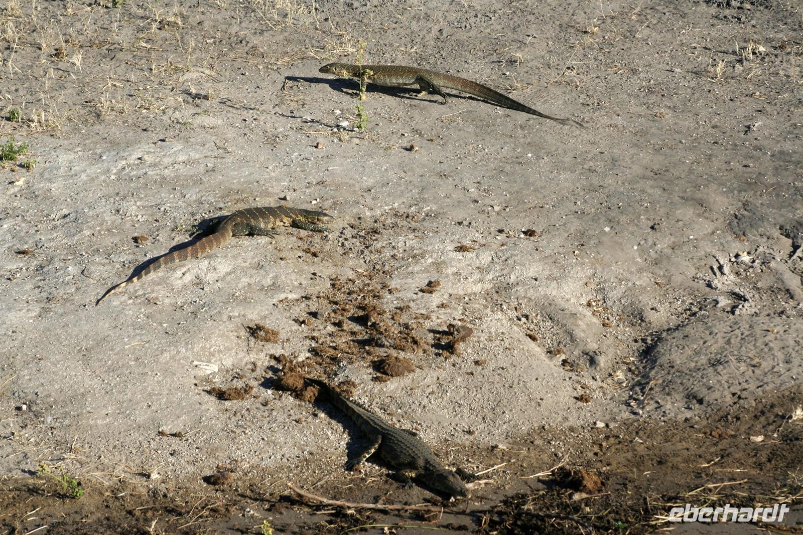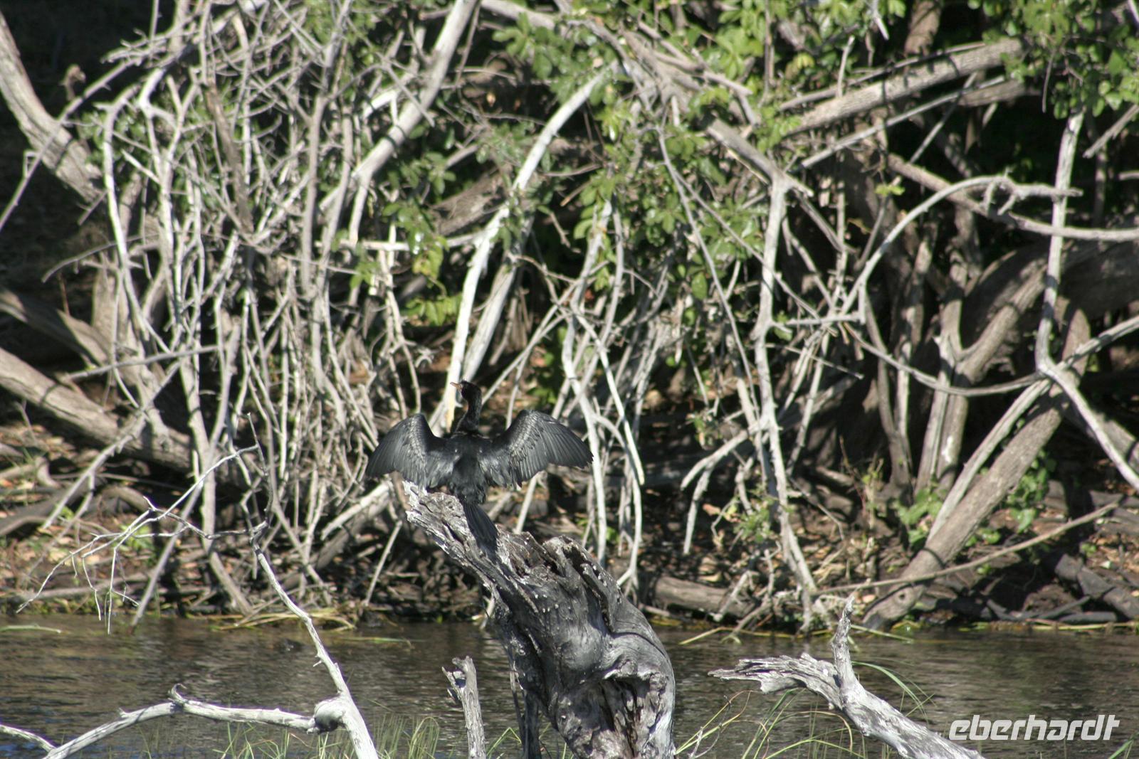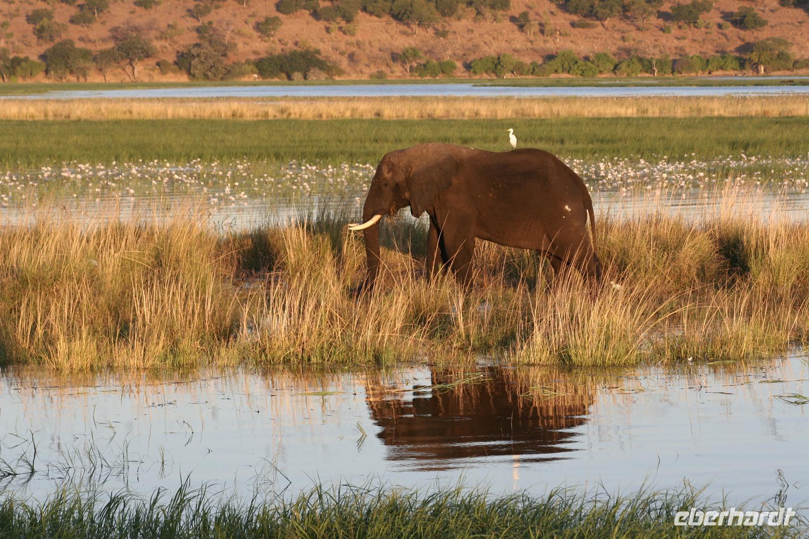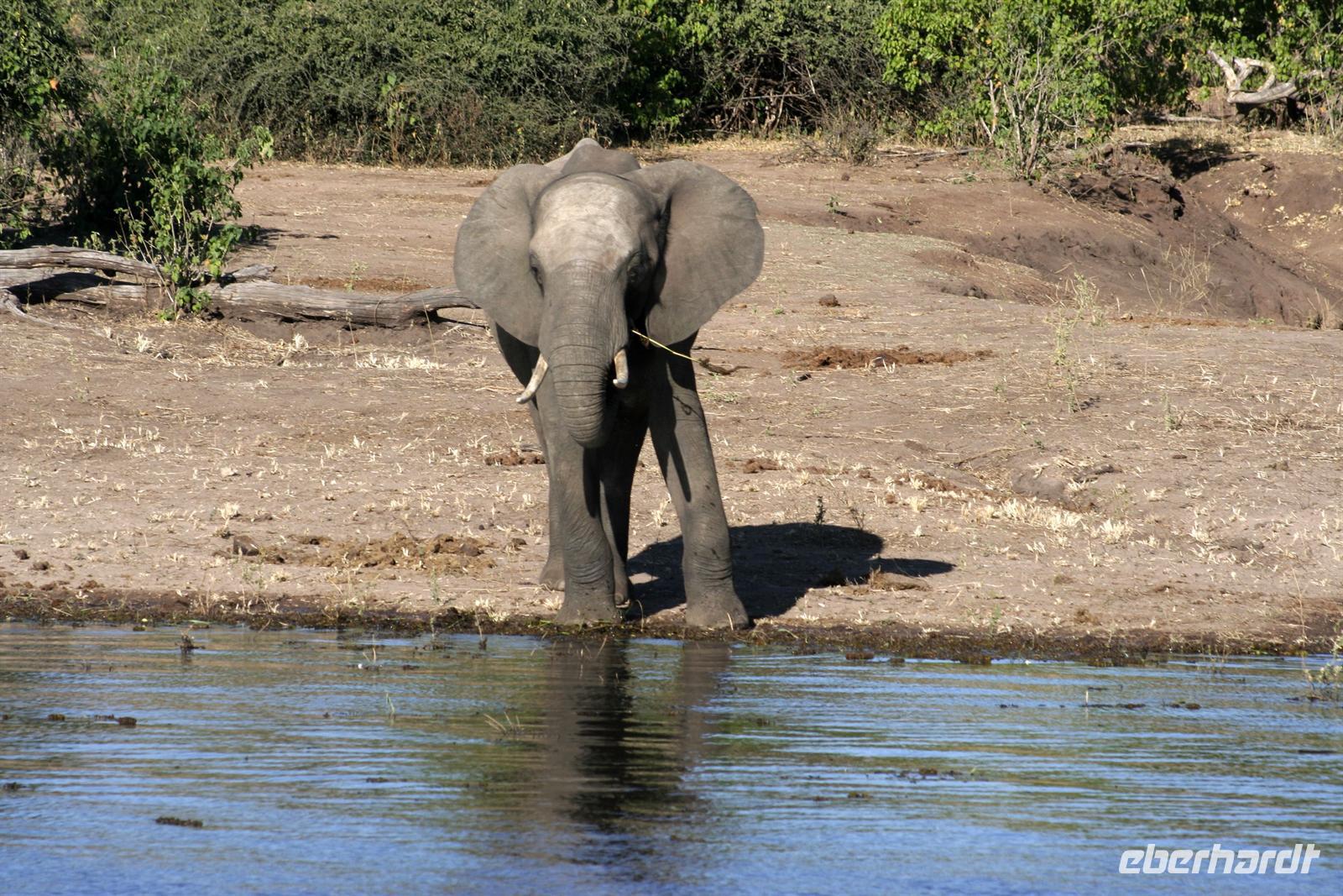 In unserem geräumigen Boot und kühlen Getränken an Bord schipperten wir gemütlich den Chobe entlang. Ganz nah beobachteten wir Wasserwarane und Krokodile am Ufer. In den Lüften schwebte ein Fish Eagle. Bald darauf wurde es noch "tierischer": Elefantenherden, Kudus, Büffel, Wasserböcke kamen am späten Nachmittag zum Fluss, um zu trinken. Elefantenherden mit "Babyfanten" schwammen durch den Fluss zur Insel, um noch saftigeres Grün zu naschen. Die gefühlten 398 Elefanten, die wir nun sahen, entschädigten die magere Ausbeute am Morgen.