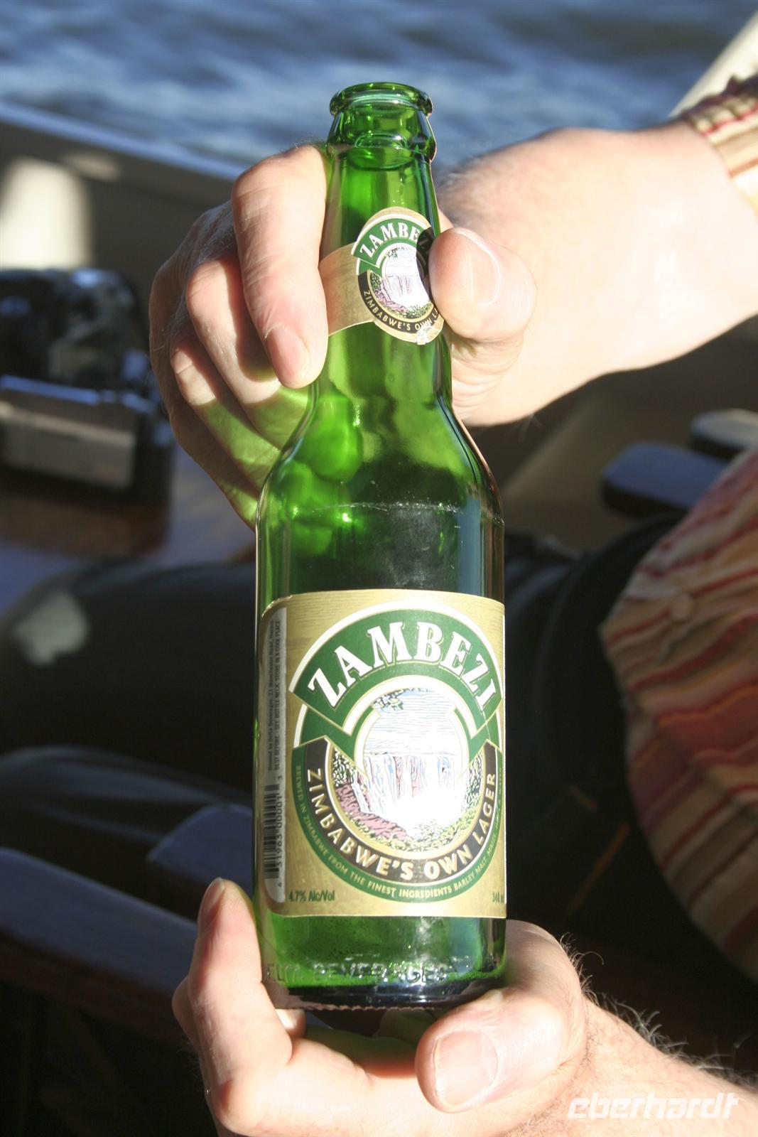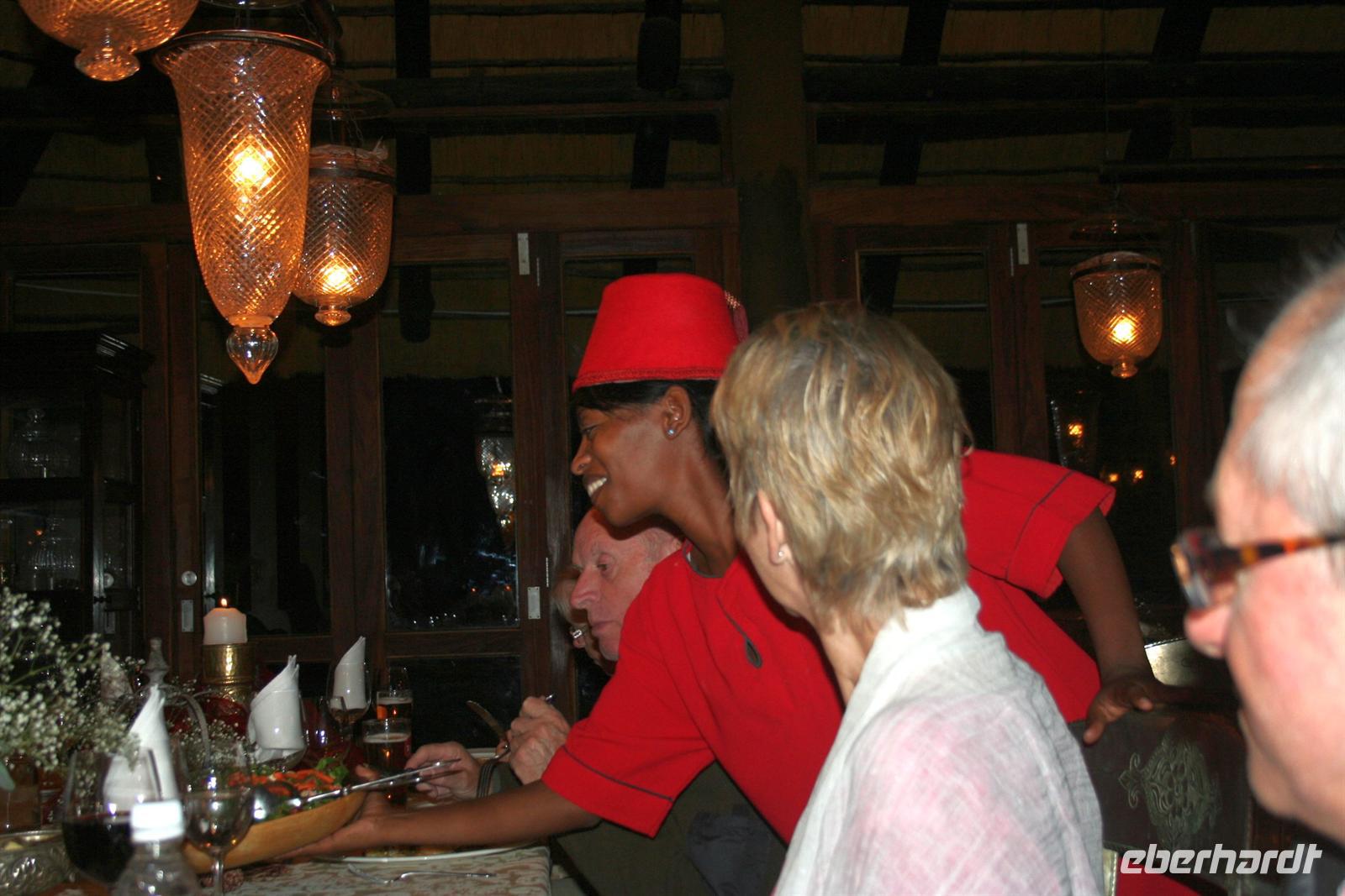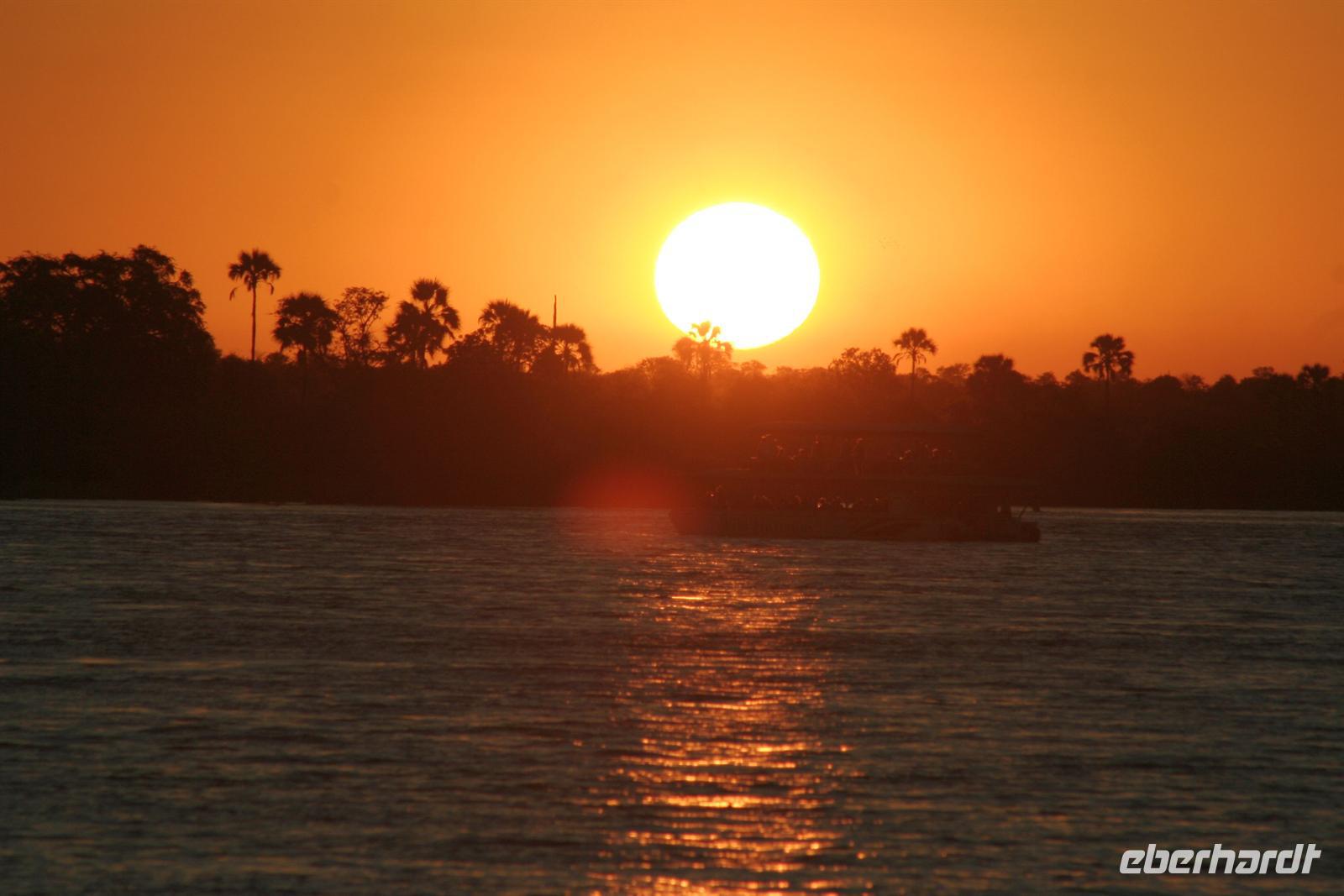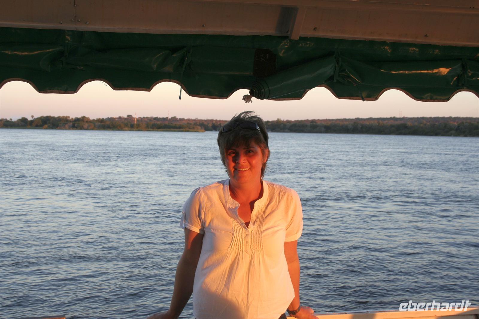 Wir blickten noch einmal auf dem Gichtnebel über der "Kante" der Fälle, der sich in Regenbogenfarben präsentierte, sahen Krokodile, gähnende Hippos und erlebten einen unbeschreiblichen Sonnenuntergang. Wir haben die Fahrt auf dem Zambesi in vollen Zügen genossen! Zum Abend bedienten wir uns am vorzüglichen Buffet. Die Auftritte der Zimbal- und Zulutanzgruppe (sicher auch mein Auftritt) sorgten für genügend Stimmung. Ein gelungener Abschlussabend, den wir mit einem gut gekühlten Amarula, Amarula,..rula, ... rula beschlossen.