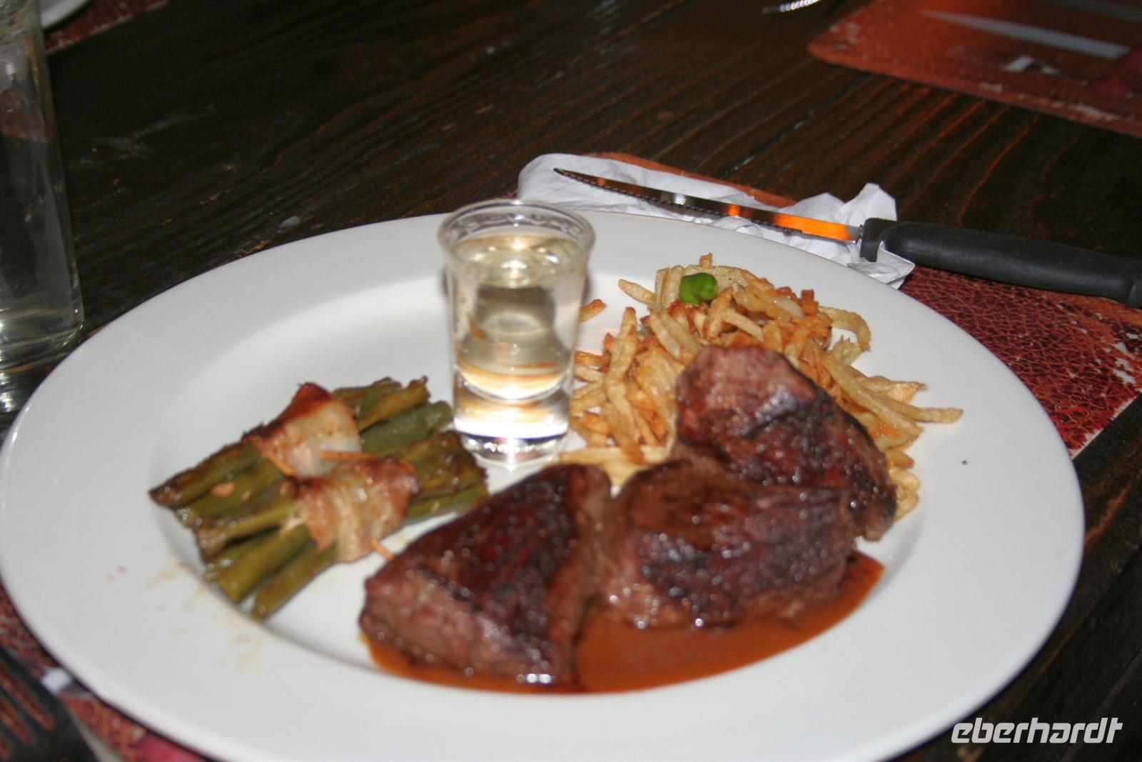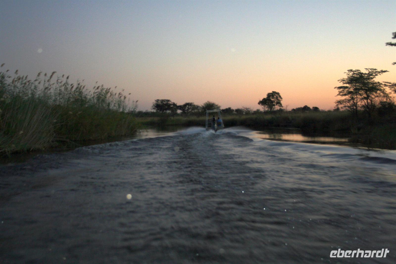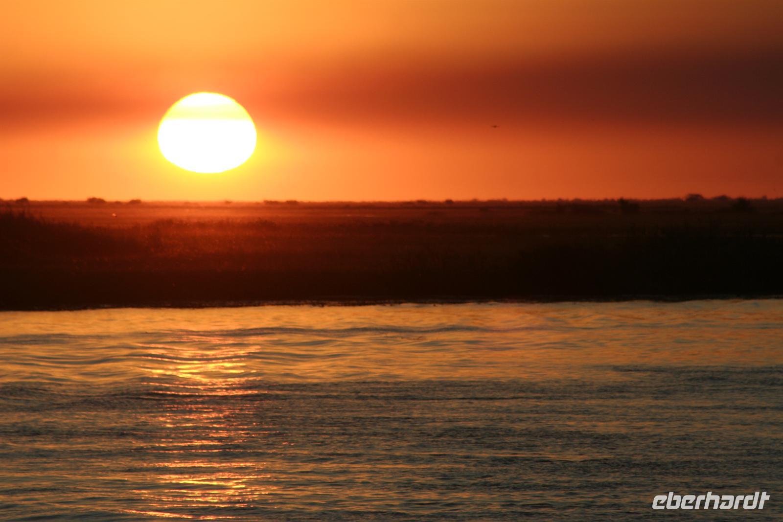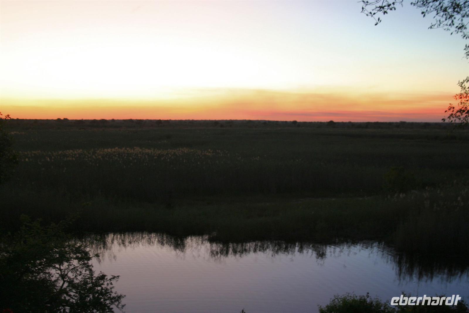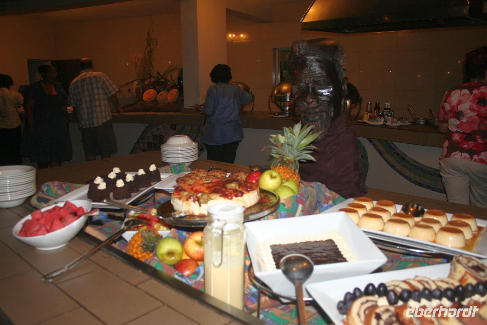 Wir blickten noch einmal auf dem Gichtnebel über der "Kante" der Fälle, der sich in Regenbogenfarben präsentierte, sahen Krokodile, gähnende Hippos und erlebten einen unbeschreiblichen Sonnenuntergang. Wir haben die Fahrt auf dem Zambesi in vollen Zügen genossen! Zum Abend bedienten wir uns am vorzüglichen Buffet. Die Auftritte der Zimbal- und Zulutanzgruppe (sicher auch mein Auftritt) sorgten für genügend Stimmung. Ein gelungener Abschlussabend, den wir mit einem gut gekühlten Amarula, Amarula,..rula, ... rula beschlossen.