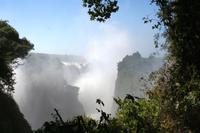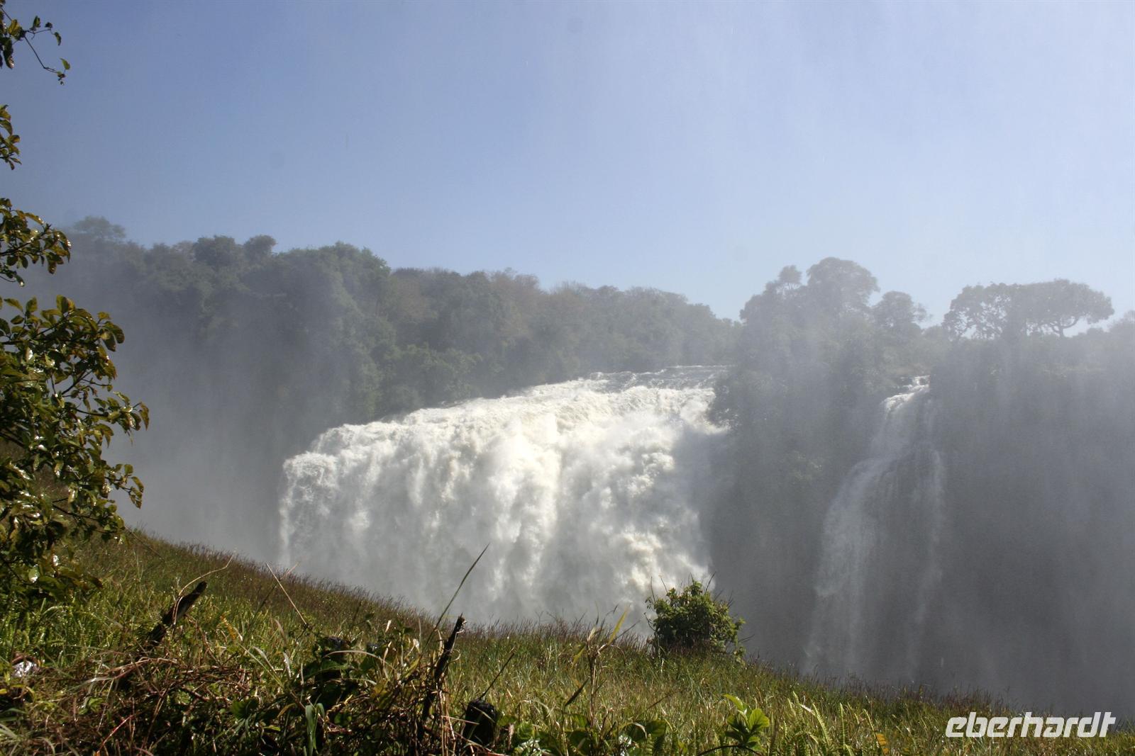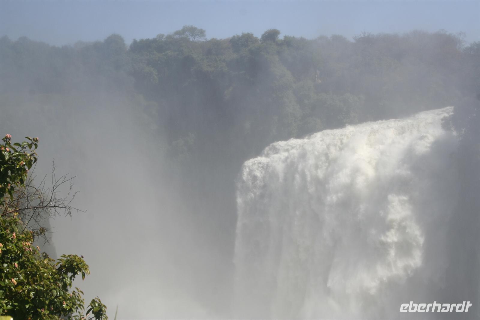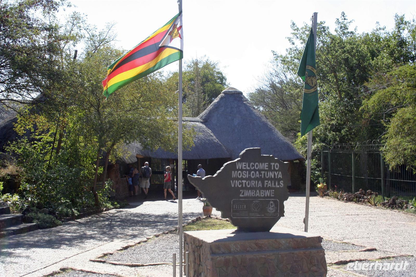 Eine kurze Fahrt führte uns zur Grenze nach Zimbawe. Im kleinen Grenzhäuschen erledigten wir die Einreiseformalitäten auf lustige, aber dennoch "bürokratische" Weise, aber alles kein Problem. Am frühen Mittag erreichten wir Vic Falls. Nach einer informativen Erklärung erkundeten wir den Nationalpark Vic Falls. Bewaffnet mit Schirm und Regencapes spazierten wir auf den befestigten Rundwegen entlang, um die äußerst wasserreichen Victoria Wasserfällezu besichtigen und vor allem zum spüren.