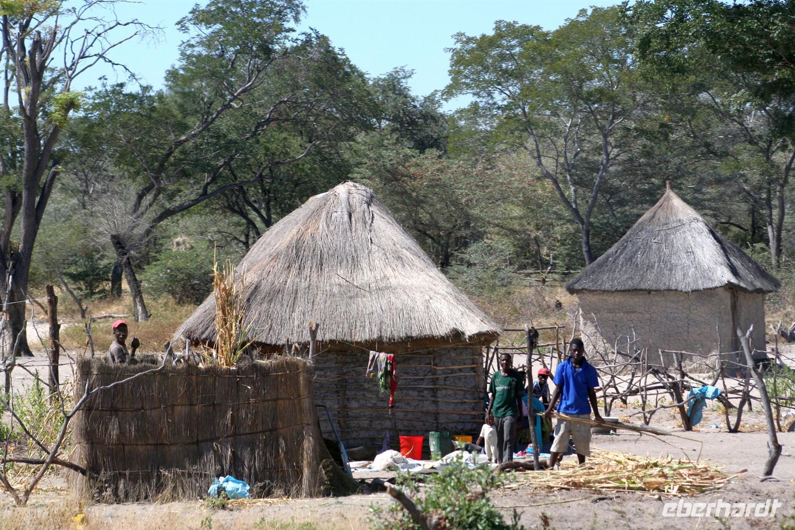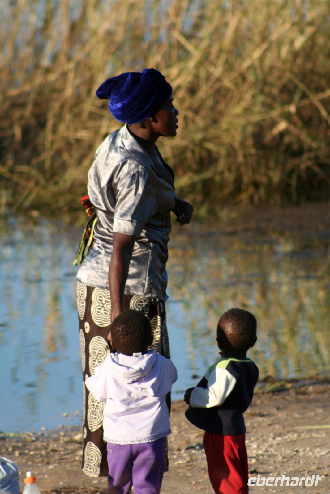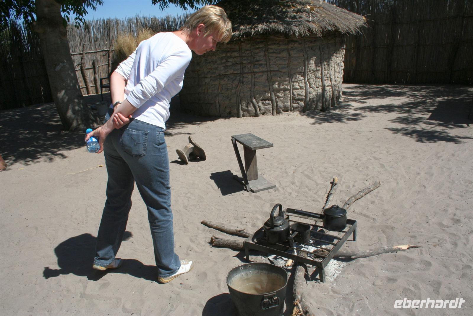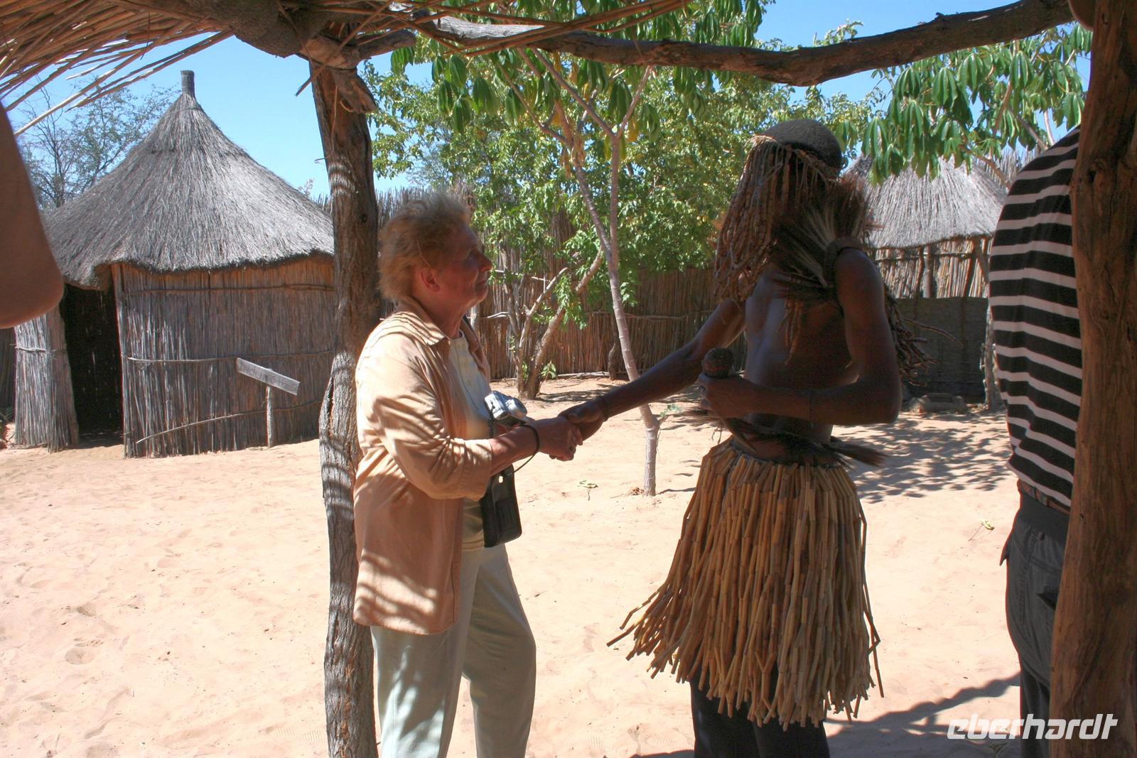 Freundliche Menschen, bepackt mit diversen Einkäufen, warteten am Ufer auf die Mokoros, die sie nach Angolas übersetzten. Zum Abendessen gab es deutsche Bratkatoffeln und Kuduschnitzel. Eine längere Fahrt führte uns am nächsten Tag in den grünen Caprivi-Streifen. Bei Divundu überquerten wir den mächtigen Okavango. Anschließend mußten wir unsere Uhren wieder eine Stunde vorstellen, da die Capriviregion sich nicht an der Zeitumstellung beteiligt. Kurz darauf durchquerten wir auf der Transitstraße den kleinen Mahango NP und fuhren am Bwatwata NP und Mudumu Np entlang. Tom erzählte uns wieder Interessantes zur Region, von Sitten und Bräuchen der verschiedenen Stämme und von seinen persönlichen Erlebnissen im südlichen Afrika. Am Nachmittag erreichten wir die wildromatische "Namushasha Lodge" bei Kongola. Bei Kaffee und Kuchen entspannten wir auf der Terrasse der Lodge. Nach dem Abendessen erzählte uns Tom eine afrikanische "Gute-Nacht-Geschichte". Nach dem Frühstück wanderten wir am Deltaufer entlang, ein mächtiger Baobab versperrte uns den Weg. Danach besuchten das "Mbukushu Culture Village", ein "künstliches" Dorf, wo wir Einblicke in die Kultur und auch frühere Lebensweise erhielten: Wie ist so ein Dorf aufgebaut, wie wohnte man, wer geht welcher Arbeit nach, wie baut und stellt man Fallen und was ist ein Sangoma (Medizinmann). Auch getanzt und gesungen wurde für uns.