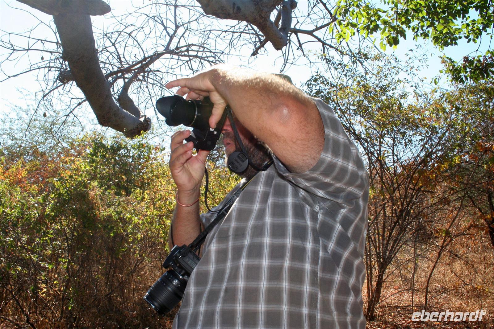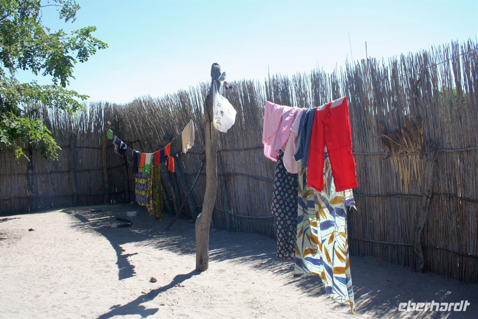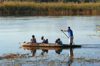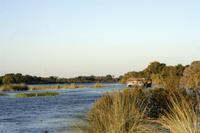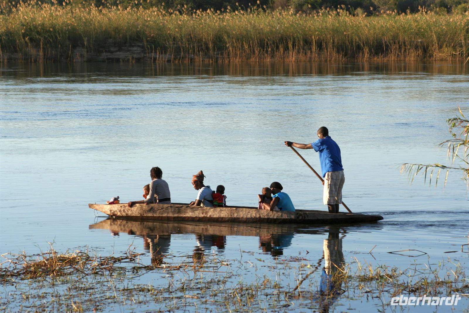 Freundliche Menschen, bepackt mit diversen Einkäufen, warteten am Ufer auf die Mokoros, die sie nach Angolas übersetzten. Zum Abendessen gab es deutsche Bratkatoffeln und Kuduschnitzel. Eine längere Fahrt führte uns am nächsten Tag in den grünen Caprivi-Streifen. Bei Divundu überquerten wir den mächtigen Okavango. Anschließend mußten wir unsere Uhren wieder eine Stunde vorstellen, da die Capriviregion sich nicht an der Zeitumstellung beteiligt. Kurz darauf durchquerten wir auf der Transitstraße den kleinen Mahango NP und fuhren am Bwatwata NP und Mudumu Np entlang. Tom erzählte uns wieder Interessantes zur Region, von Sitten und Bräuchen der verschiedenen Stämme und von seinen persönlichen Erlebnissen im südlichen Afrika. Am Nachmittag erreichten wir die wildromatische "Namushasha Lodge" bei Kongola. Bei Kaffee und Kuchen entspannten wir auf der Terrasse der Lodge. Nach dem Abendessen erzählte uns Tom eine afrikanische "Gute-Nacht-Geschichte". Nach dem Frühstück wanderten wir am Deltaufer entlang, ein mächtiger Baobab versperrte uns den Weg. Danach besuchten das "Mbukushu Culture Village", ein "künstliches" Dorf, wo wir Einblicke in die Kultur und auch frühere Lebensweise erhielten: Wie ist so ein Dorf aufgebaut, wie wohnte man, wer geht welcher Arbeit nach, wie baut und stellt man Fallen und was ist ein Sangoma (Medizinmann). Auch getanzt und gesungen wurde für uns.