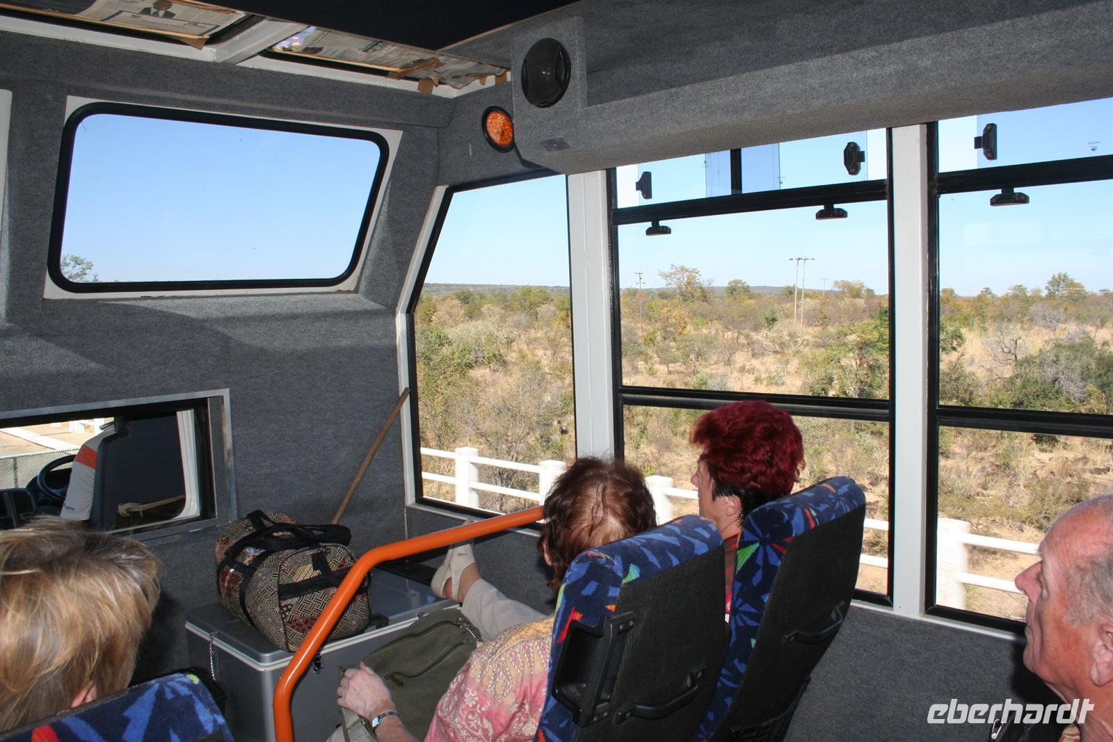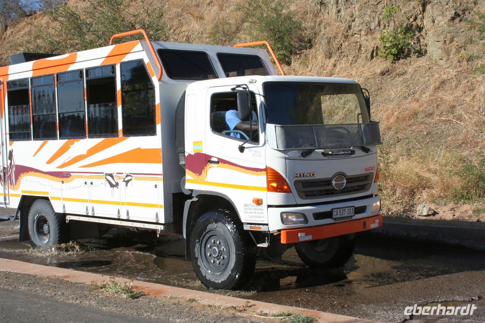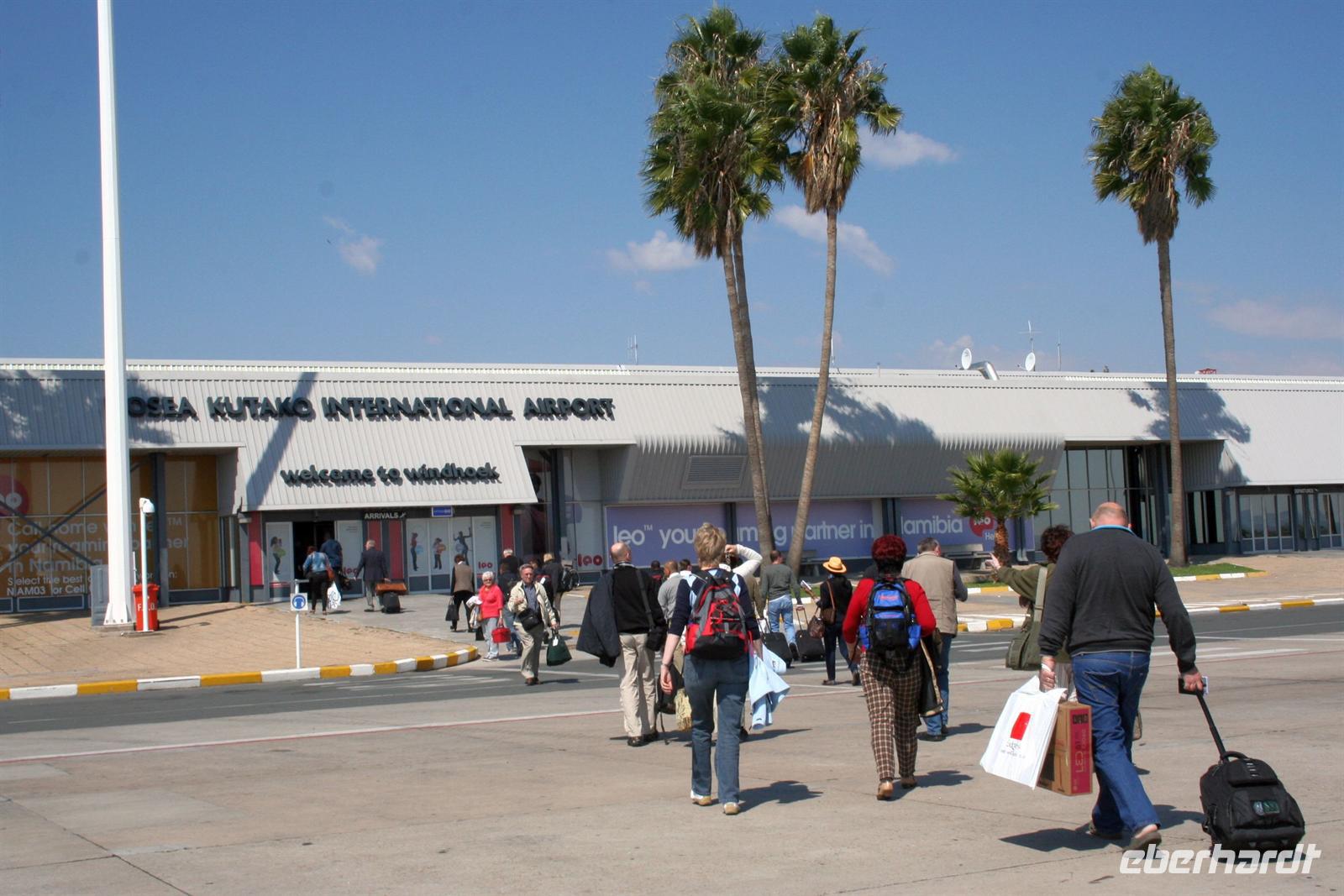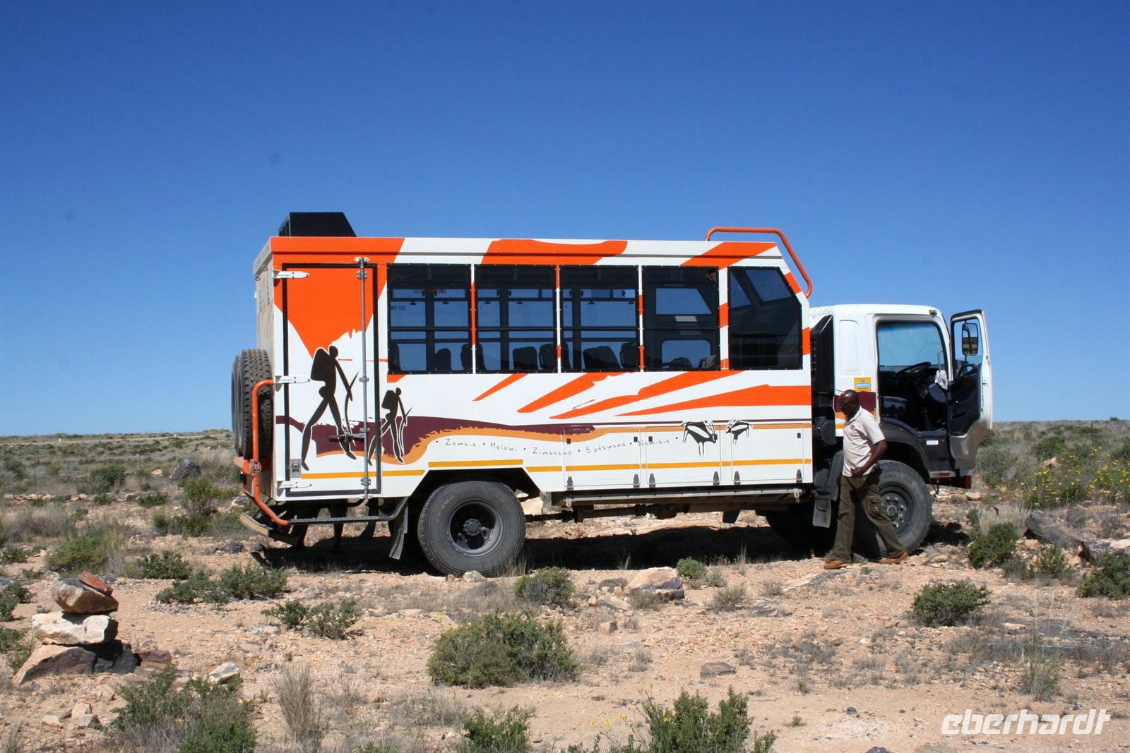 Nach Check-In und gut stärkt vom Imbiss im "Chili" starteten 4 Reisegäste mit Annett fast pünktlich von Dresden nach Frankfurt. Über Frankfurt drehten wir eine Ehrenrunde bis wir endlich landeten. Am Abfluggate nach Johannesburg begrüßten wir weitere Gäste, um nun gemeinsam unser Abenteuer "Afrika" zu beginnen. 8.684 km Flug nach Johannesburg lagen vor uns. Der Flug war angenehm, genügend Platz war vorhanden. Dann noch 2 h Flug nach Winhoek und wir beendeten unseren Marathon in den Lüften. Eine Stunde hatten wir gespart, da die Uhren zurück gestellt wurden. Nachdem wir "Geldgeschäfte" gleich am Flughafen erledigten, staunten wir nicht schlecht: unsere Kleinstgruppe konnte den Safaritruck statt eines Kleinbusses besteigen.
