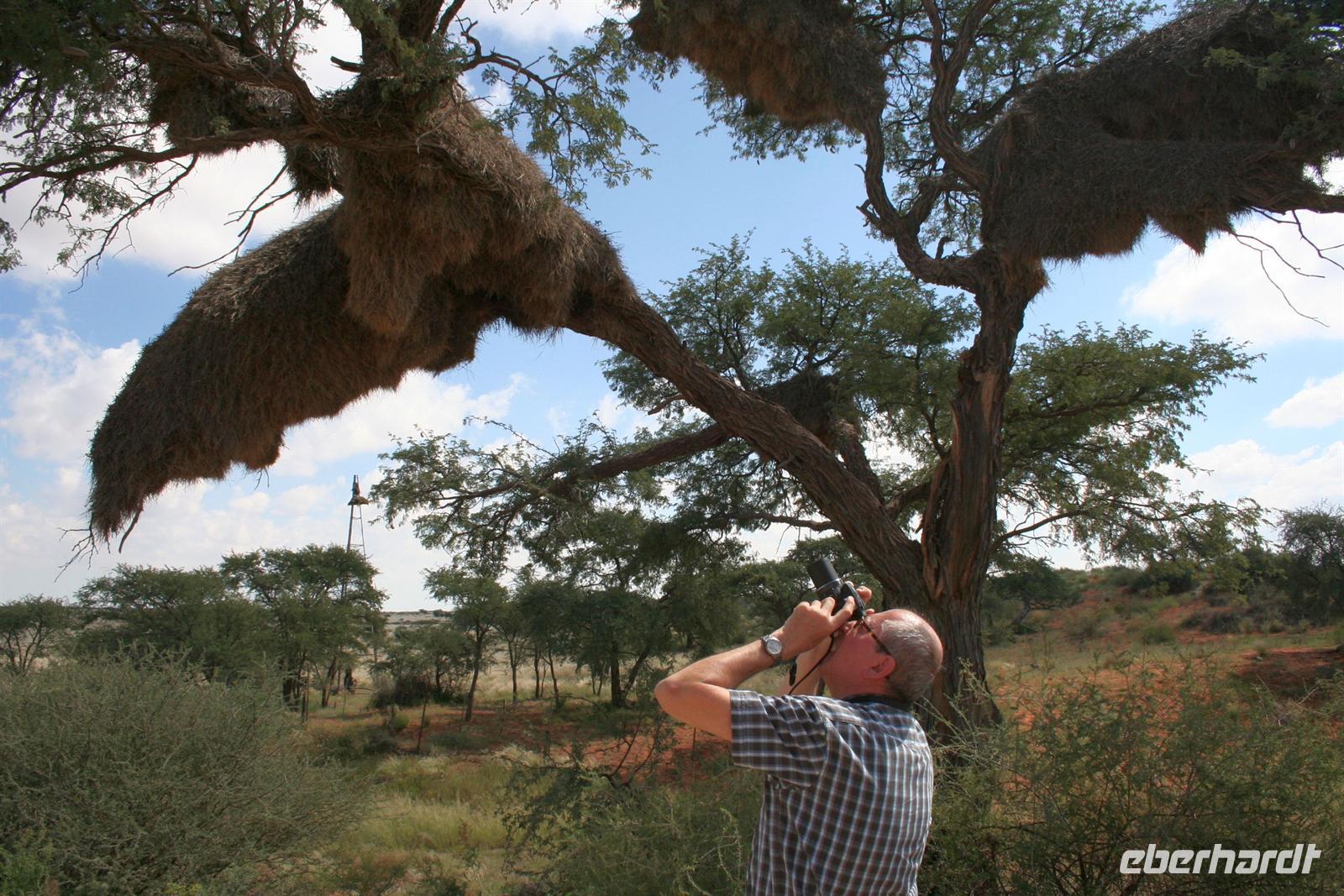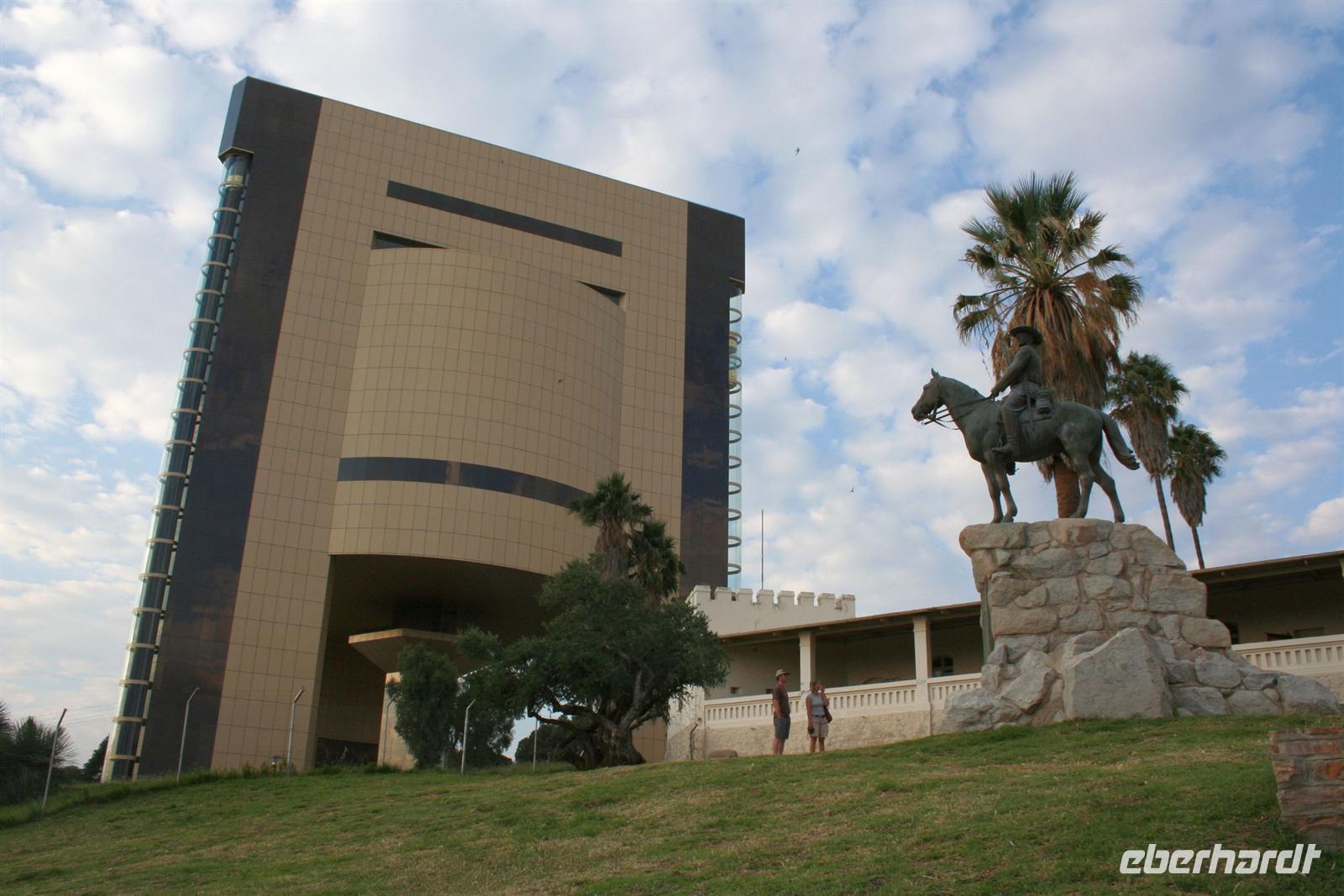 In Windhoek stürmten wir den Supermarkt, um uns mit Adaptern und diversen Reiseutensilien einzudecken. Auch zu Haus vergessene Medikamente wurden problemlos besorgt. Anschließend machten wir uns im komfortablen Hotel "Thule" frisch, bevor wir zur City Tour starteten. Nun begrüßten wir auch unseren Guide Tom und los ging es mit Tamu, unserem Driver und waschechten Herero. In der Christuskirche fand gerade eine Hochzeit (neben AfriKaans wurde auch Russisch gesprochen) statt und wir konnten die Kirche innen besichtigen. Gegenüber auf einen Hügel, sahen wir (doch etwas irritiert) den futuristischen Bau des neuen Unabhängigkeitsmuseums. Das alte Reiterdenkmal wurde dafür vor die alte Feste versetzt. Danach spazierten wir zum "Tintenpalast" und genossen schon die Abenddämmerung. Auch statteten wir dem Büro und Depot unserer Agentur in Windhoek einen kurzen Besuch ab. ker" Begegnungen mit Sprinkbock, Kudu, Oryx und Strauß. Die ganze Nacht regnete es, aber am Morgen sagte uns Frau Sonne "Guten Morgen". Nach einem Frühstück mit Panoramablick starteten wir nach Marienthal. Vorbei am "Heldenacker" und der "Basterstadt" Rehoboth gelangten wir in die Kalahari. Unterwegs bestaunten wir die Riesennester der Webervögel, einsame Viehstationen mit traditionellen Wasserpumpen und "Kalahari Ferraris", die durch die Wüste "rasten". Am Nachmittag wurden wir mit Kaffee und Kuchen im Camp begrüßt.