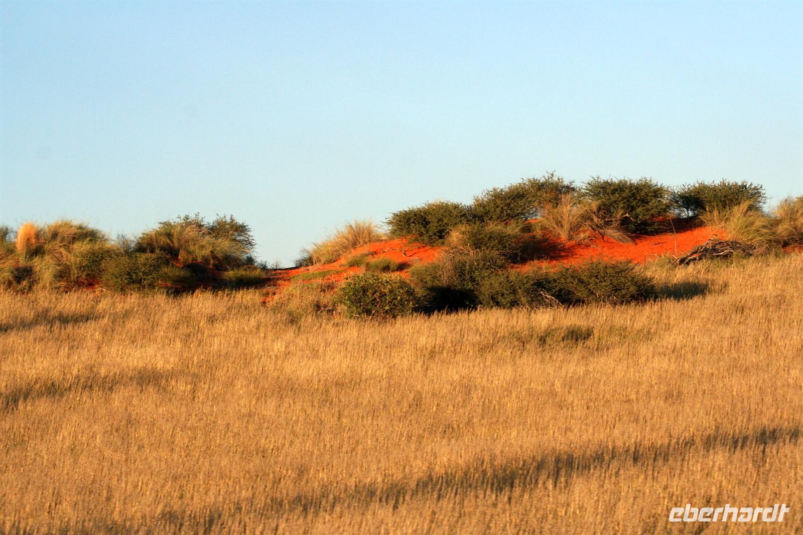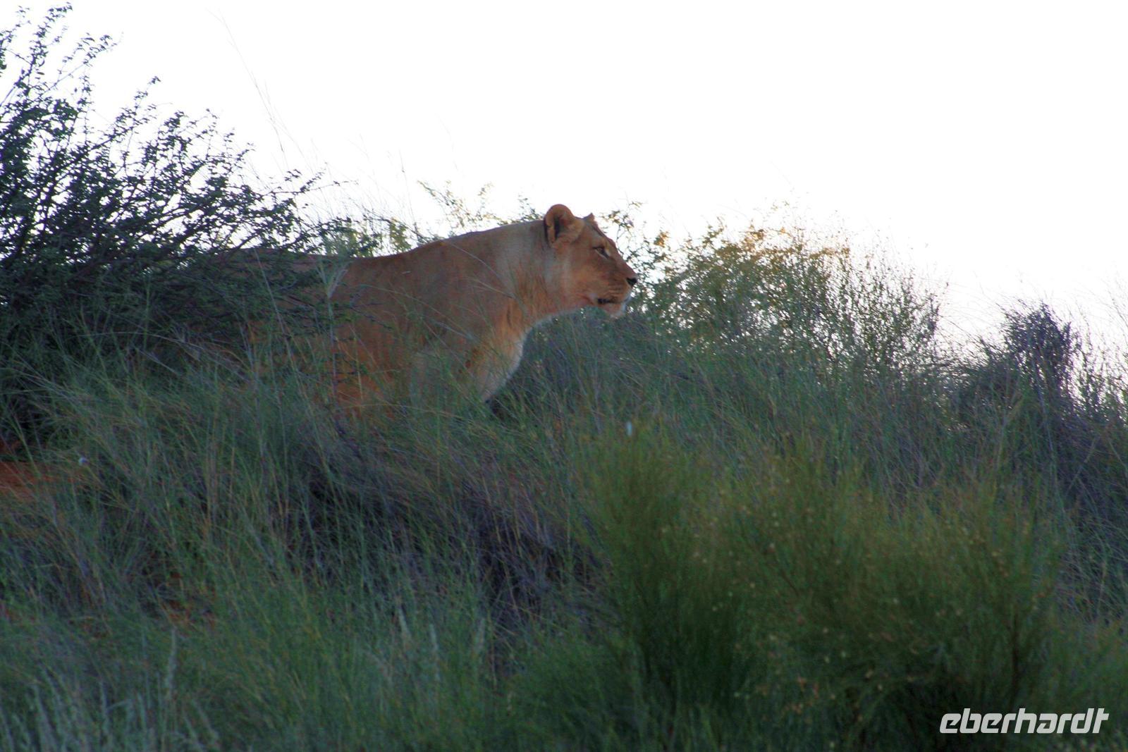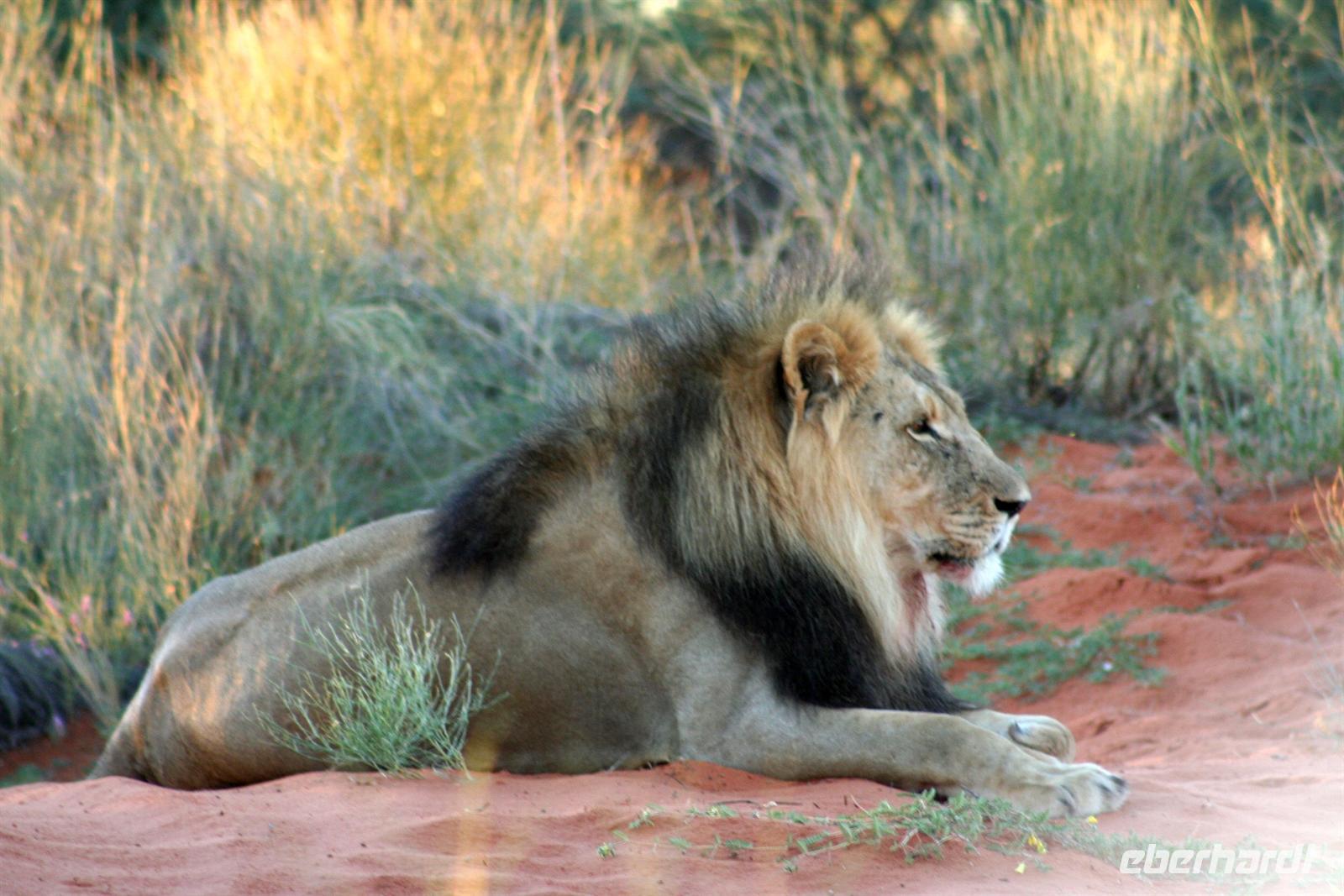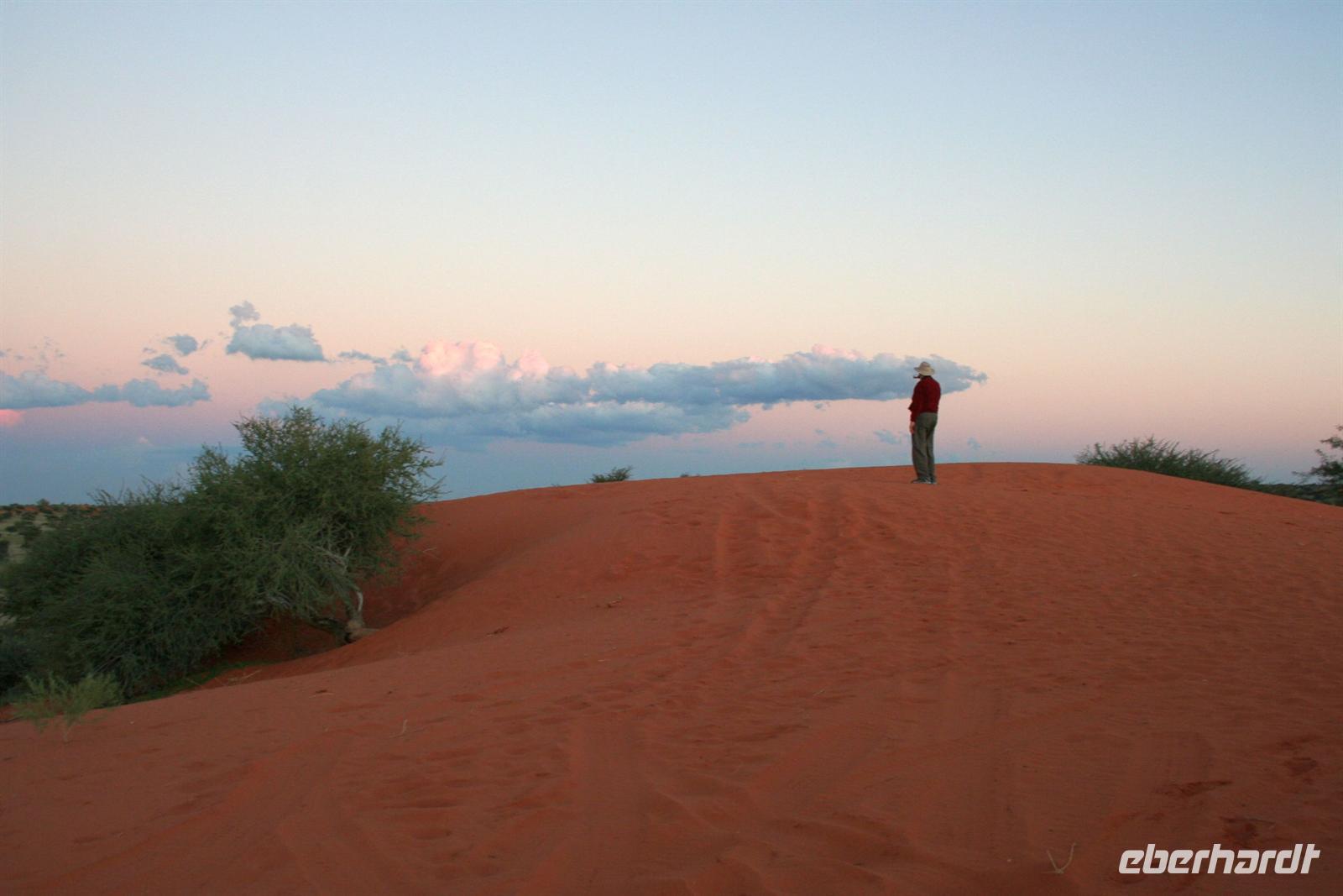 Unsere "Sunset Game Drive" führte uns ins freie Gelände der Kalahari mit ihren sanften, roten Dünenwellen. Wunderschöne Fotomotive zogen an unseren Augen vorbei. Neben Oryxen, Zebras, Straußen und Elefanten begegneten wir einem stattlichen Kalahari-Löwenpaar in der Dämmerung. Das begossen wir mit einem Sektchen, mitten in der Kalahari. Nachts hörten wir die Löwen brüllen!