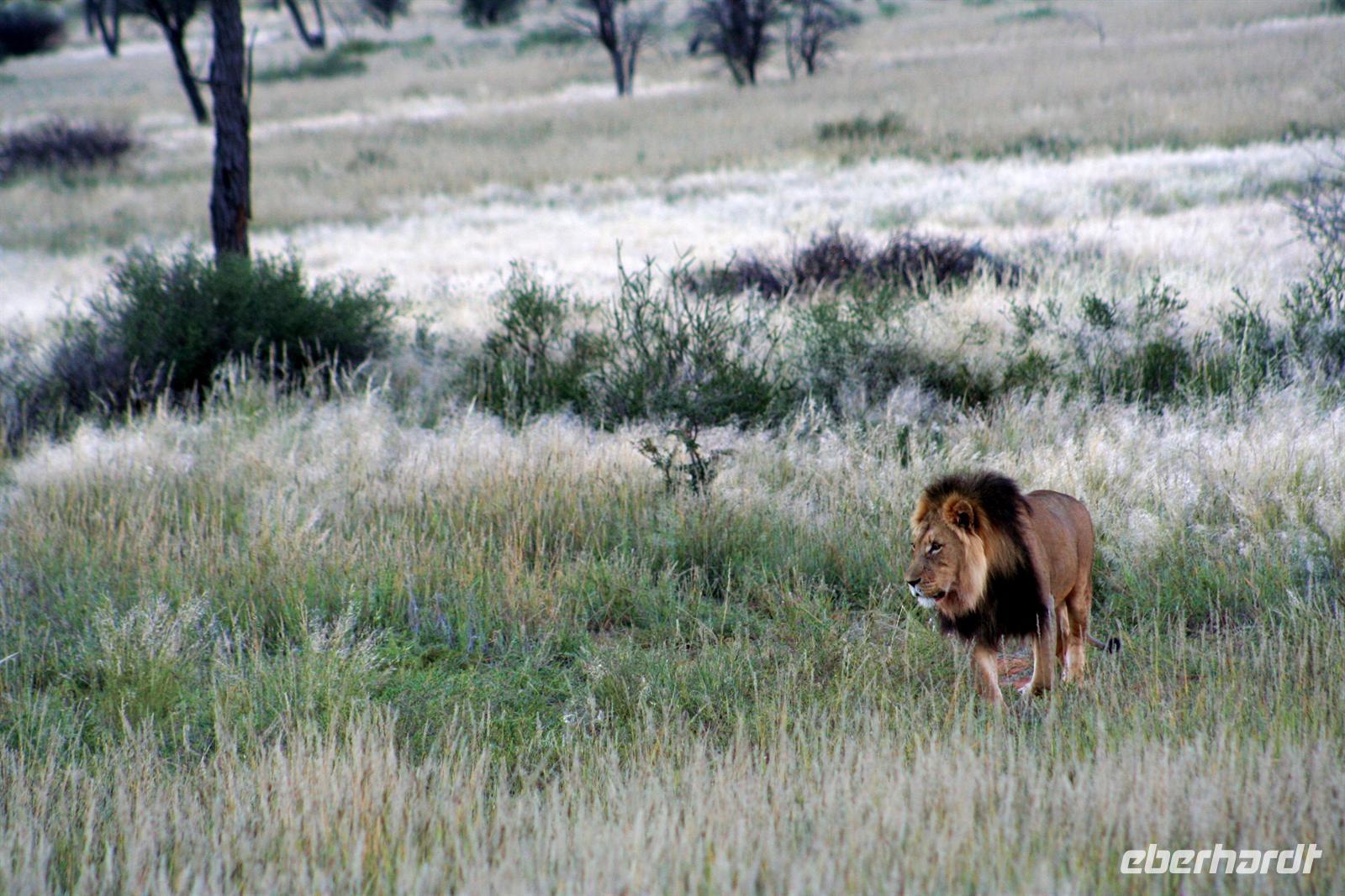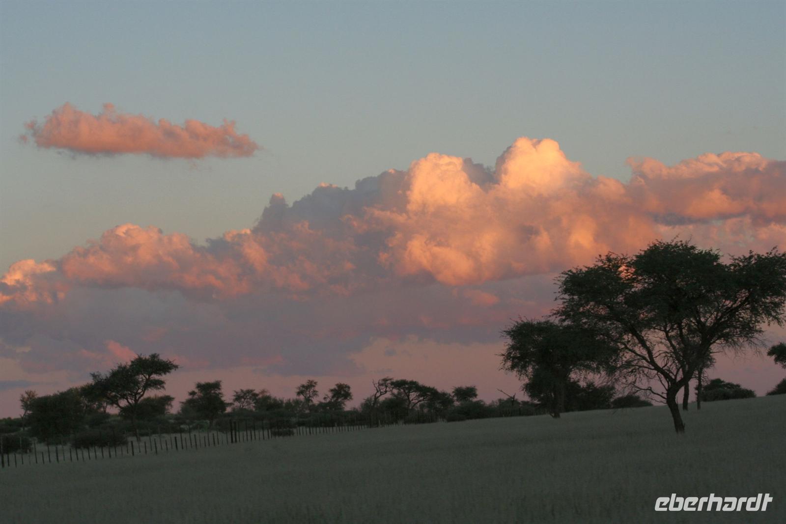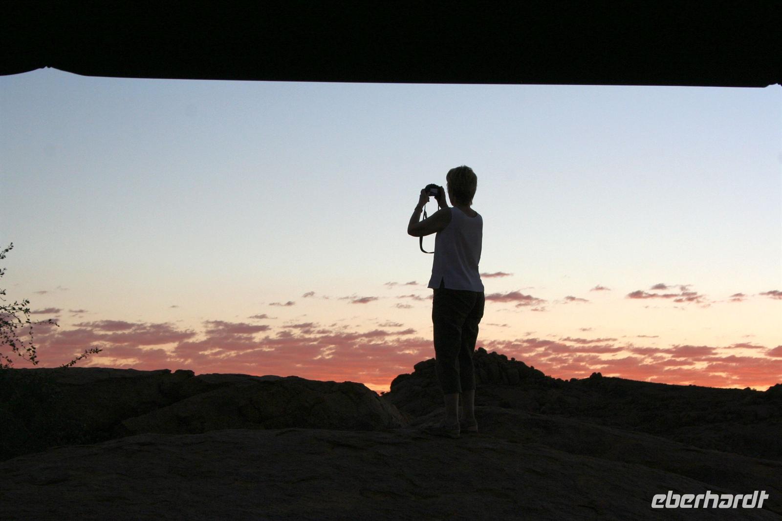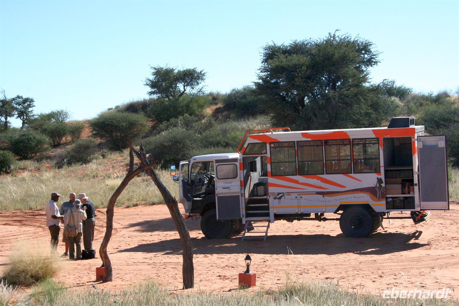 Unsere "Sunset Game Drive" führte uns ins freie Gelände der Kalahari mit ihren sanften, roten Dünenwellen. Wunderschöne Fotomotive zogen an unseren Augen vorbei. Neben Oryxen, Zebras, Straußen und Elefanten begegneten wir einem stattlichen Kalahari-Löwenpaar in der Dämmerung. Das begossen wir mit einem Sektchen, mitten in der Kalahari. Nachts hörten wir die Löwen brüllen!