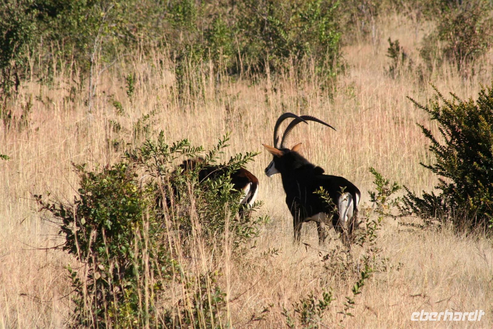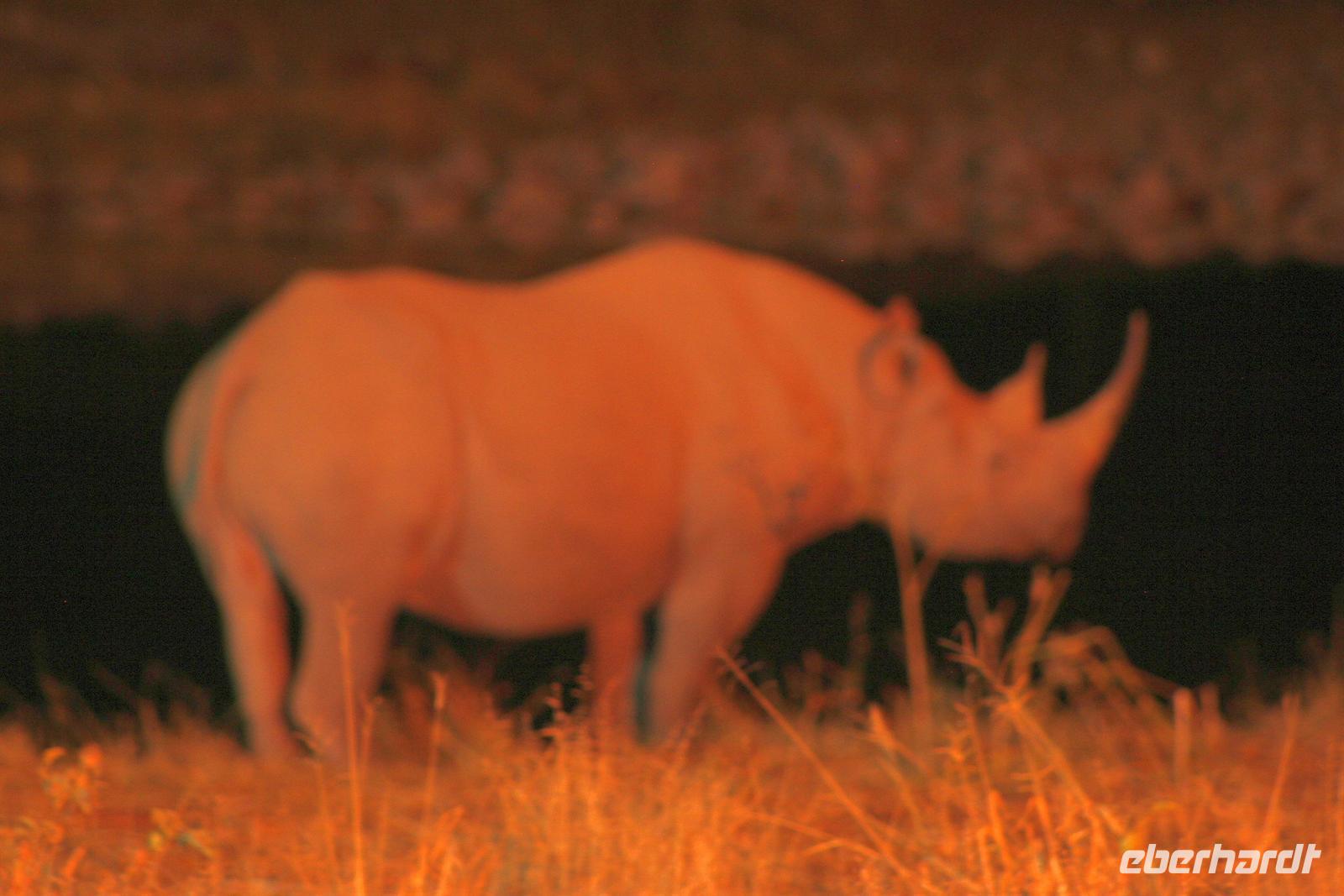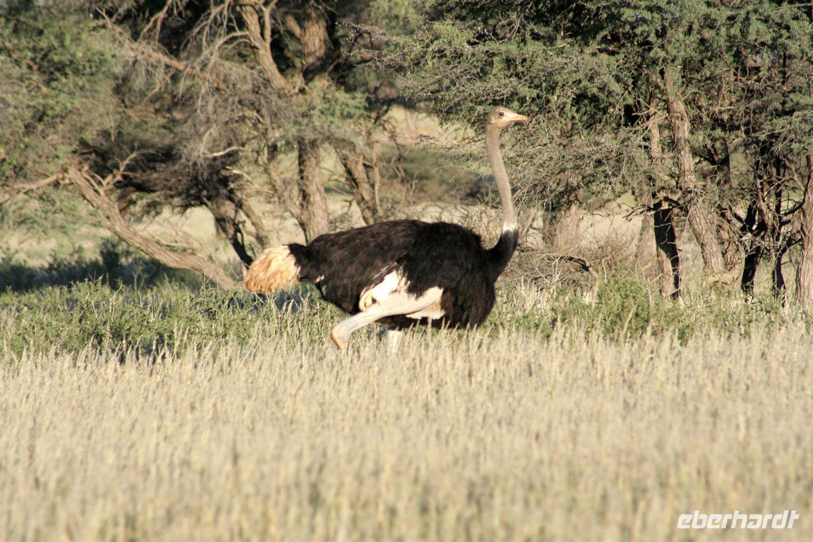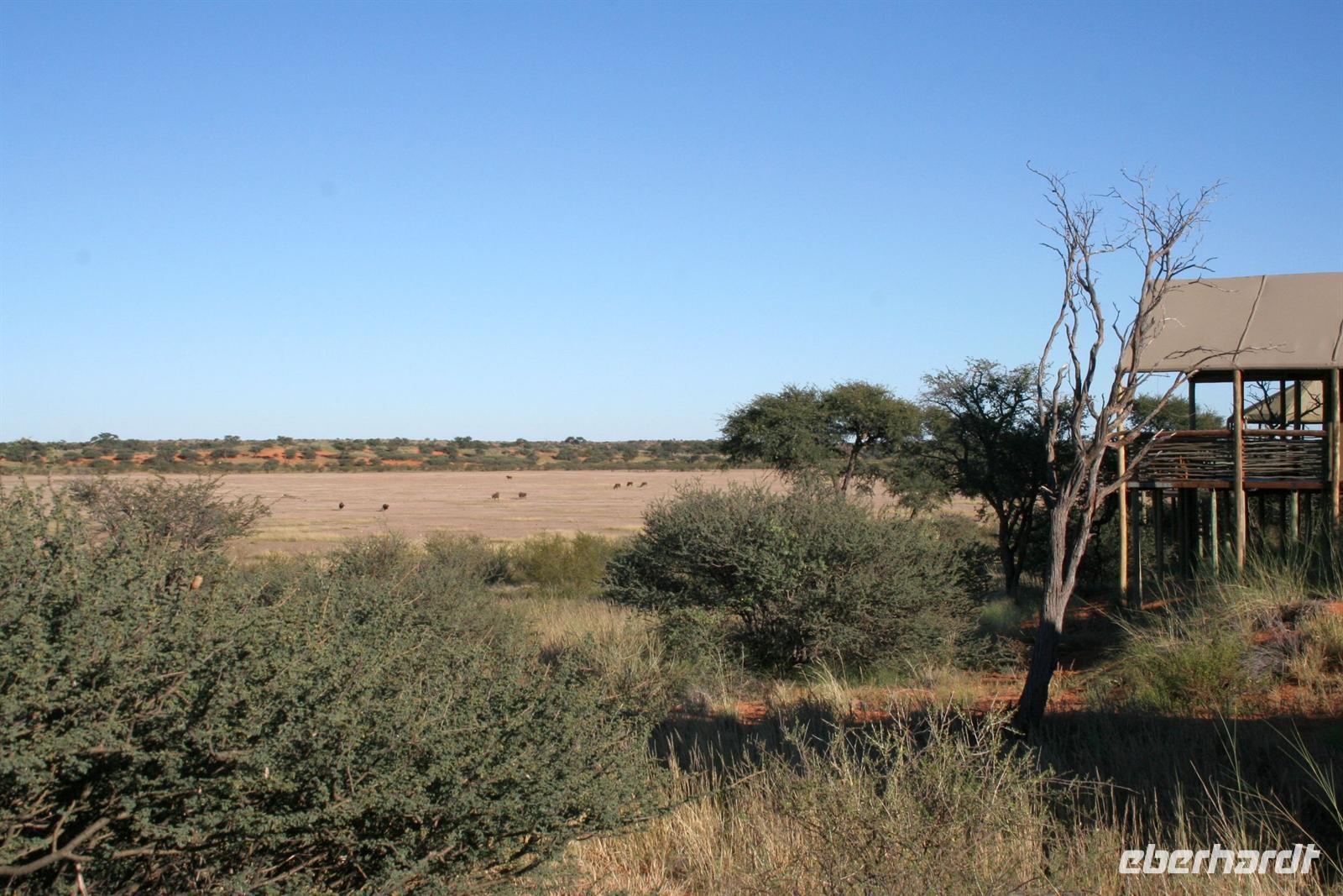 Unsere "Sunset Game Drive" führte uns ins freie Gelände der Kalahari mit ihren sanften, roten Dünenwellen. Wunderschöne Fotomotive zogen an unseren Augen vorbei. Neben Oryxen, Zebras, Straußen und Elefanten begegneten wir einem stattlichen Kalahari-Löwenpaar in der Dämmerung. Das begossen wir mit einem Sektchen, mitten in der Kalahari. Nachts hörten wir die Löwen brüllen!