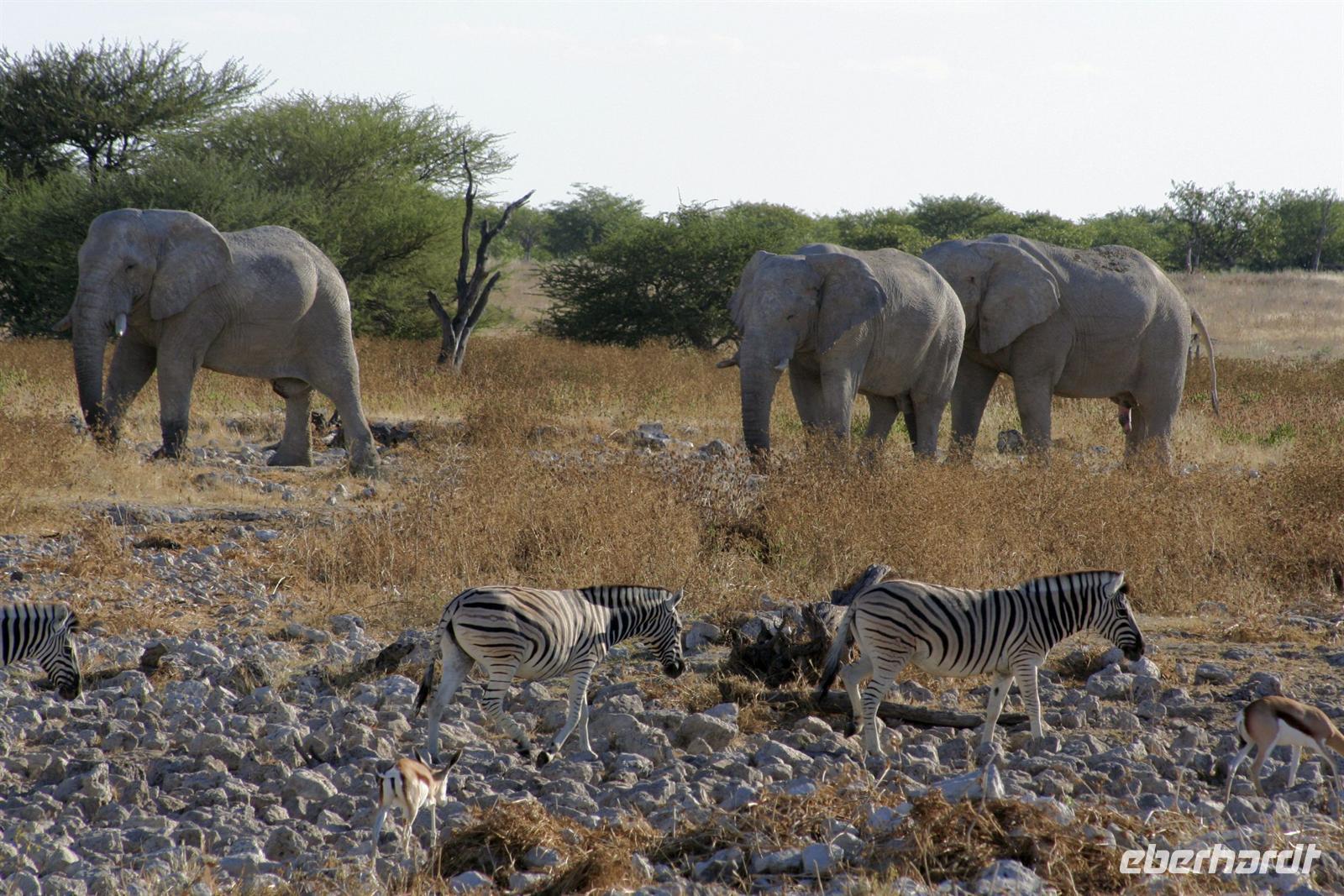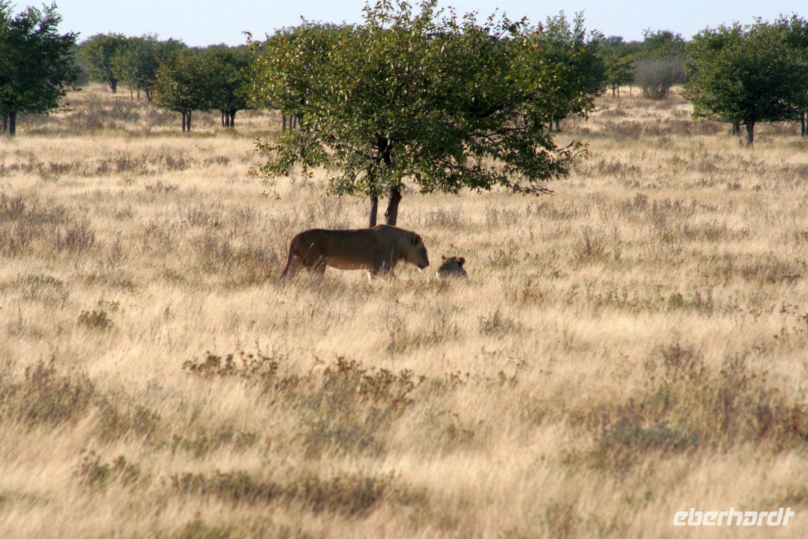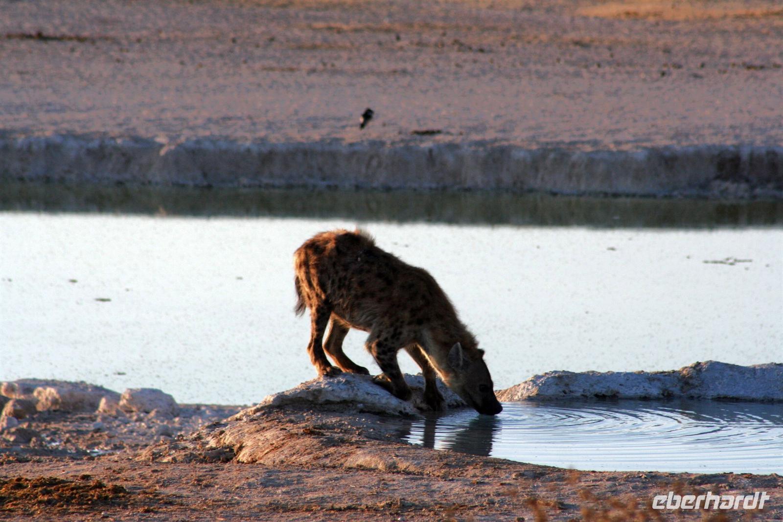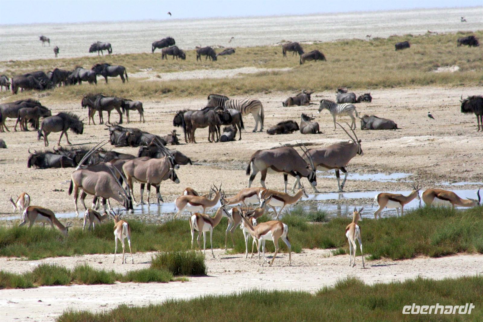 Wir beobachteten Tüpfelhyänen, Elefant, riesige Springbock- und Impalaherden, ein Löwenrudel unter Schattenbäumen, die dem leckeren Anblick vorbei ziehender, doch irritiert schauender Zebras widerstanden. Riesentrappen und Strauße durchstreiften den Busch und am westlichen Pfannenrand trafen sich unzählige Tiergruppen von Gnus, Zebras, Oryxen, Springböcken, Straußen.... zum gemeinsamen Entspannen. Am frühen Nachmittag waren wir im Camp zurück und liessen für heut die Seele baumeln. Der alte Turm wurde bestiegen, Postkarten geschrieben und im Pool gebadet, auch am Wasserloch gab es wieder einiges zu sehen.