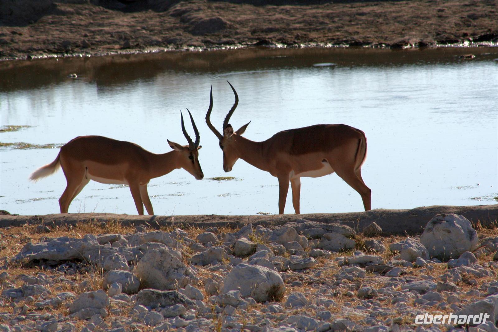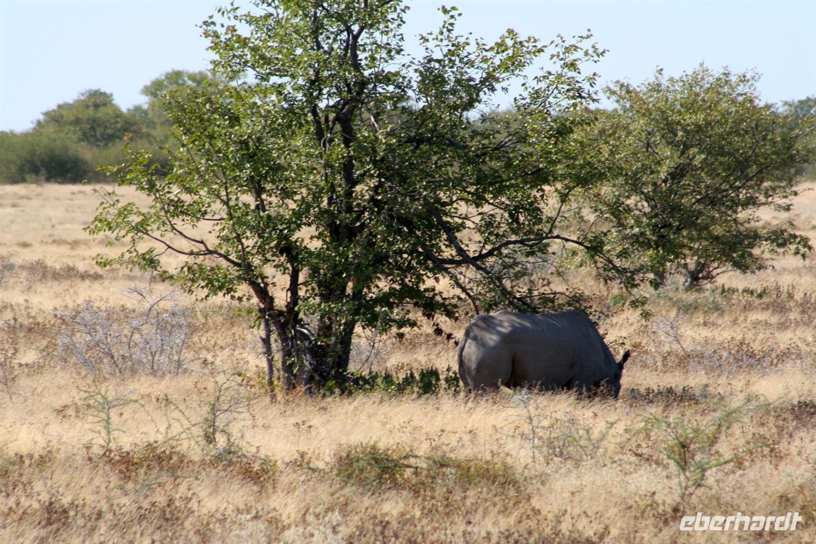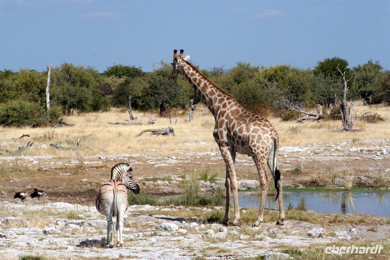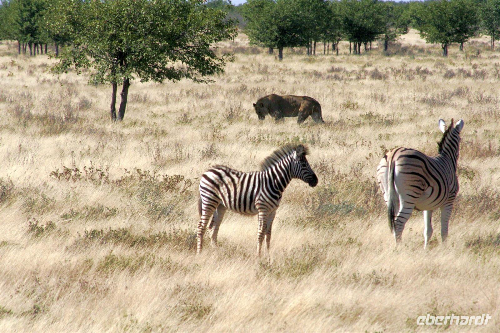 Wir beobachteten Tüpfelhyänen, Elefant, riesige Springbock- und Impalaherden, ein Löwenrudel unter Schattenbäumen, die dem leckeren Anblick vorbei ziehender, doch irritiert schauender Zebras widerstanden. Riesentrappen und Strauße durchstreiften den Busch und am westlichen Pfannenrand trafen sich unzählige Tiergruppen von Gnus, Zebras, Oryxen, Springböcken, Straußen.... zum gemeinsamen Entspannen. Am frühen Nachmittag waren wir im Camp zurück und liessen für heut die Seele baumeln. Der alte Turm wurde bestiegen, Postkarten geschrieben und im Pool gebadet, auch am Wasserloch gab es wieder einiges zu sehen.
