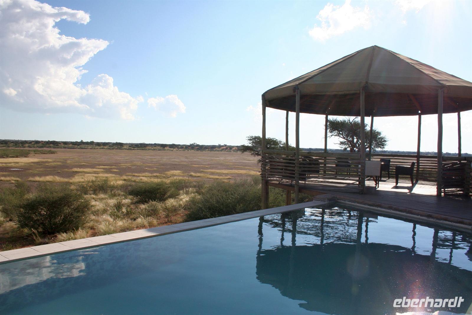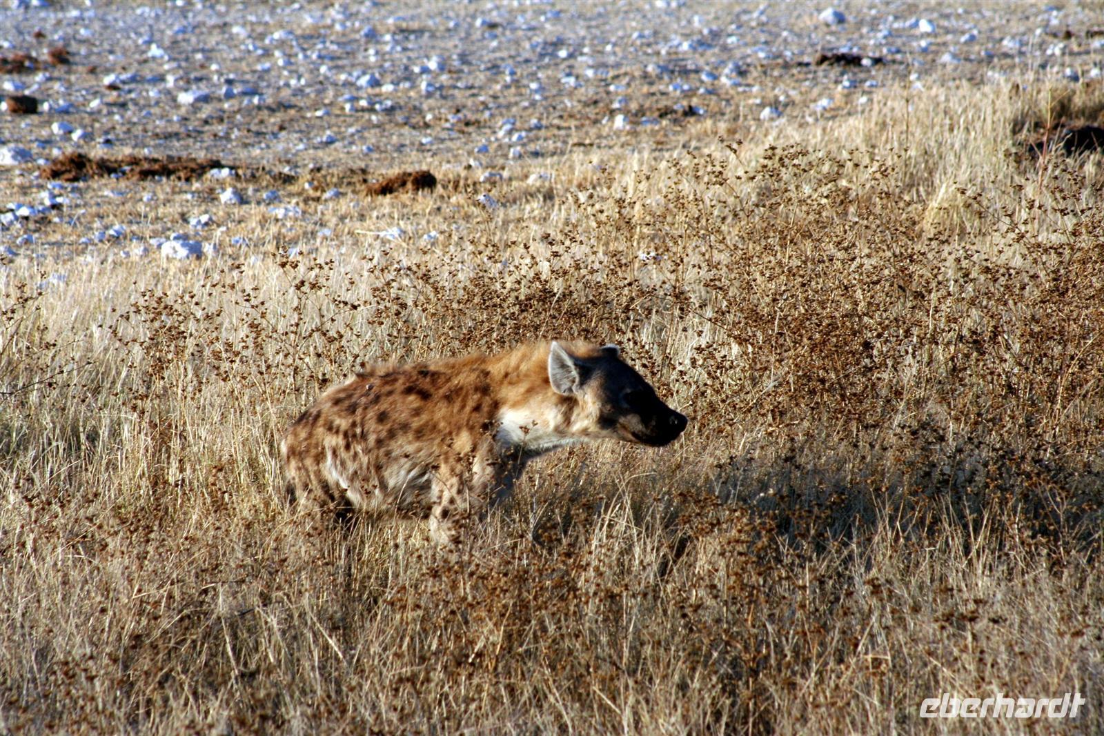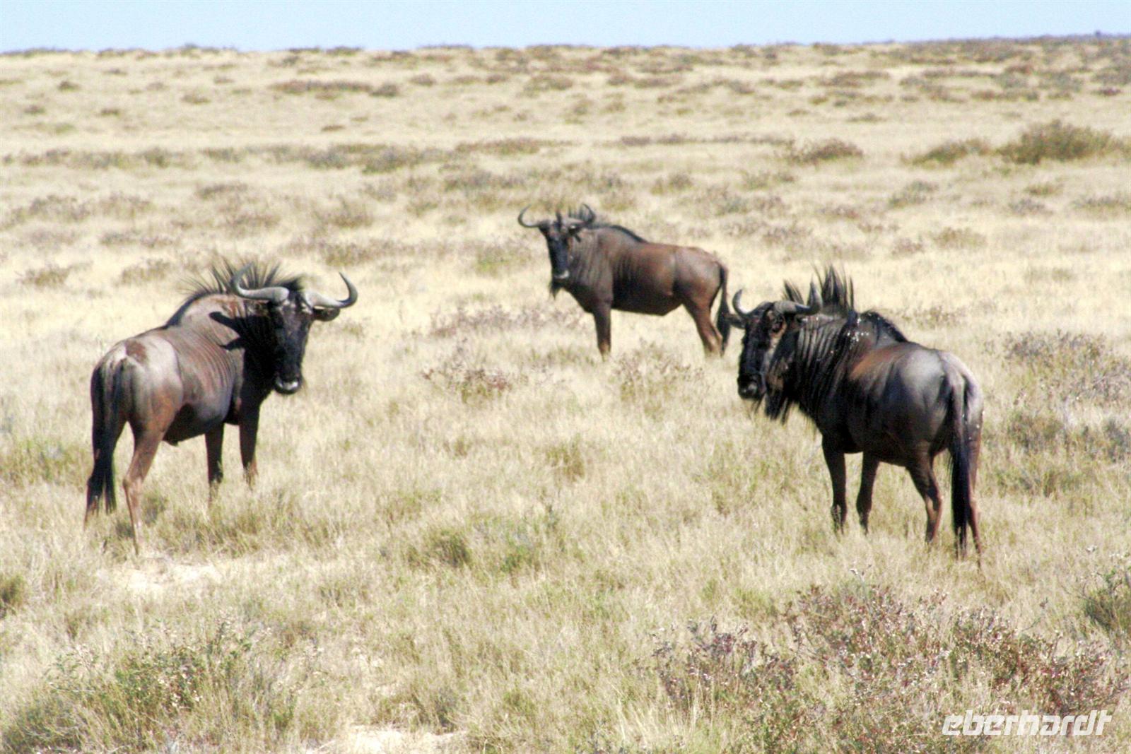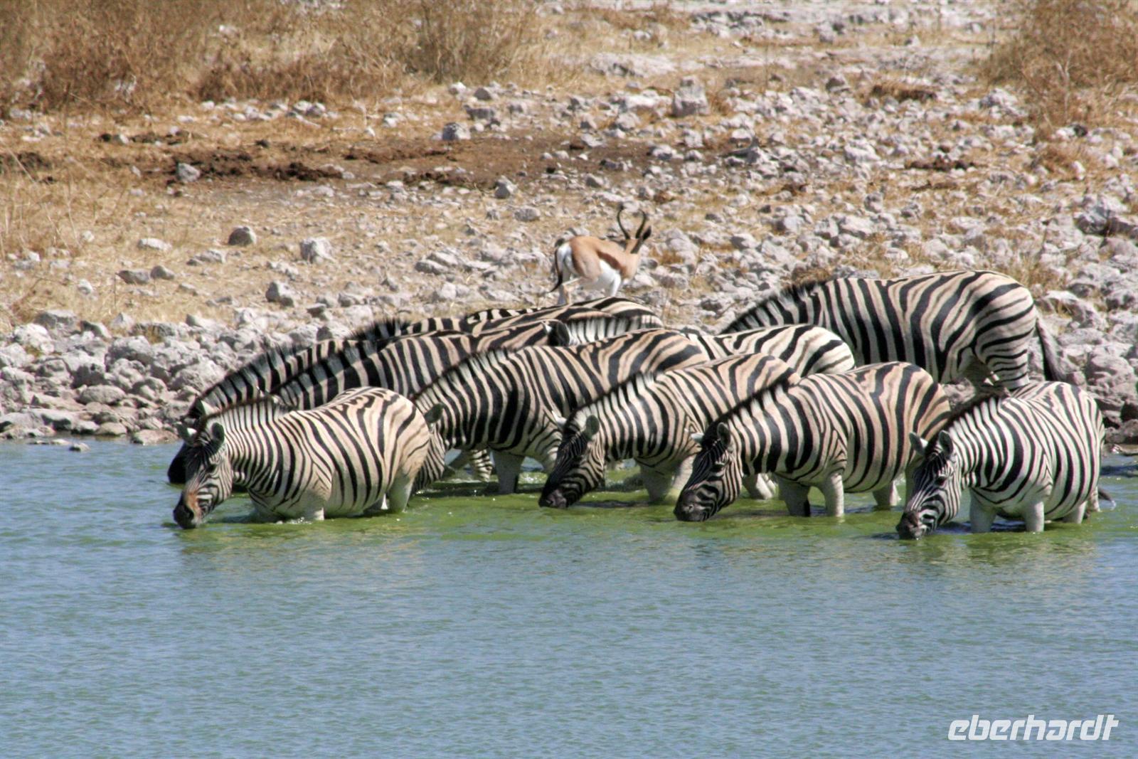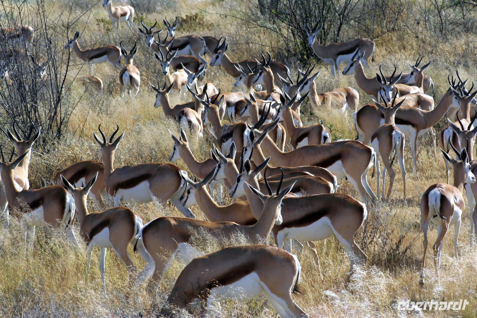 Wir beobachteten Tüpfelhyänen, Elefant, riesige Springbock- und Impalaherden, ein Löwenrudel unter Schattenbäumen, die dem leckeren Anblick vorbei ziehender, doch irritiert schauender Zebras widerstanden. Riesentrappen und Strauße durchstreiften den Busch und am westlichen Pfannenrand trafen sich unzählige Tiergruppen von Gnus, Zebras, Oryxen, Springböcken, Straußen.... zum gemeinsamen Entspannen. Am frühen Nachmittag waren wir im Camp zurück und liessen für heut die Seele baumeln. Der alte Turm wurde bestiegen, Postkarten geschrieben und im Pool gebadet, auch am Wasserloch gab es wieder einiges zu sehen.