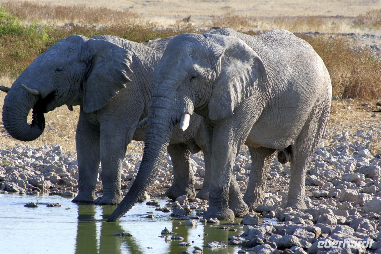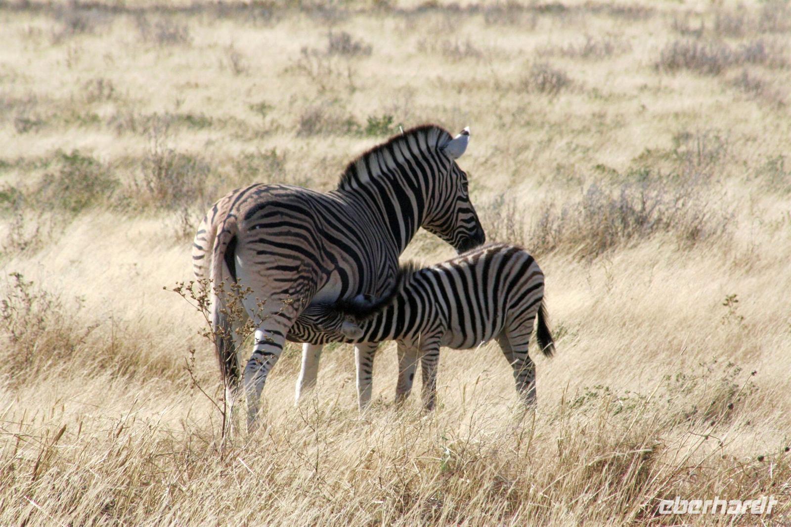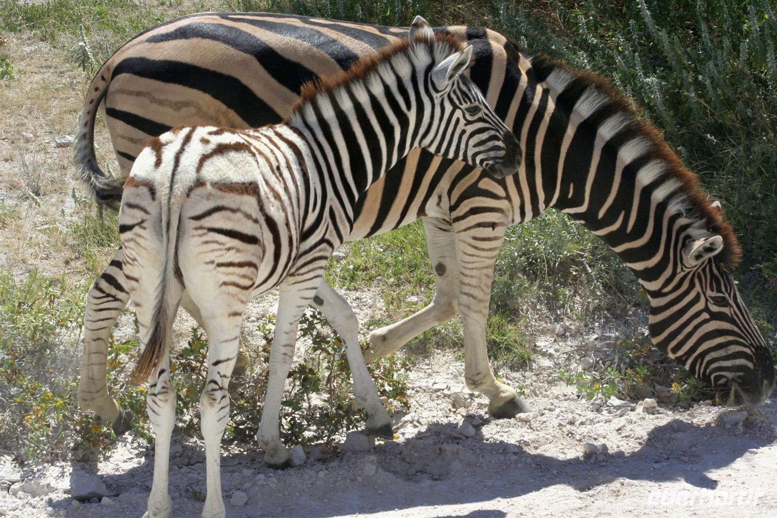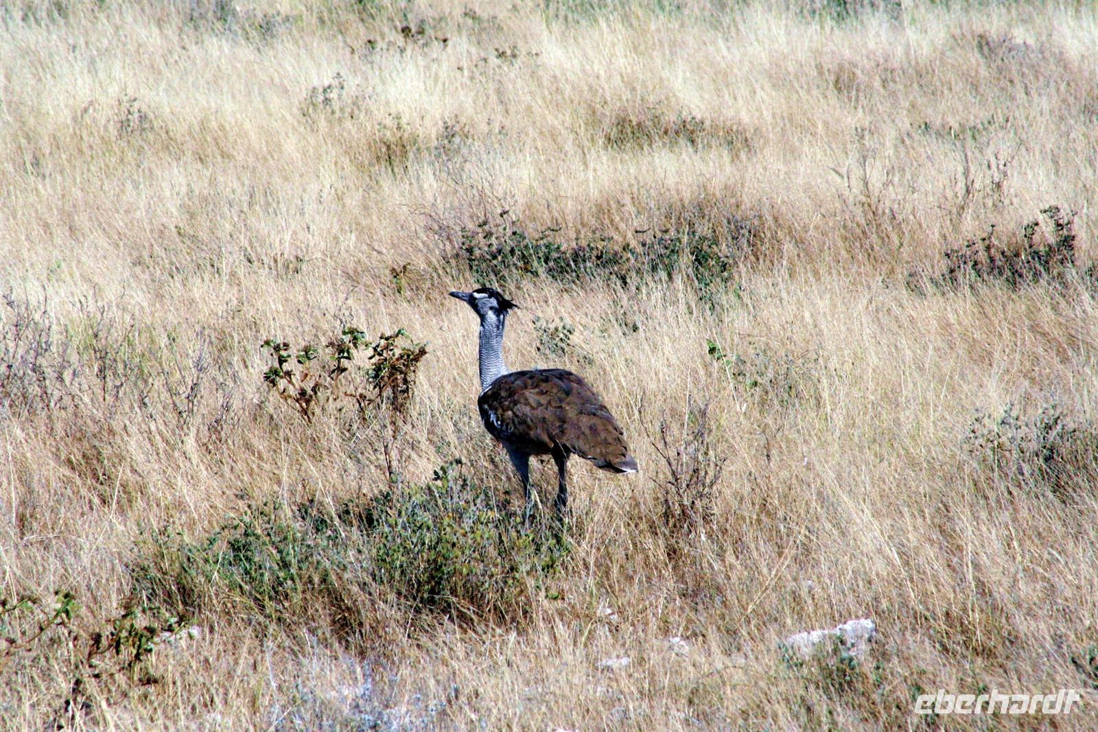 Wir beobachteten Tüpfelhyänen, Elefant, riesige Springbock- und Impalaherden, ein Löwenrudel unter Schattenbäumen, die dem leckeren Anblick vorbei ziehender, doch irritiert schauender Zebras widerstanden. Riesentrappen und Strauße durchstreiften den Busch und am westlichen Pfannenrand trafen sich unzählige Tiergruppen von Gnus, Zebras, Oryxen, Springböcken, Straußen.... zum gemeinsamen Entspannen. Am frühen Nachmittag waren wir im Camp zurück und liessen für heut die Seele baumeln. Der alte Turm wurde bestiegen, Postkarten geschrieben und im Pool gebadet, auch am Wasserloch gab es wieder einiges zu sehen.