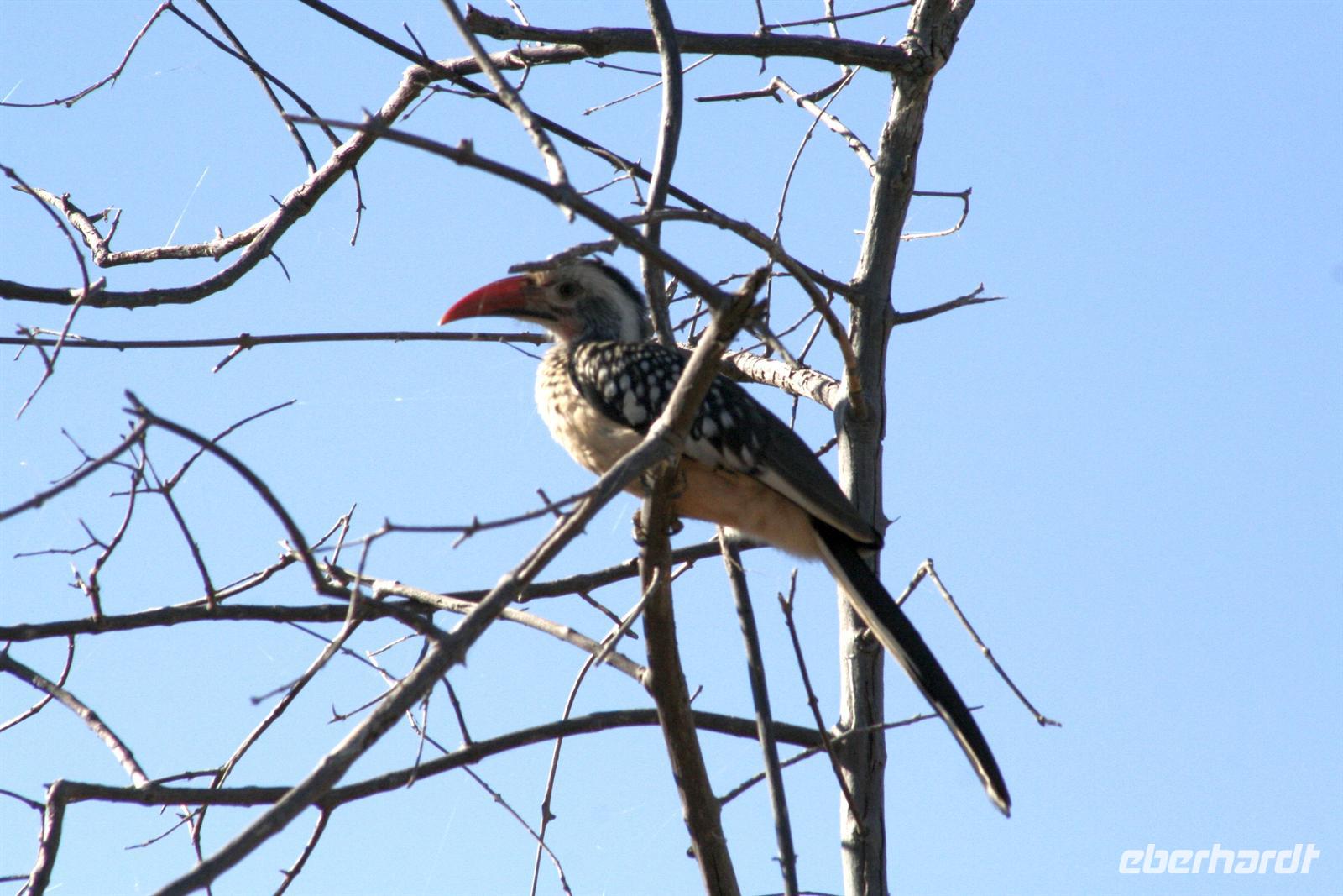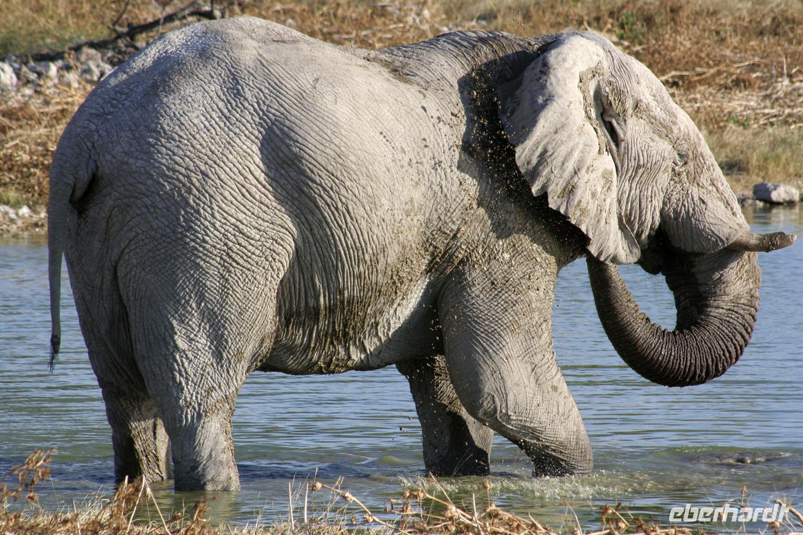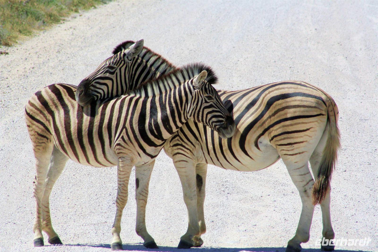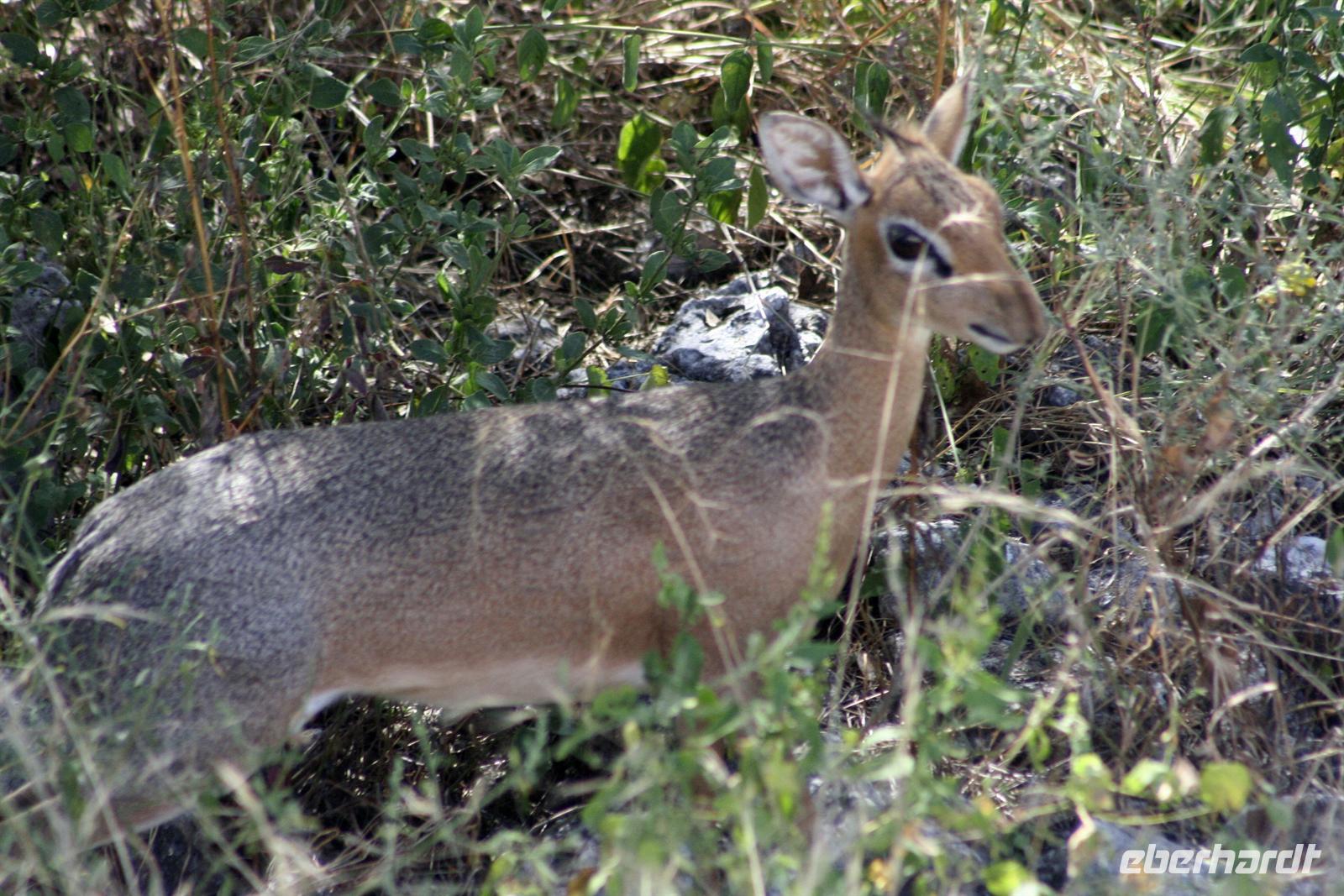 Wir beobachteten Tüpfelhyänen, Elefant, riesige Springbock- und Impalaherden, ein Löwenrudel unter Schattenbäumen, die dem leckeren Anblick vorbei ziehender, doch irritiert schauender Zebras widerstanden. Riesentrappen und Strauße durchstreiften den Busch und am westlichen Pfannenrand trafen sich unzählige Tiergruppen von Gnus, Zebras, Oryxen, Springböcken, Straußen.... zum gemeinsamen Entspannen. Am frühen Nachmittag waren wir im Camp zurück und liessen für heut die Seele baumeln. Der alte Turm wurde bestiegen, Postkarten geschrieben und im Pool gebadet, auch am Wasserloch gab es wieder einiges zu sehen.