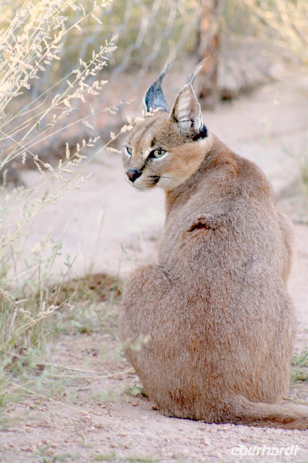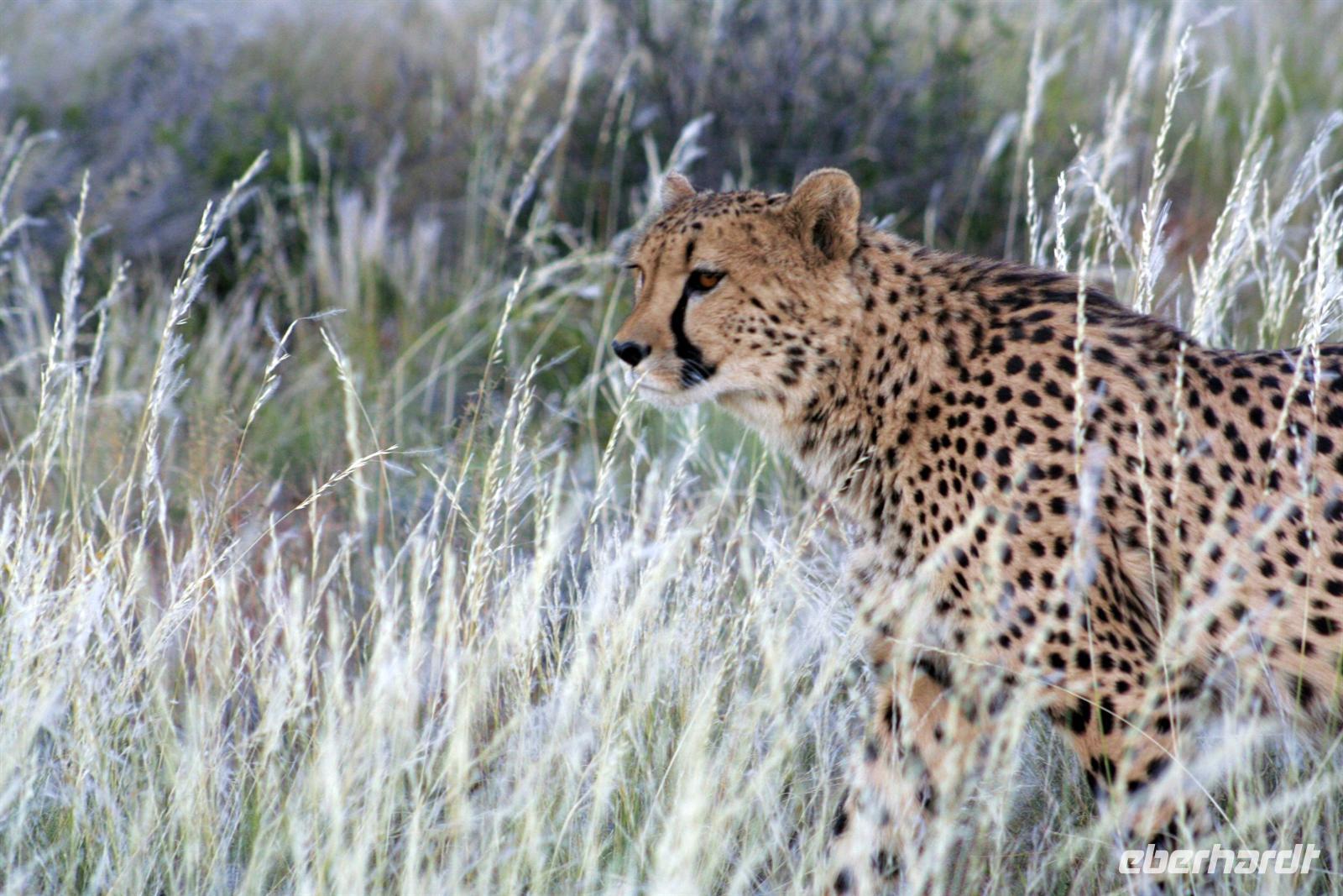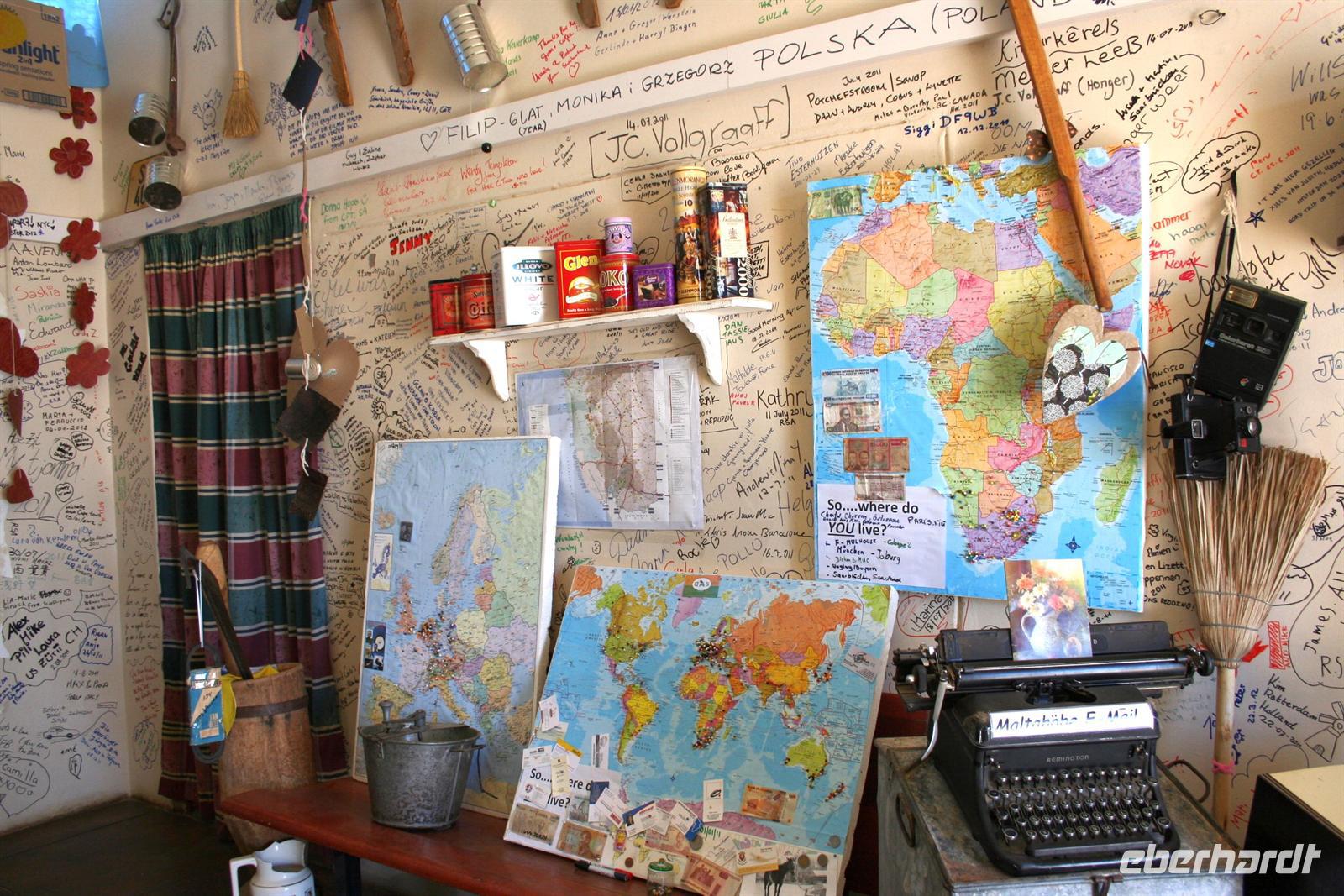Am nächsten Tag fuhren wir in den Namib Naukluft Park. Am "Verkehrsknotenpunkt" Maltahöhe, einer ehemaligen Station der deutschen Schutztruppe, machten wir halt und verewigten uns an der Wand des kleinen Cafes. In der "Hammerstein Lodge" angekommen, begrüßte uns "Daisy", ein zahmes Springbockmädchen ohne Hörner. Entspannt beschnupperte Daisy unsere Inge, nur mich konnte sie nicht leiden. Am Nachmittag gingen wir auf "Katzentour". Wir durchstreiften das Gelände und begegneten African Wildcats, dem Leopard "Susi" und einem Gepardenpaar, welches sich durch uns nicht stören liess.