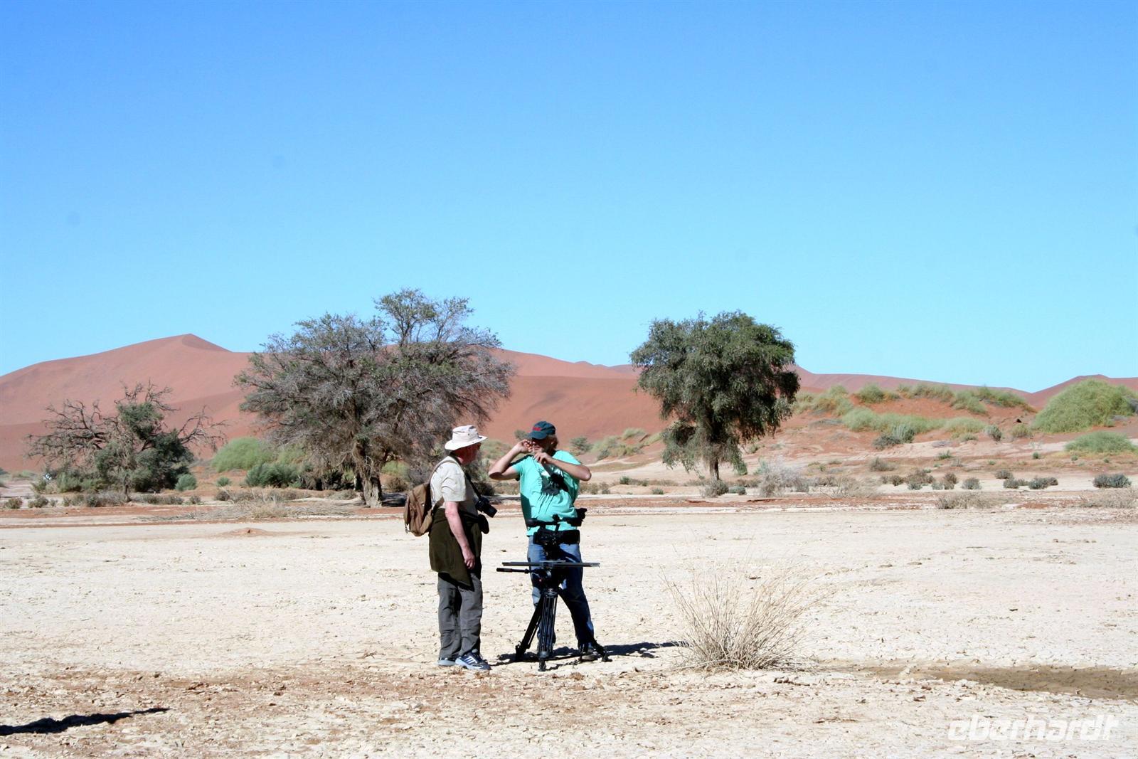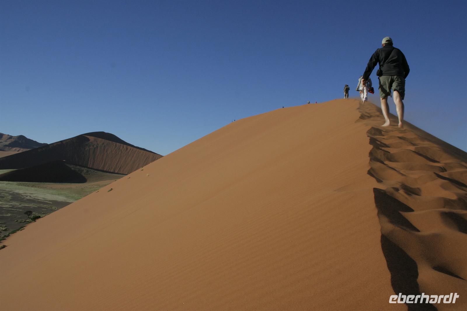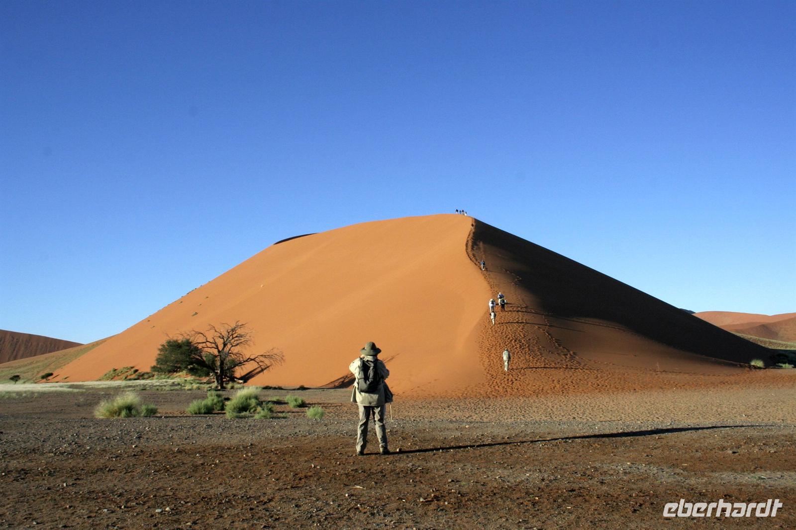 Am nächsten Morgen hieß es früh aufstehen. 5:30 Uhr starteten wir ins 60 km entfernte Sossusvlei. Am Eingang sahen wir unsere erste "WüstenSchlange", am Eingang zum Park. Da wir unser Permit bereits in der Tasche hatten, konnten wir diese umgehen und mußten uns nur der Kontrolle unterziehen. Im frühen Morgenlicht erstrahlen die hohen Dünen (bis ca. 400 m hoch) im satten Rot im Kontrast zum tiefblauen Himmel. Es entstanden fantastische Fotos. Zunächst erklommen einige, die nur ca. 100 m hohe Düne 45. Der Wind blies scharf von der Seite, so dass wir schon nach wenigen Metern "Sand im Getriebe" hatten. Doch die grandiose Aussicht auf das Dünenmeer belohnte uns. Nach dem rasanten Abstieg "gruben" wir die Klappstühle aus und frühstückten in einzigartiger Umgebung unter manch neidischer Blicke anderer. Später wechselten wir unser Fahrzeug, um durch sandigen Boden zur Lehmsenke, die noch mit Wasser gefüllt war, zu gelangen. Zur Mittagszeit leuchteten die Dünen nun in Orange. Die Sonne strahlte immer intensiver, dennoch wanderten wir zum Dead Vlei, wo jegliche Vegetation tot erschien. Mittlerweile blendete das Dünenmeer im grellen Gelb - ein fantastisches Farbenspiel. Noch schnell Namib-Sand geschaufelt, der später beim Zoll in Frankfurt ein Lächeln auf die Gesichter zauberte.