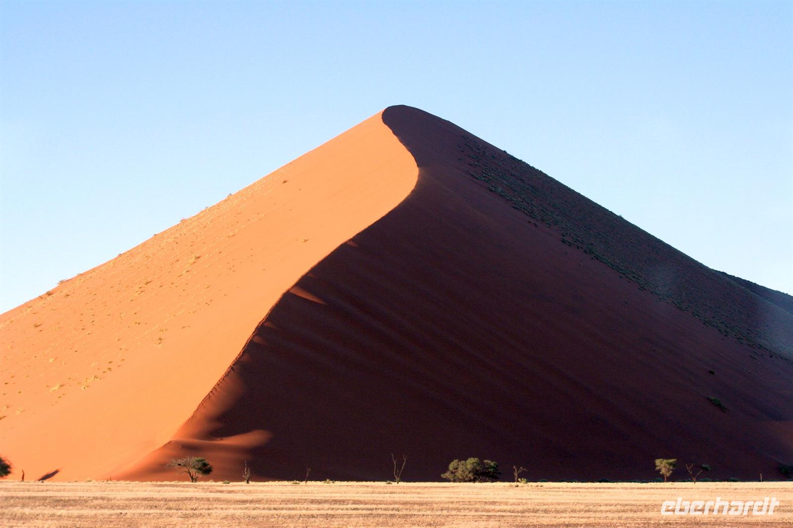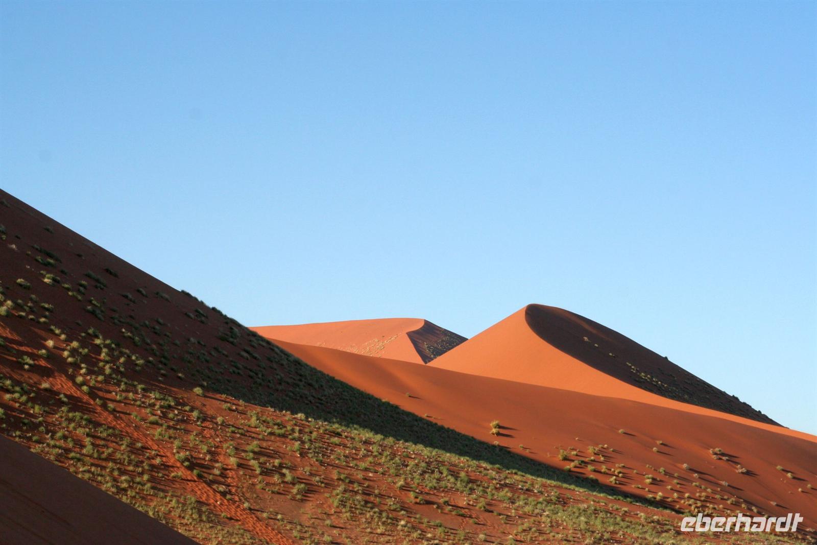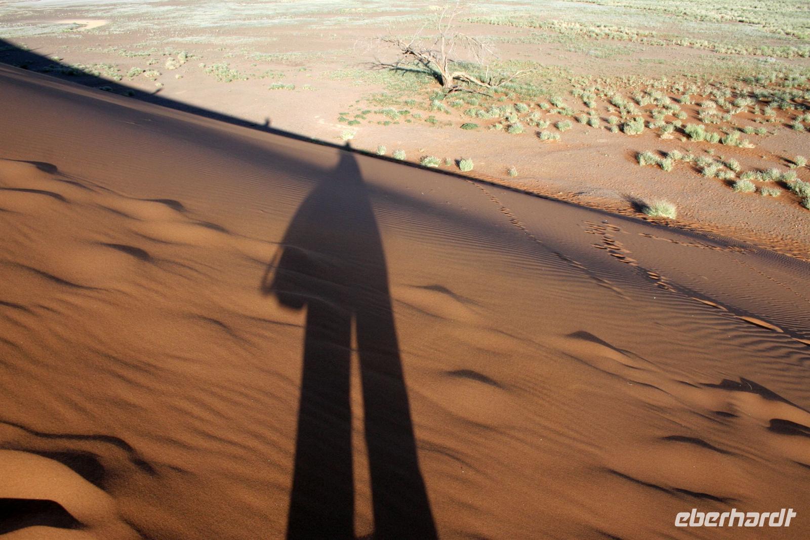 Am nächsten Morgen hieß es früh aufstehen. 5:30 Uhr starteten wir ins 60 km entfernte Sossusvlei. Am Eingang sahen wir unsere erste "WüstenSchlange", am Eingang zum Park. Da wir unser Permit bereits in der Tasche hatten, konnten wir diese umgehen und mußten uns nur der Kontrolle unterziehen. Im frühen Morgenlicht erstrahlen die hohen Dünen (bis ca. 400 m hoch) im satten Rot im Kontrast zum tiefblauen Himmel. Es entstanden fantastische Fotos. Zunächst erklommen einige, die nur ca. 100 m hohe Düne 45. Der Wind blies scharf von der Seite, so dass wir schon nach wenigen Metern "Sand im Getriebe" hatten. Doch die grandiose Aussicht auf das Dünenmeer belohnte uns. Nach dem rasanten Abstieg "gruben" wir die Klappstühle aus und frühstückten in einzigartiger Umgebung unter manch neidischer Blicke anderer. Später wechselten wir unser Fahrzeug, um durch sandigen Boden zur Lehmsenke, die noch mit Wasser gefüllt war, zu gelangen. Zur Mittagszeit leuchteten die Dünen nun in Orange. Die Sonne strahlte immer intensiver, dennoch wanderten wir zum Dead Vlei, wo jegliche Vegetation tot erschien. Mittlerweile blendete das Dünenmeer im grellen Gelb - ein fantastisches Farbenspiel. Noch schnell Namib-Sand geschaufelt, der später beim Zoll in Frankfurt ein Lächeln auf die Gesichter zauberte.