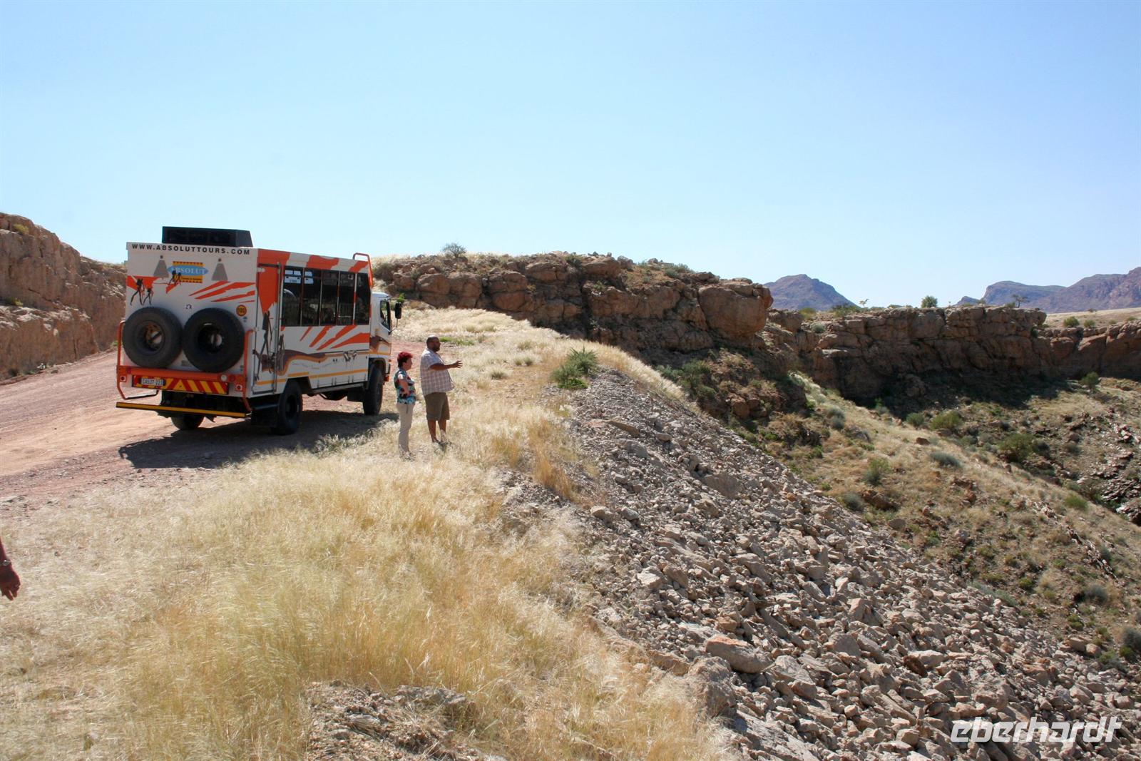 Heute fuhren wir durch das karge Naukluft Gebirge (über 1.000 m hoch). Die Pause in Solitaire ist ein Muß, um den frischen Apfelkuchen zu probieren und die putzigen Erdmännchen zu beobachten. Ein Tankstopp wäre hier ein Risiko, da man nie genau weiß, ob Sprit vorhanden.