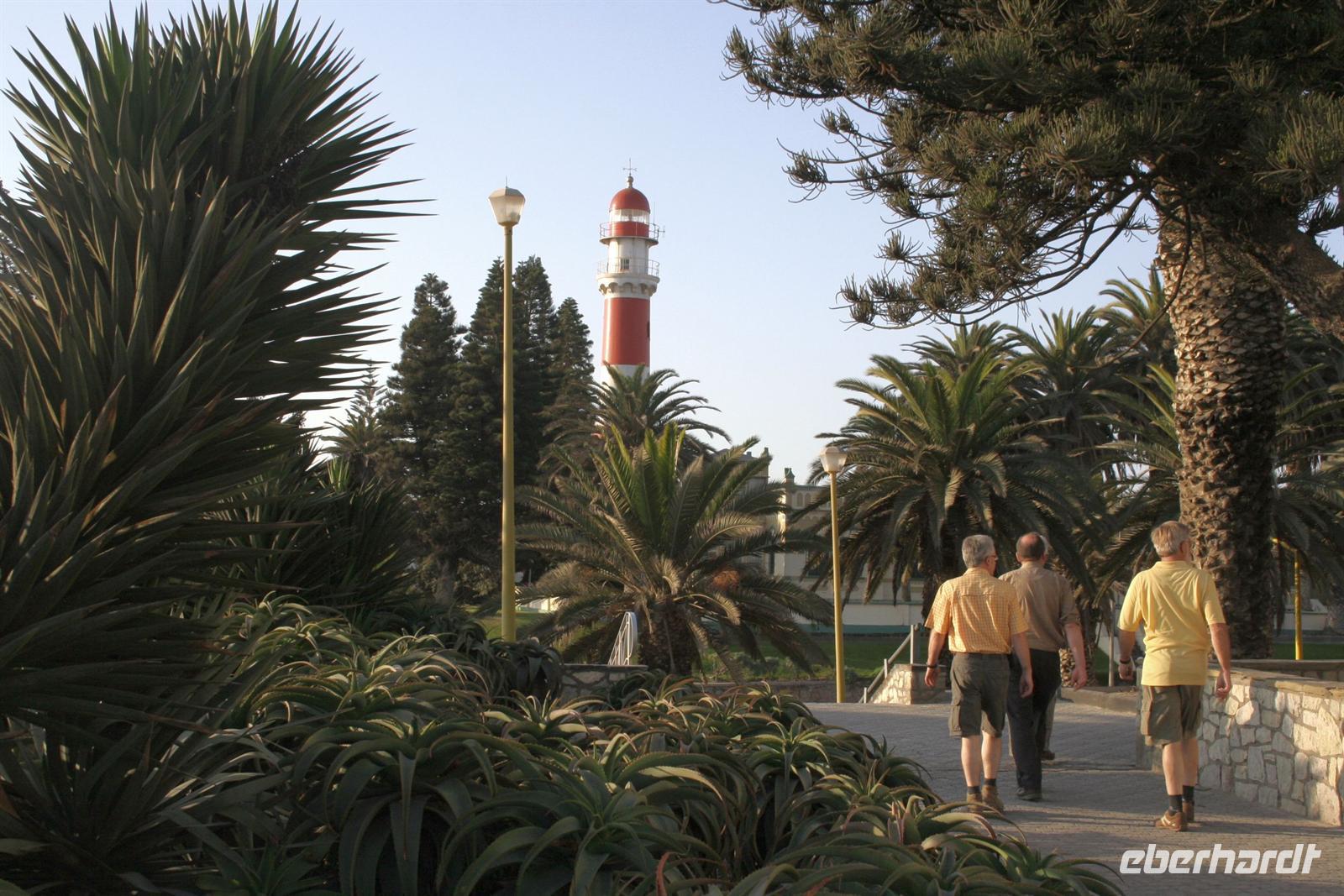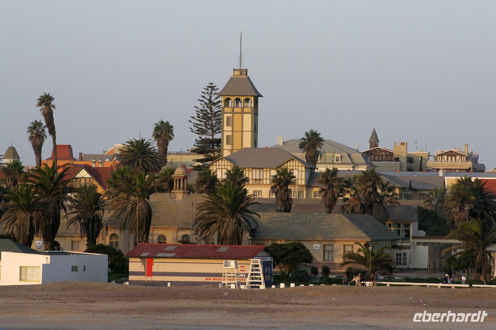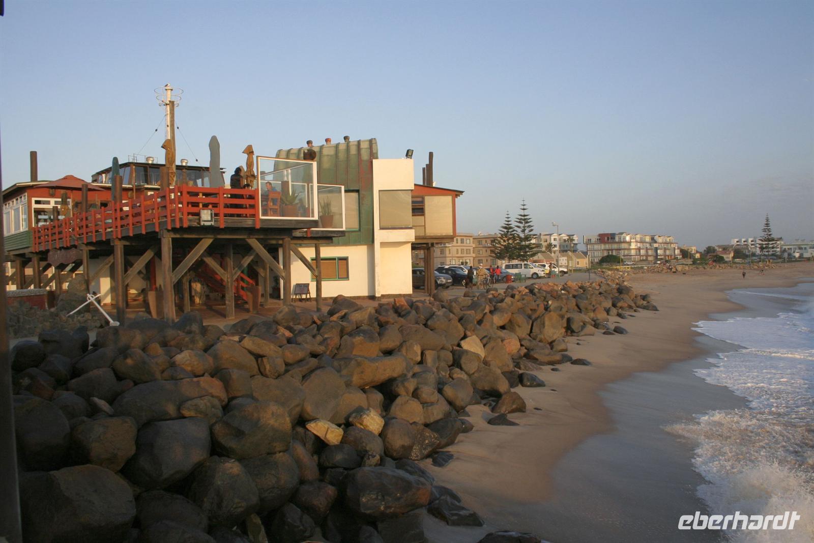 Besonders das Robbenmädchen "Bubble" hatte uns es uns angetan und folgte aufmerksam den Informationen über die Bucht und die Austernzucht. Wir genossen den lohnenden Ausflug mit allen Sinnen. Zwischendurch wurden wir mit Kaffee, Tee, Sherry und Sekt und kleinen Leckereien bewirtet. Natürlich probierten wir auch frische Austern. Eine Handvoll Franzosen stürzte sich ungeniert auf die Delikatesse, als ob sie sich die letzten Tage nur von Wasser ernähren mußten. Am Nachmittag begann unsere Entdeckungstour durch Swakopmund, dem Küstenstädtchen mit deutscher Vergangenheit: Woermann-Haus mit Damaraturm, Bahnhof, "Ritterburg", Altes Amtsgericht, Leuchtturm, Hohenzollern-Haus und Prinzessin-Rupprecht-Haus. Später trafen wir uns an der "Jetty", der alten Seebrücke am Atlantik und erlebten den Sonnenuntergang bei einem Glas Rotwein. Zum Abendessen waren wir Gäste im urigen Restaurant "The Tug", direkt an der Beach.