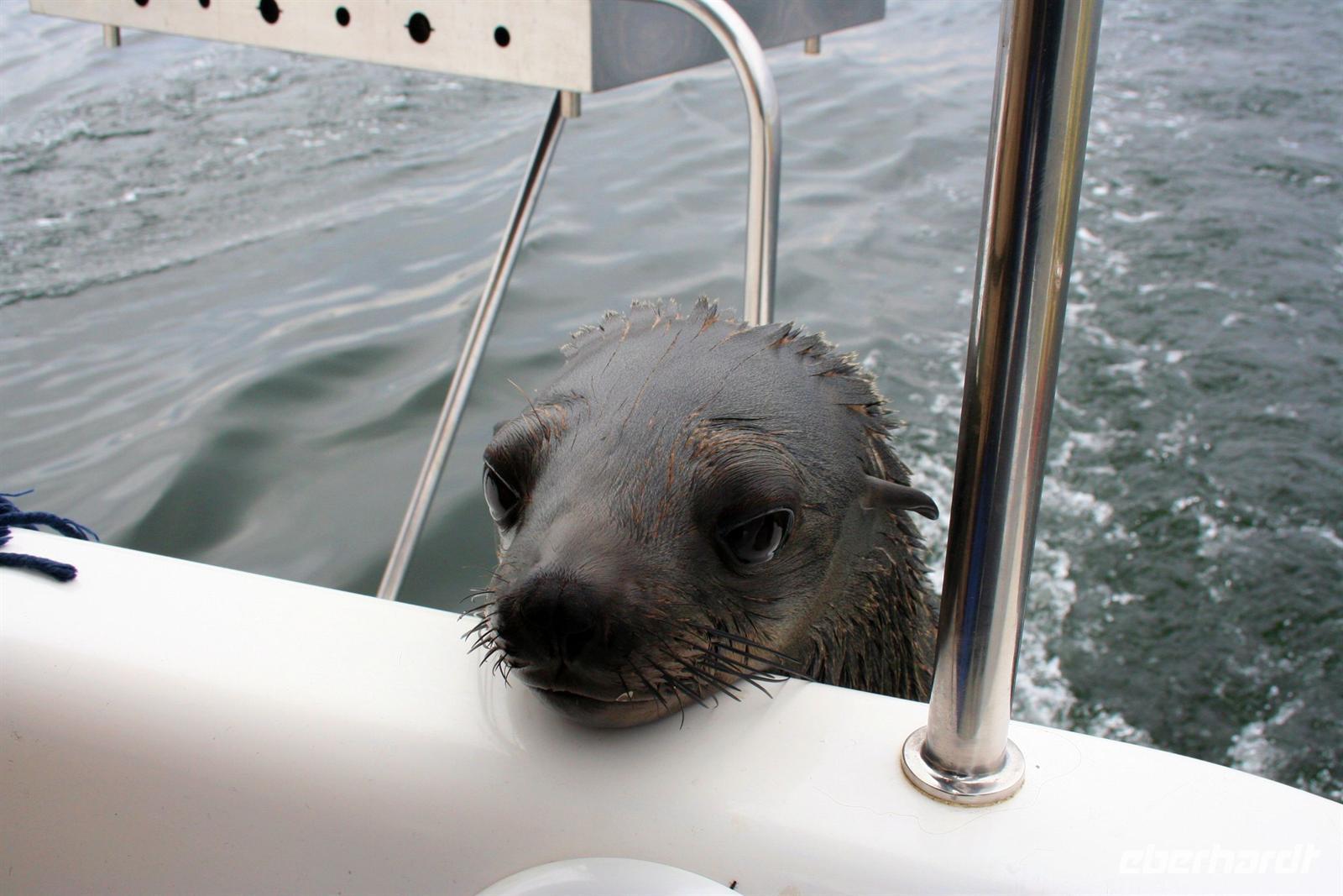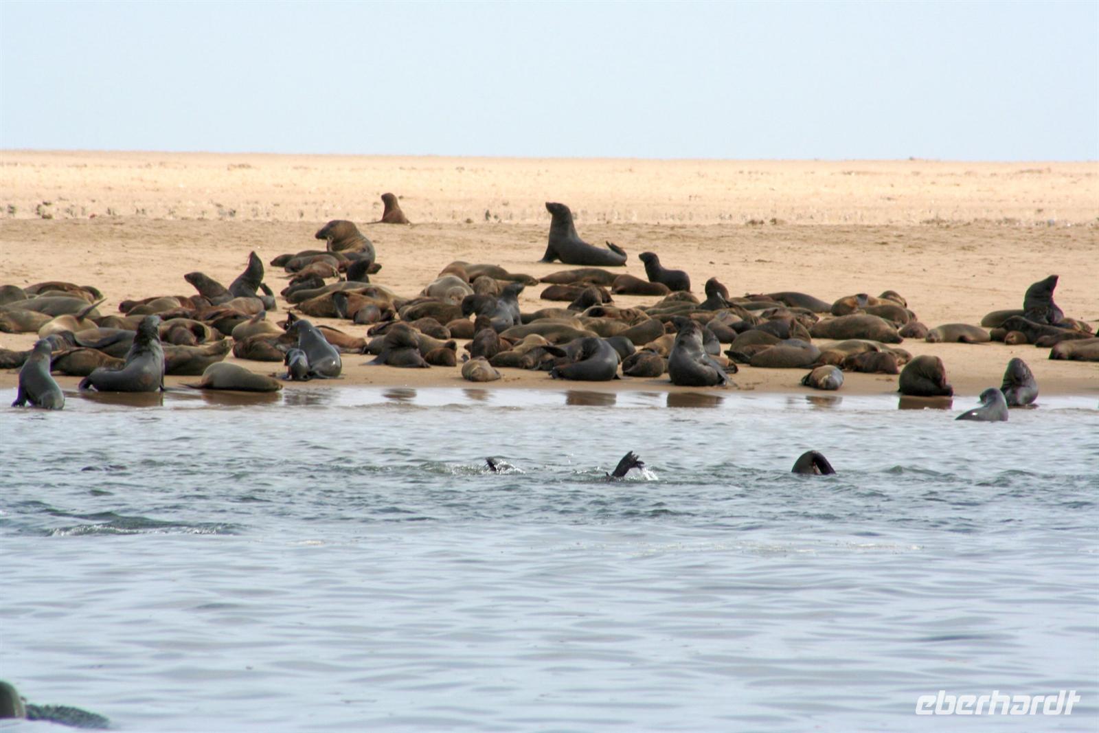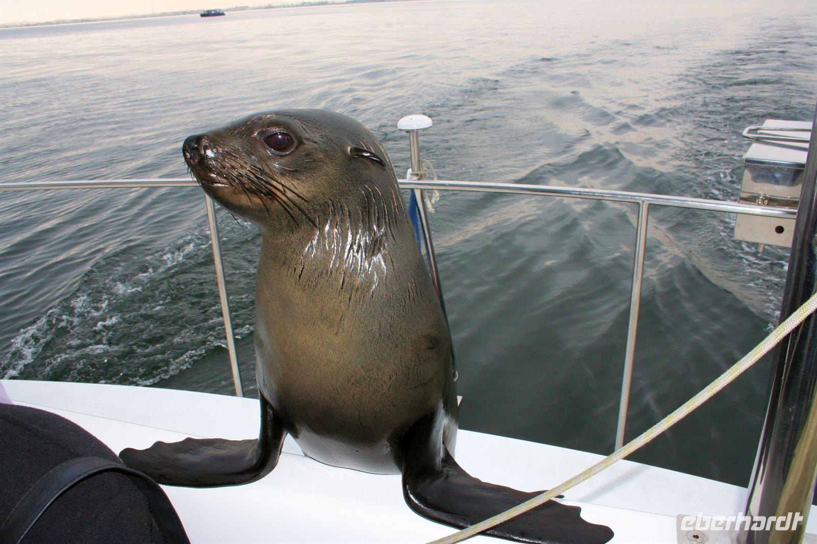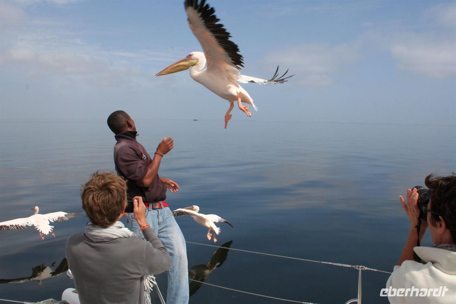 Unterwegs passierten wir den südlichen Wendekreis des Steinbocks (Tropic of capricorn). An diesem Punkt strahlt die Sonne am 21. Dezember jeden Jahres senkrecht auf die Erde, dass kein Schatten entsteht. Eine landschaftlich rauhe, aber wunderschöne Strecke führte uns über den Gaub Pass (knapp 800 m hoch) und durch den Kuiseb Canyon, wo sich Prof. Dr. Henno Martin (Geologe und Autor des Bestsellers "Wenn es Krieg gibt, gehen wir in die Wüste") während des 2. Weltkriegs versteckt hielt. Am Nachmittag erreichten wir Swakopmund und genossen die freie Zeit in unserem komfortablen Hotel an der stürmischen Atlantikküste. Zu Abend speisten wir a la Carte bei Hardy im "Driftwood". Der nächste Tag stand im Zeichen von Walvis Bayund Swakopmund. Am Vormittag unternahmen wir eine Ausfahrt mit dem Catamaran durch die Lagune von Walvis Bay inklusive "blinder" Passagiere an Bord. Wir machten die Bekanntschaft mit zutraulichen Ohrenrobben, Pelikanen, Komoranen, riesigen Möwen und Benguela Delphinen.
