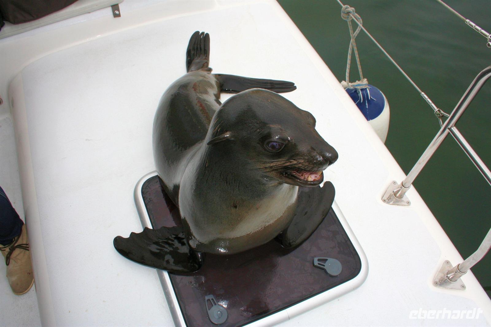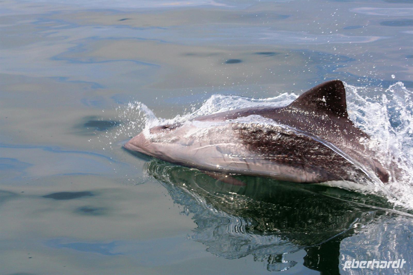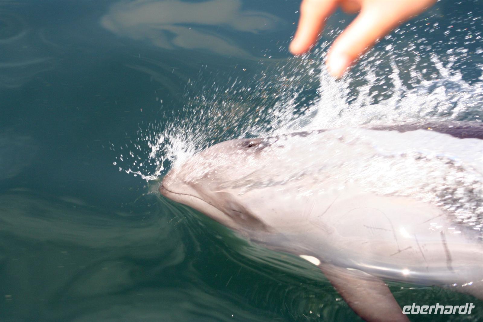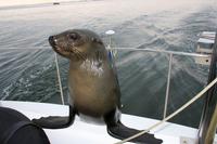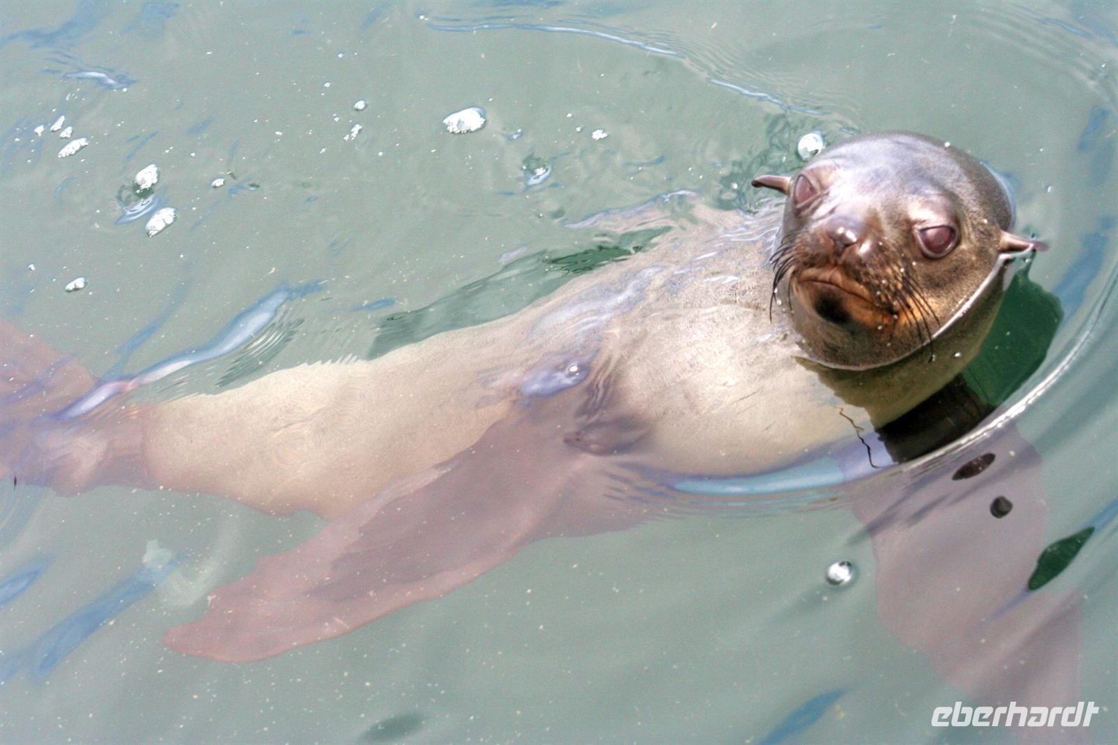 Unterwegs passierten wir den südlichen Wendekreis des Steinbocks (Tropic of capricorn). An diesem Punkt strahlt die Sonne am 21. Dezember jeden Jahres senkrecht auf die Erde, dass kein Schatten entsteht. Eine landschaftlich rauhe, aber wunderschöne Strecke führte uns über den Gaub Pass (knapp 800 m hoch) und durch den Kuiseb Canyon, wo sich Prof. Dr. Henno Martin (Geologe und Autor des Bestsellers "Wenn es Krieg gibt, gehen wir in die Wüste") während des 2. Weltkriegs versteckt hielt. Am Nachmittag erreichten wir Swakopmund und genossen die freie Zeit in unserem komfortablen Hotel an der stürmischen Atlantikküste. Zu Abend speisten wir a la Carte bei Hardy im "Driftwood". Der nächste Tag stand im Zeichen von Walvis Bayund Swakopmund. Am Vormittag unternahmen wir eine Ausfahrt mit dem Catamaran durch die Lagune von Walvis Bay inklusive "blinder" Passagiere an Bord. Wir machten die Bekanntschaft mit zutraulichen Ohrenrobben, Pelikanen, Komoranen, riesigen Möwen und Benguela Delphinen.
