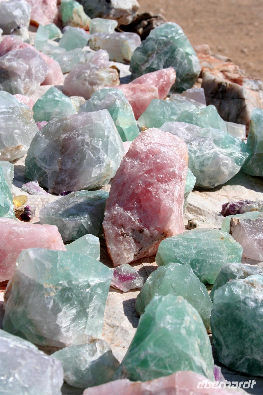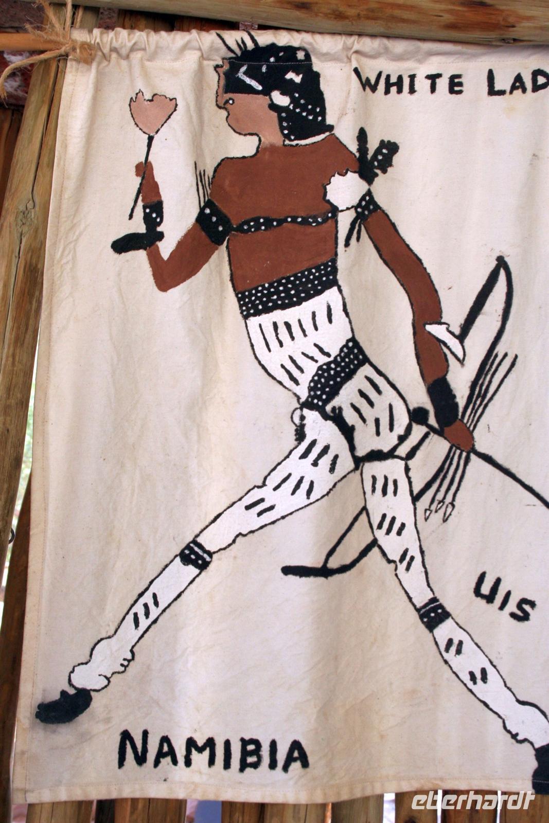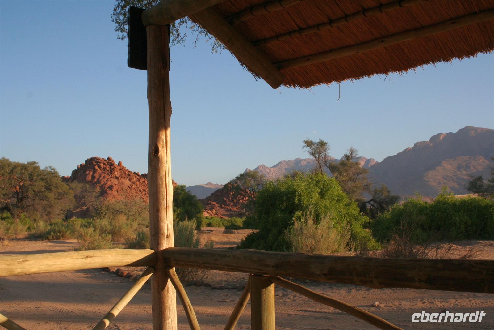 Unterwegs sahen wir in der Ferne die markanten Granitfelsen der Spitzkoppe und stoppten an den provisorischen Verkaufsständen der Damaras am Straßenrand, wo uns wunderschöne Steine (Quarze, Amethyste, Turmaline, Aquamarin) für kleines Geld aus den Minen rund um Uis feil geboten wurden. Am Fuße des Brandbergs(Königstein, der Gipfel mit 2.574 m höchste Erhebung Namibias) picknickten wir unter einem Schattenbaum. Auf die anspruchsvolle Wanderung zu den Felsmalereien, deren bekannteste die "White Lady" (eigentlich ein Mann) darstellt, verzichteten wir aufgrund der großen Hitze lieber. Die "Brandberg White Lady Lodge" war unser heutiges Ziel, wo wir in urigen Steinhäuschen übernachteten. Nur ohrenbetäubende Stille begleitete uns durch die sternenklare Nacht.