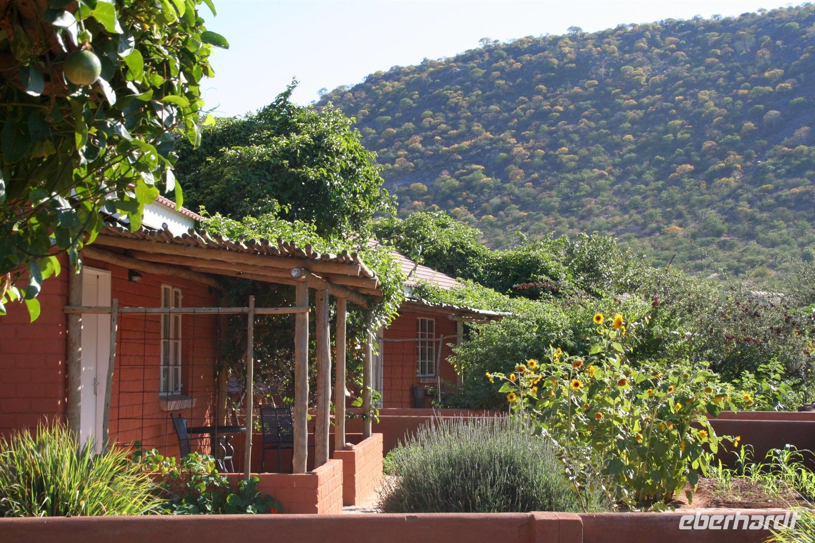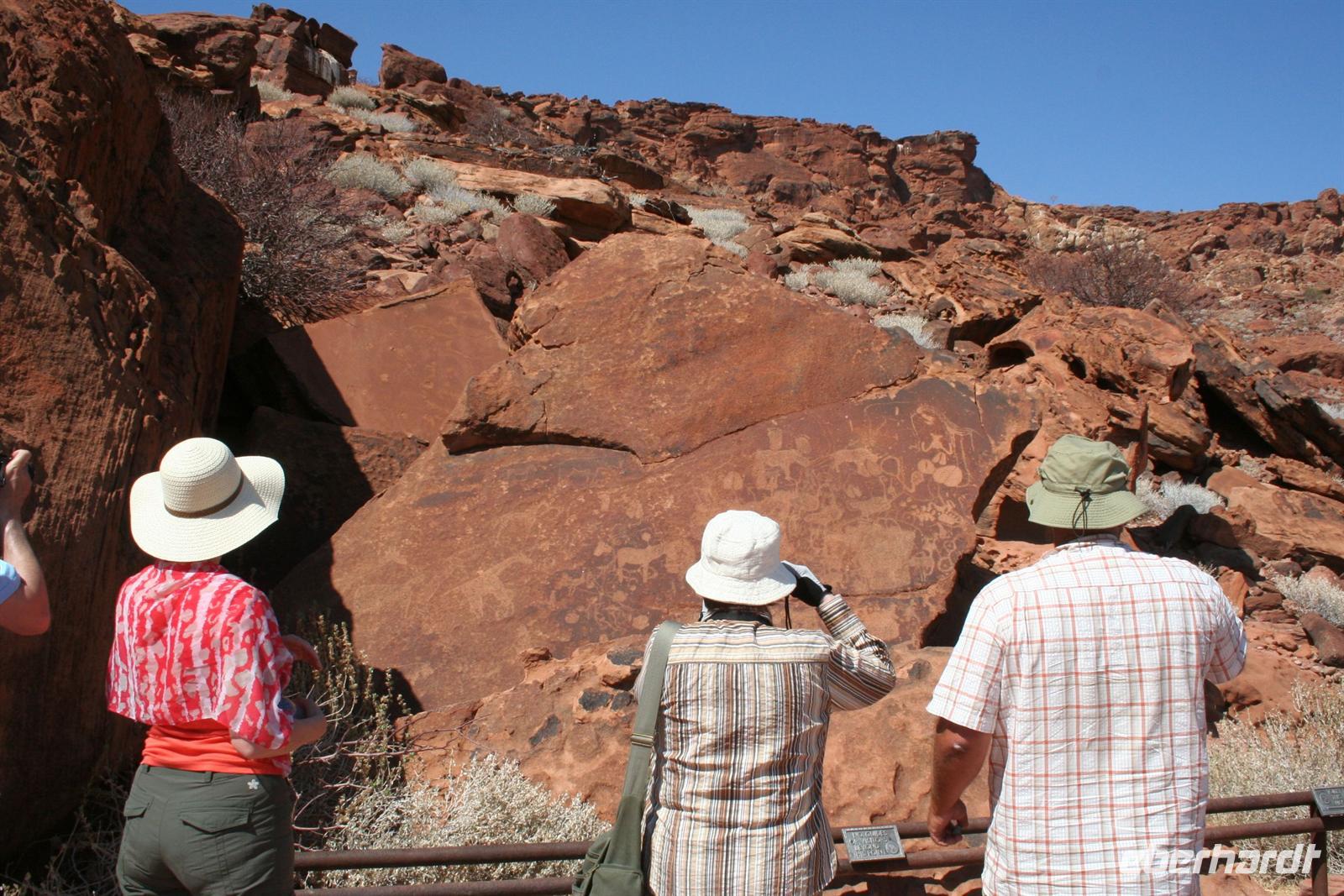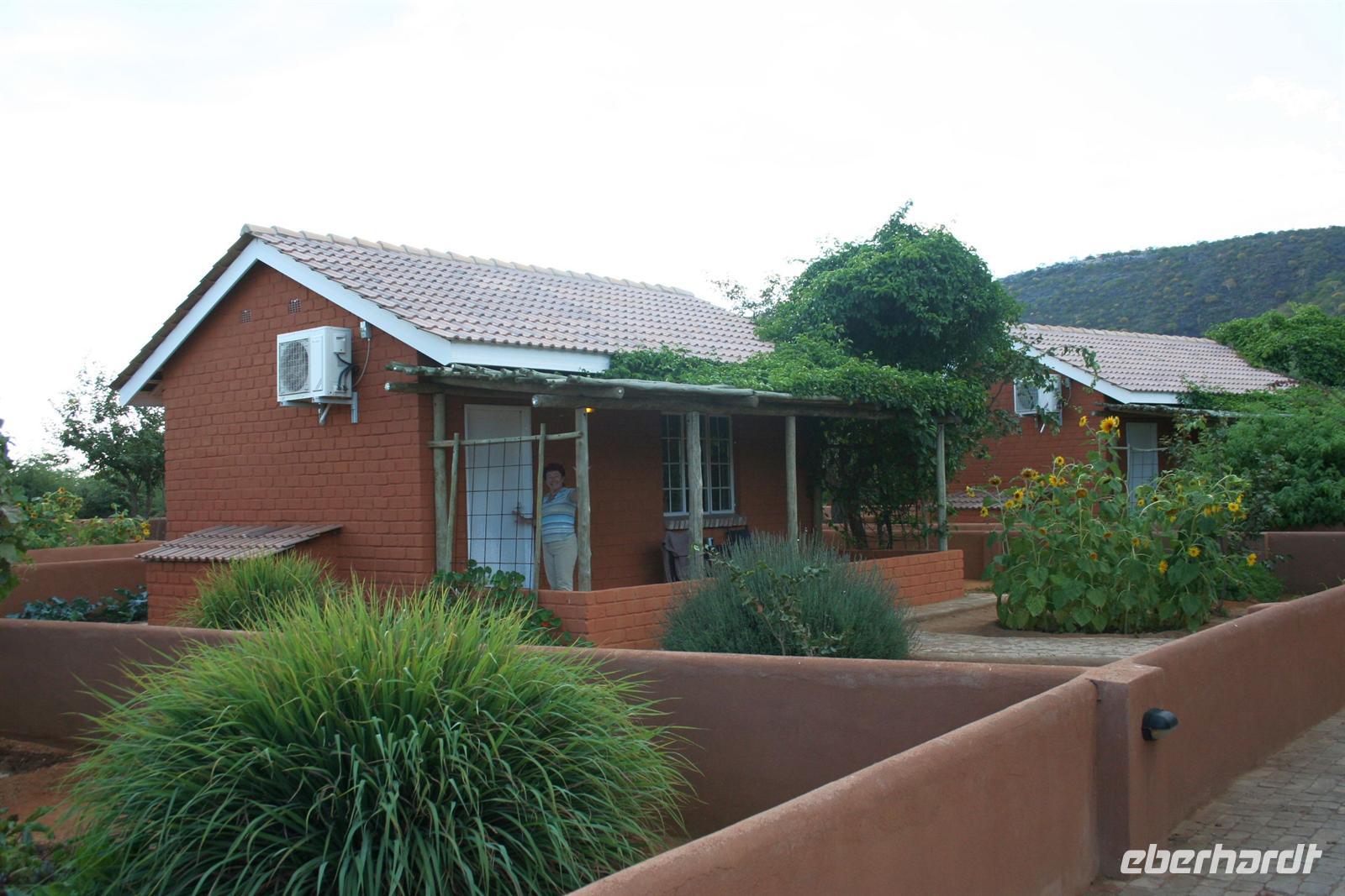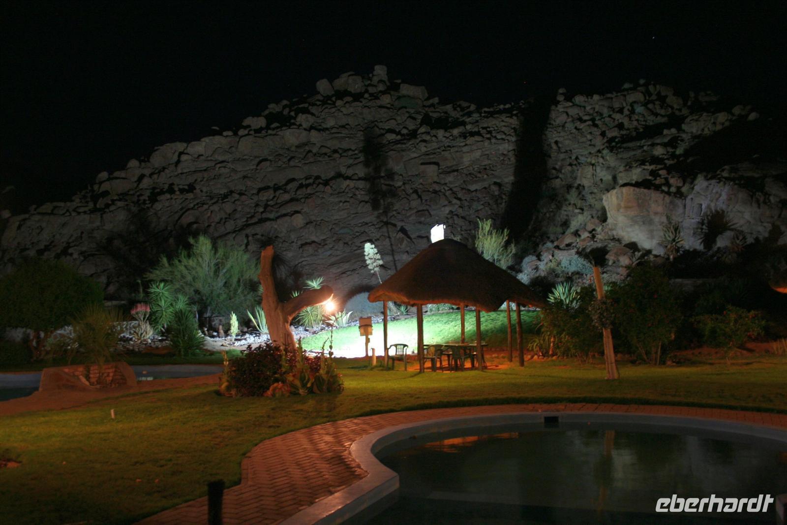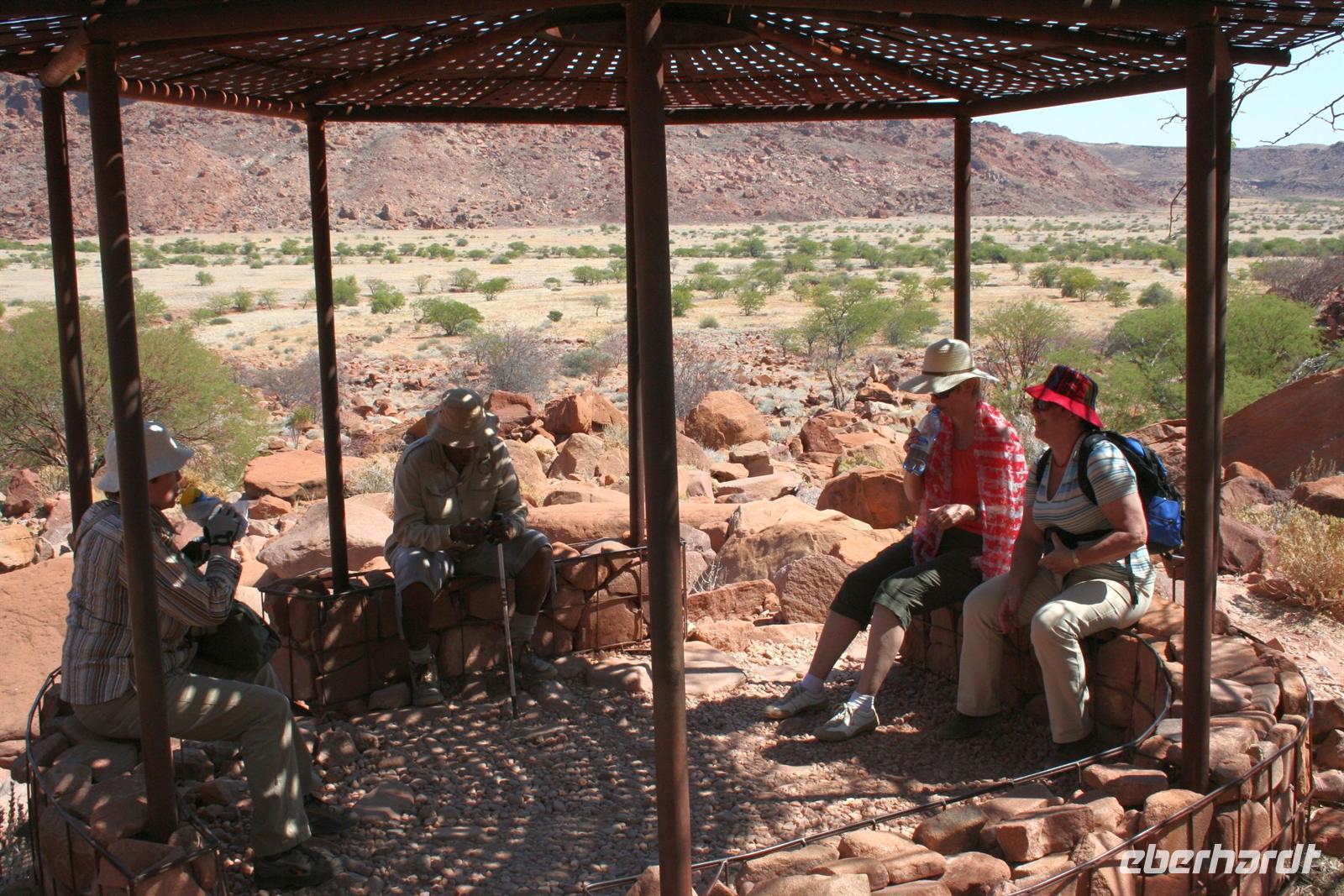 Nach dem lustigen Frühstück mit dem zahmen Nachfolger von Carlos, der im Erdmännchenhimmel sitzt, ging es weiter. Unterwegs besuchten wir die bunten Stände der ebenso farbenfroh gekleideten Herero-Frauen. In Twyfelfontein(zweifelhafte Quelle) erwartete uns Annelies, eine Nama, die uns auf dem Rundweg zu den Felsgravuren begleitete und uns viel Interessantes erzählte. In einem trockenen Flussbett picknickten wir gemütlich, bevor wir über hucklige Schotterpisten Khorixas gerade noch erreichten. An der Tankstelle mußten wir einen unplanmäßigen Stopp einlegen und einen Reifen wechseln. Anschließend wurden wir in der wunderschönen, sehr gepflegten "Damara Mopane Lodge" auf Deutsch empfangen. In dieser grünen Oase fühlten wir uns sofort wohl und bezogen unsere komfortablen "Lauben" mit eigenen Vorgärten. Auch das Abendessen war ein Genuss.