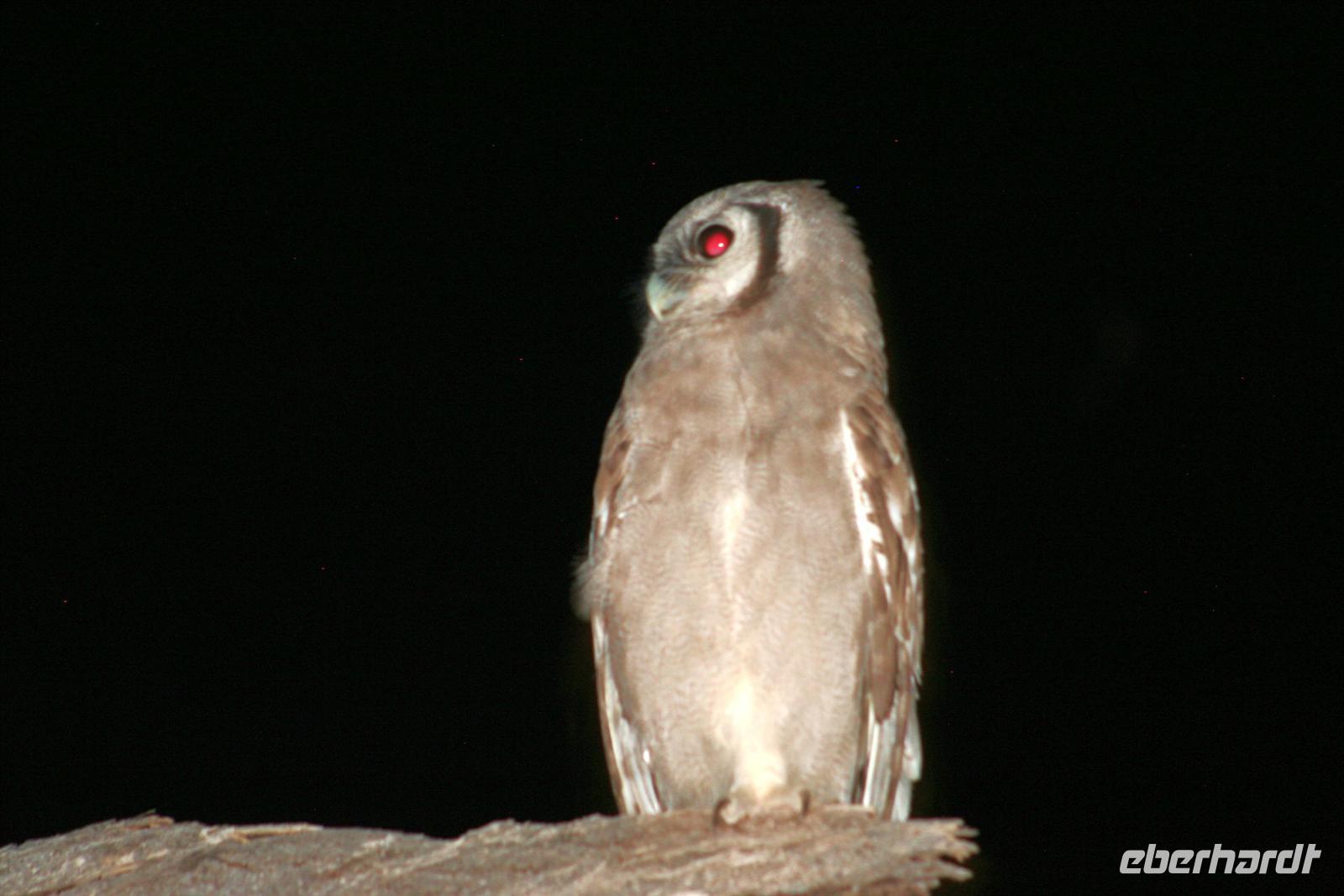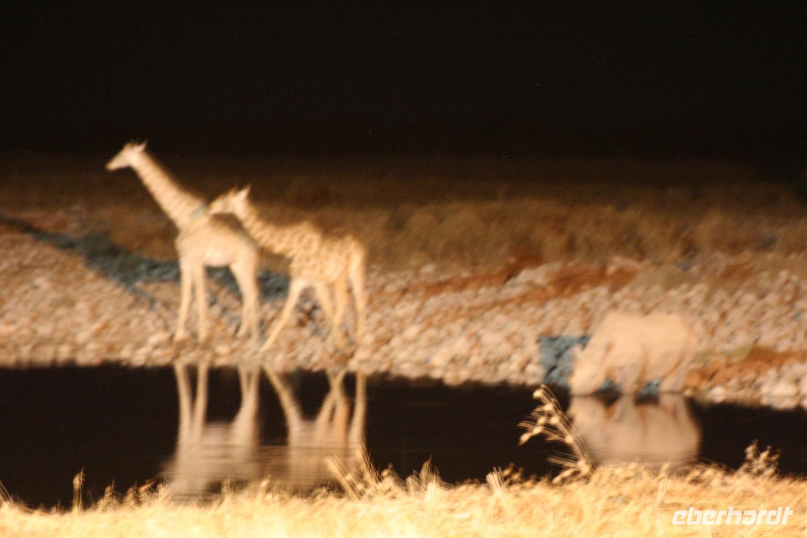 Am Anderson-Gate, dem westlichen Eingang zum Etosha NP, schlugen wir unsere mobile "Versorgungsstation" auf und stärkten uns beim mittlerweile obligatorischen Picknick. Anschließend ging es auf eine erste kleine Pirschfahrt. Wir wurden von Giraffen, Zebras, Gnus und Springböcken begrüßt, die sich am Wasserloch ein Stell-Dich-ein gaben. Am Nachmittag erreichten wir das "Okaukuejo Restcamp", unser Quartier für die nächsten beiden Tage. Nachdem wir uns "häuslich" eingerichtet hatten, spazierten wir zum Wasserloch. Trotz Mittagshitze herrschte emsiges Treiben: Giraffen, Elefanten, Zebras und anderes Wild gaben sich die "Klinke in die Hand" und wir brauchten einfach nur da zu sitzen und zu schauen. Nach dem Abendessen besuchten wir noch einmal das Wasserloch - WOW, wieder großes Kino: Elefanten, Nashörner, Zebras tauchten in der Dunkelheit auf - alle schauten begeistert auf die spannenden Szenen am beleuchteten Wasserloch. Nur das Klicken der Fotoapparate und das leise "Gluckern" unseres Rotweinfässchen drang durch die Stille der Nacht. Ein tolles Abendprogramm zu unserem Bergfest! Als wir Mitternacht gehen wollten, hörten wir Warnlaute der Zebras - irgendwas war im Anmarsch. Wir harrten fast regungslos, als plötzlich ein Löwenrudel kam. 4 Löwinnen stillten ihren Durst. Ein absolutes Highlight, auch die Eule im Baum war sprachlos. Am nächsten Morgen standen wir früh auf, um auf Pirschfahrt durch den Park zu gehen.