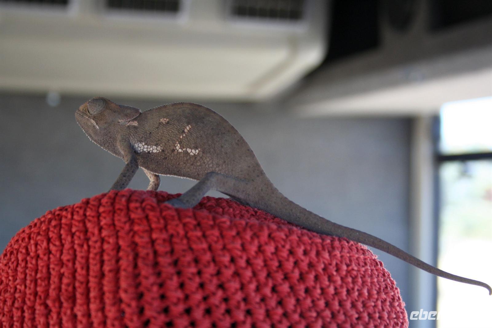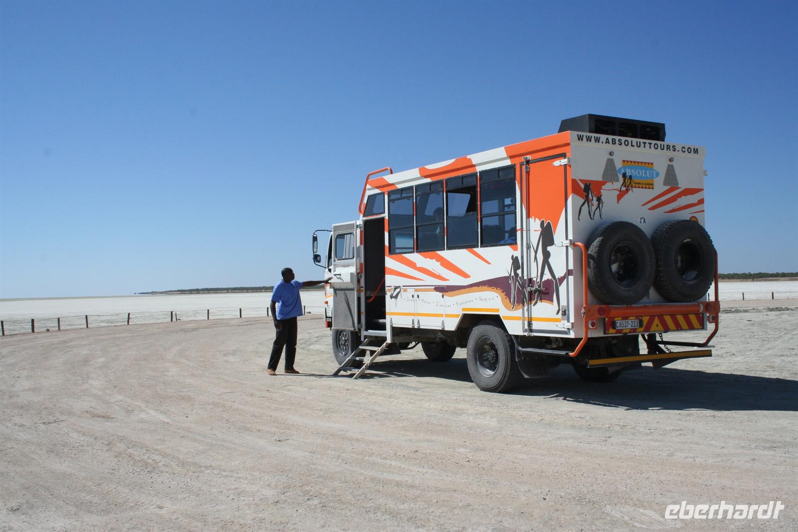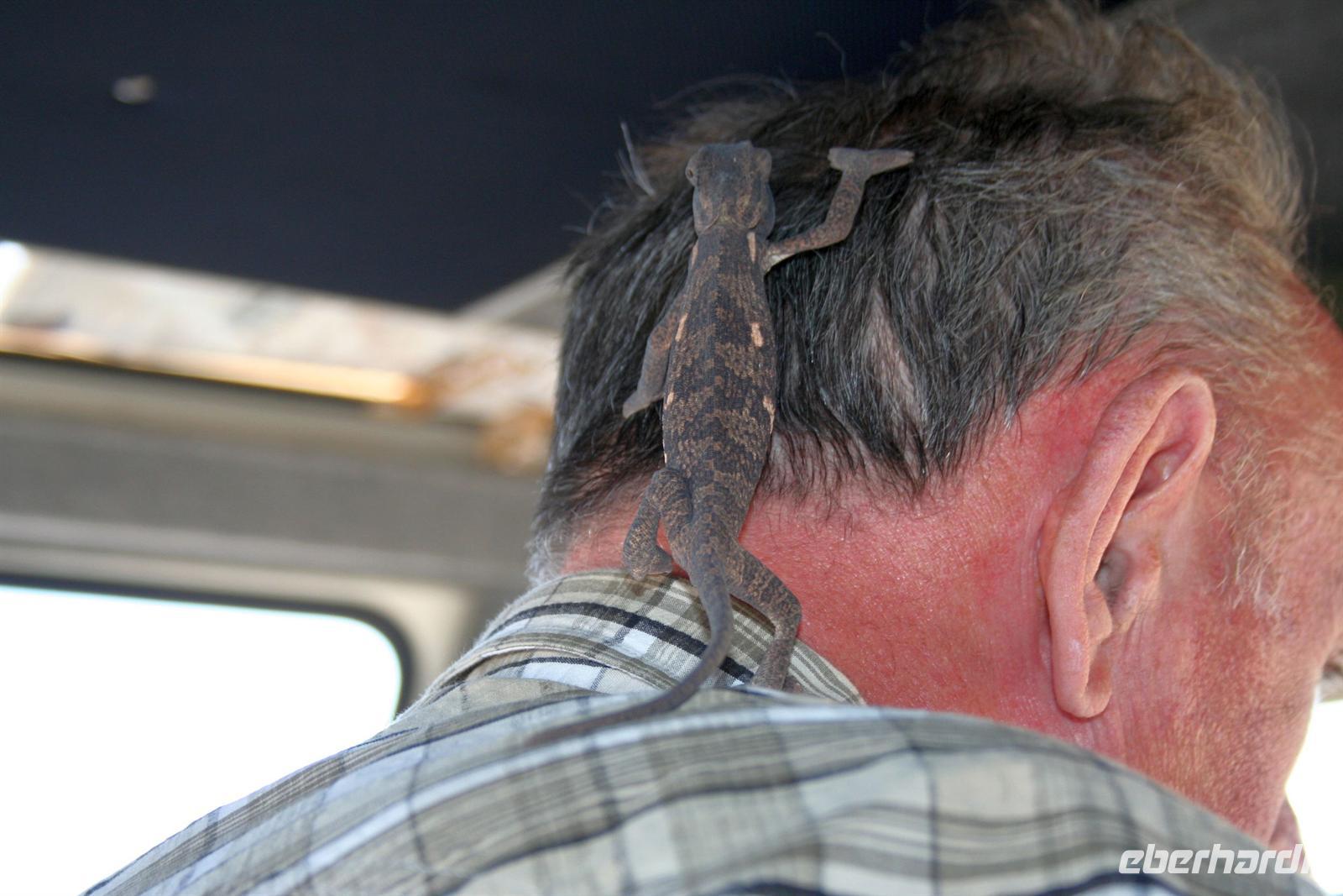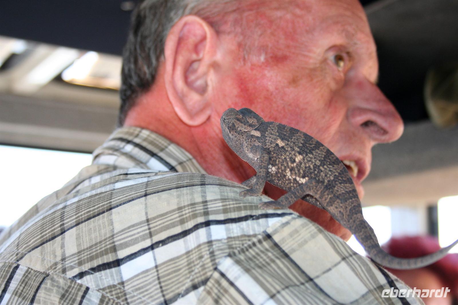 Am folgenden Tag durchstreiften wir erneut den Park. Unser Route führte uns von West nach Ost. Am Aussichtspunkt an der Etosha Pfanne stiegen wir aus: strahlend blauer Himmel; weisse, nicht greifbare Weite und nichts als Weite. Einfach faszinierend - alles erschien unendlich und wir waren mittendrin! Unterwegs schlich sich ein blinder Passagier in unseren Bus. Das Chamäleon fühlte sich bei Martin sichtlich wohl, während es die Farbe meines Hutes weniger amüsant fand. Natürlich gab es auch jede Menge große und kleine Tiere zu sehen. Unsere Mittagspause verbrachten wir im Fort Namutoni, um den Park dann am Lindequist-Gate zu verlassen.