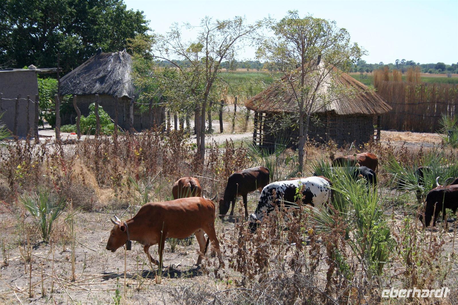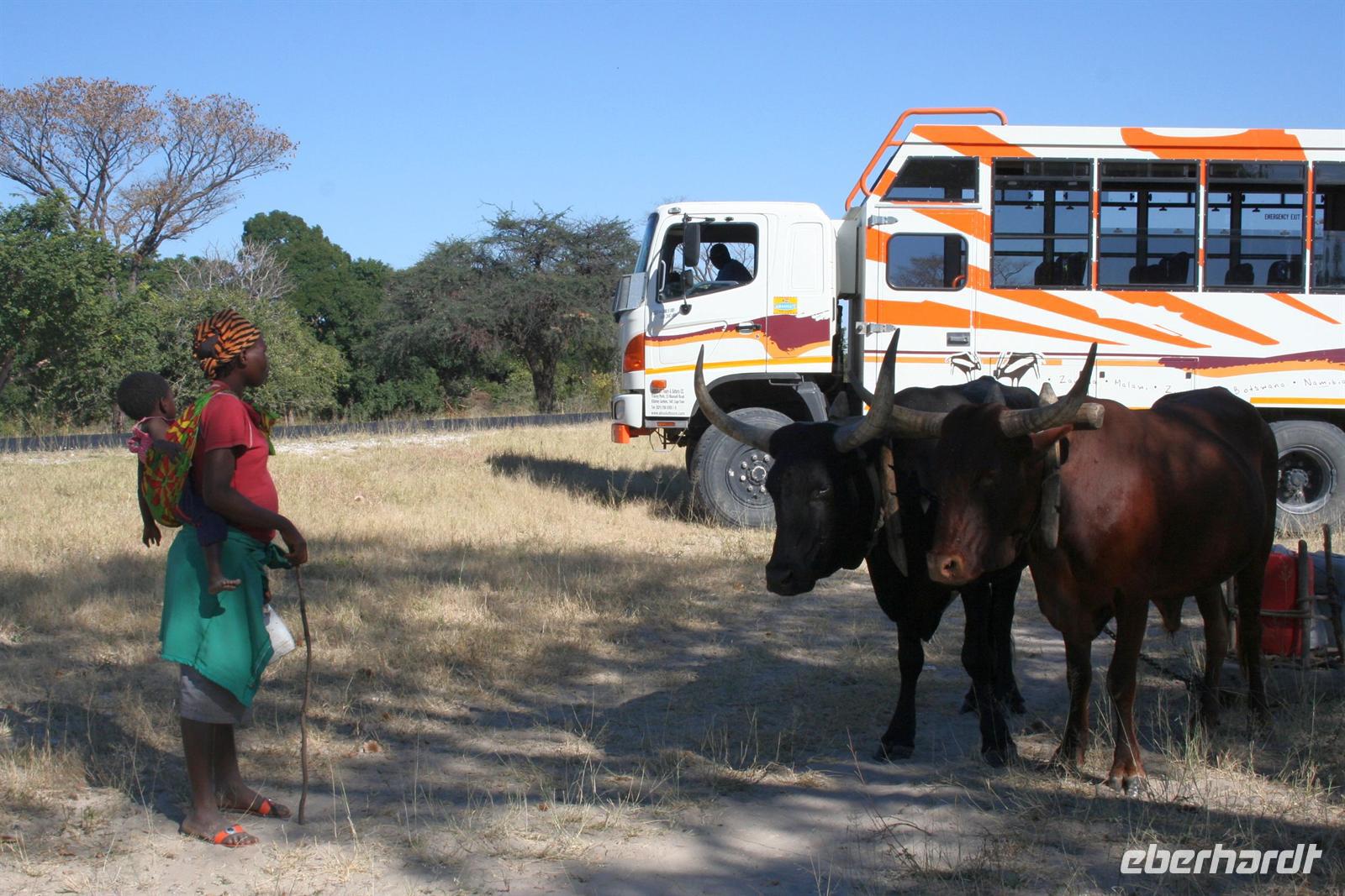 Annett, meine Namensvetterin führte uns durch das Dorf. Die Frauen hatten das Business fest in der Hand, während die Männer des Dorfes auf einem anderen Planet schienen. Anschließend waren wir zu Gast im "echten" Dorf von Sharon, die in der Lodge angestellt ist. Sie war leider nicht da, da sie mit ihrer Mutter und den beiden Kindern im Maisfeld übernachtete, um es vor Elefanten zu schützen. Trotzdem waren wir herzlich willkommen. Sharons Familie freute sich, zeigte uns alles, sang für uns und so bekamen wir unverblümt und hautnah Eindrücke in das heutige Leben eines Familienclans vermittelt.Wir waren beeindruckt und bedankten uns für die Gastfreundschaft. Am Nachmittag hatten wir uns für ein zusätzliches Abenteuer entschieden. Zunächst fuhren wir mit dem Boot zum Ufer des Mudumu NP. Der NP grenzt zaunlos an Botswana und Angola. Dort bestiegen wir den "Monstertruck". Der Truck hat 380 PS und einen V8-Mercedes-Motor und ist original im Film "Mad Max 3" zu sehen. In Einzelteilen kam er von Amerika nach Afrika und wurde zum "Monster-Safari-Truck"umgebaut.Auf unserer Pirschfahrt sahen wir Elefanten, Kudus, Kuhantilopen, Zebras, Impalas, Paviane, Flusspferde und jede Menge große und kleine Vögel. Am Backwater des Kwandos bauten wir unsere "Bar" auf und genossen bei einem kühlen Getränk und Snacks die untergehende Sonne, während eine Elefantenherde badete. Bei diesem Ausflug vergassen wir die Zeit und fuhren fast im Dunklen zurück.