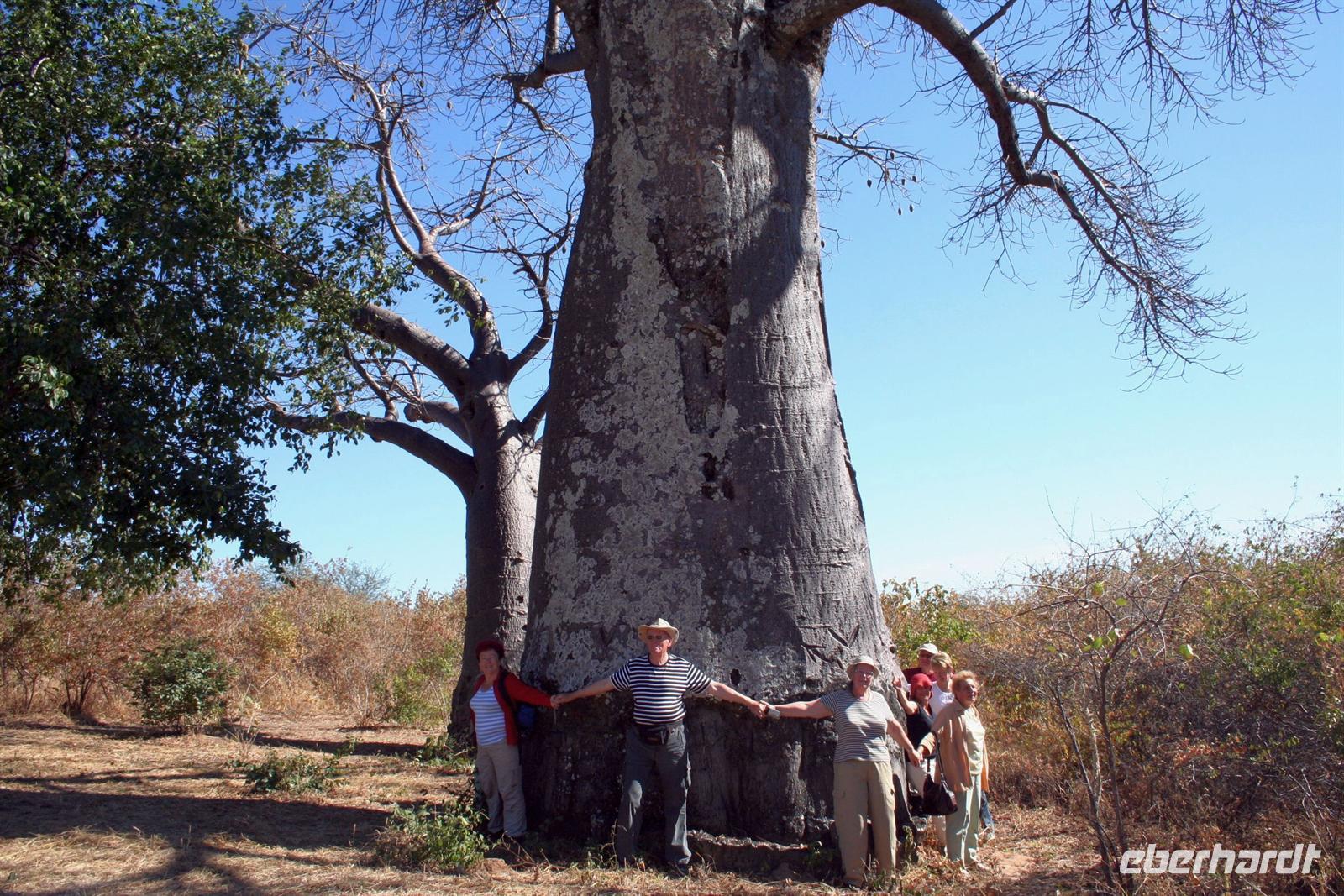 Vormittags besichtigten wir noch den "Vertragsbaum", einen riesigen Baobab, unter dem David Livingstone mit den Einheimischen verhandelt hat. Auf der kurzen Fahrt zum überschaubaren Flughafen nahmen wir Abschied von Tom und Tamu und von Afrika. Es war nachdenklich still im Bus, unsere Reise näherte sich dem Ende. In Gedanken liessen wir unsere Erlebnisse noch einmal Revue passieren. Die Bürokratie der Ausreiseformulatitäten umgingen wir. Ein Formular reichte, da wir ja in "Familie" reisten. Zum Glück waren wir rechtzeitig am Flughafen und konnten so entspannt zu schauen, wie die Schlangen am Check In immer länger wurden. Die Wartezeit am Zoll nahmen wir mit Humor - hier machte man Dienst nach Vorschrift.