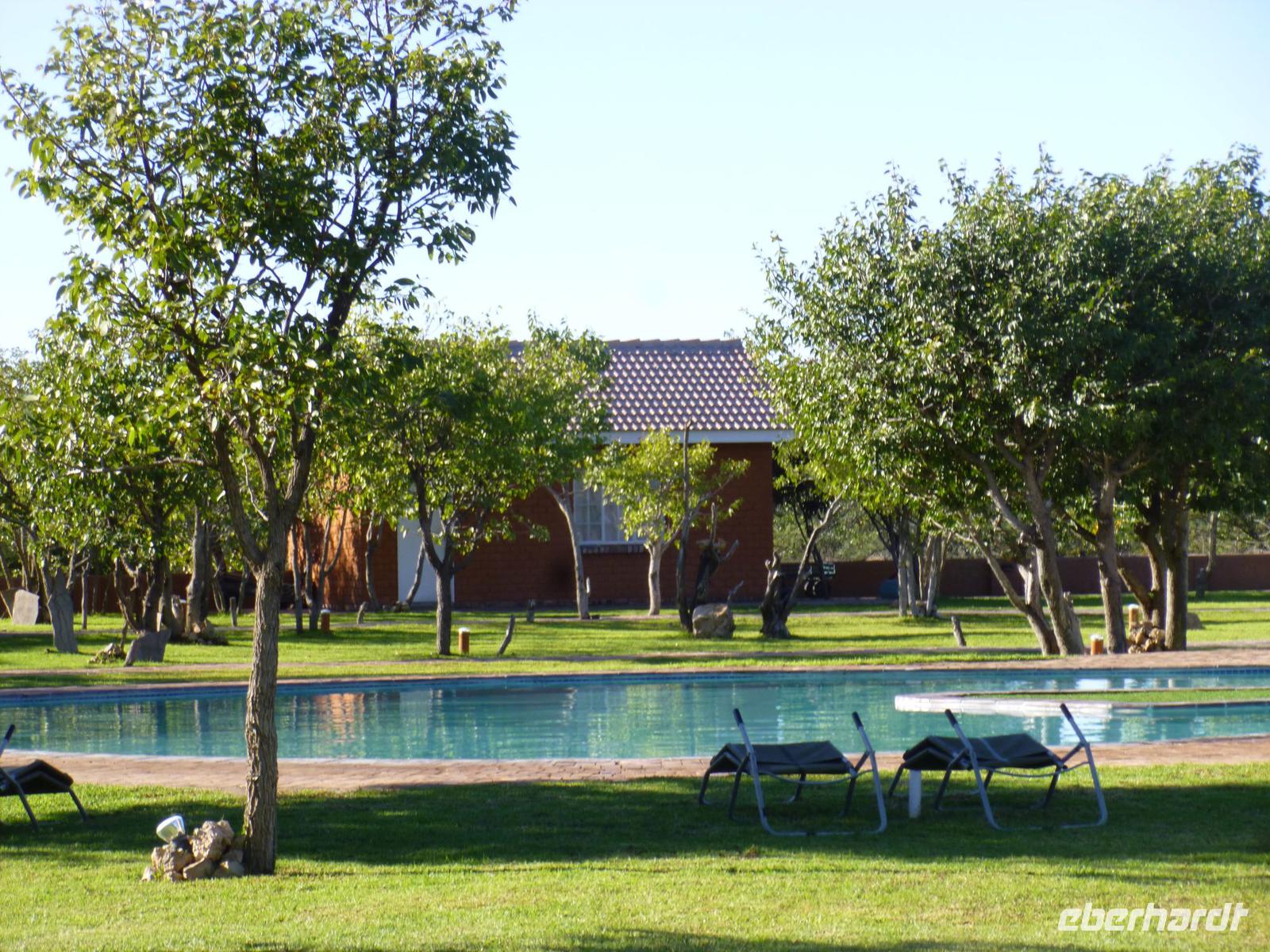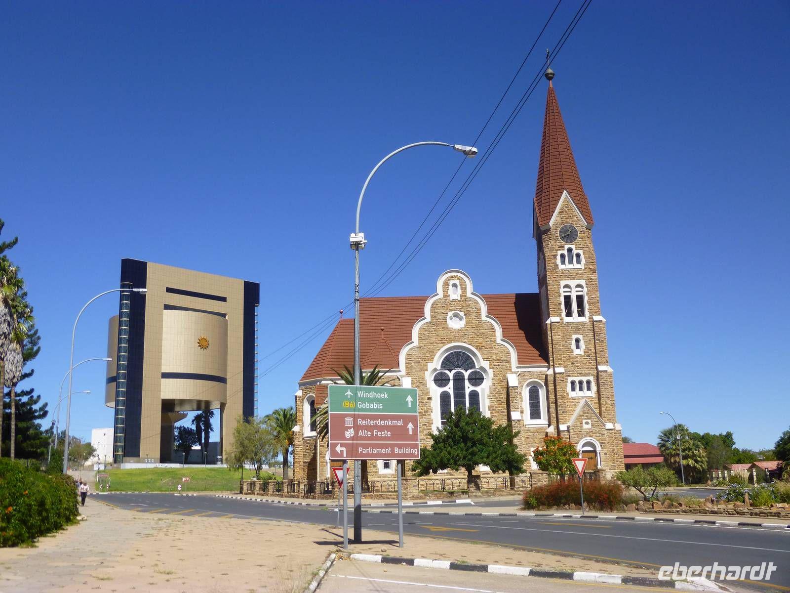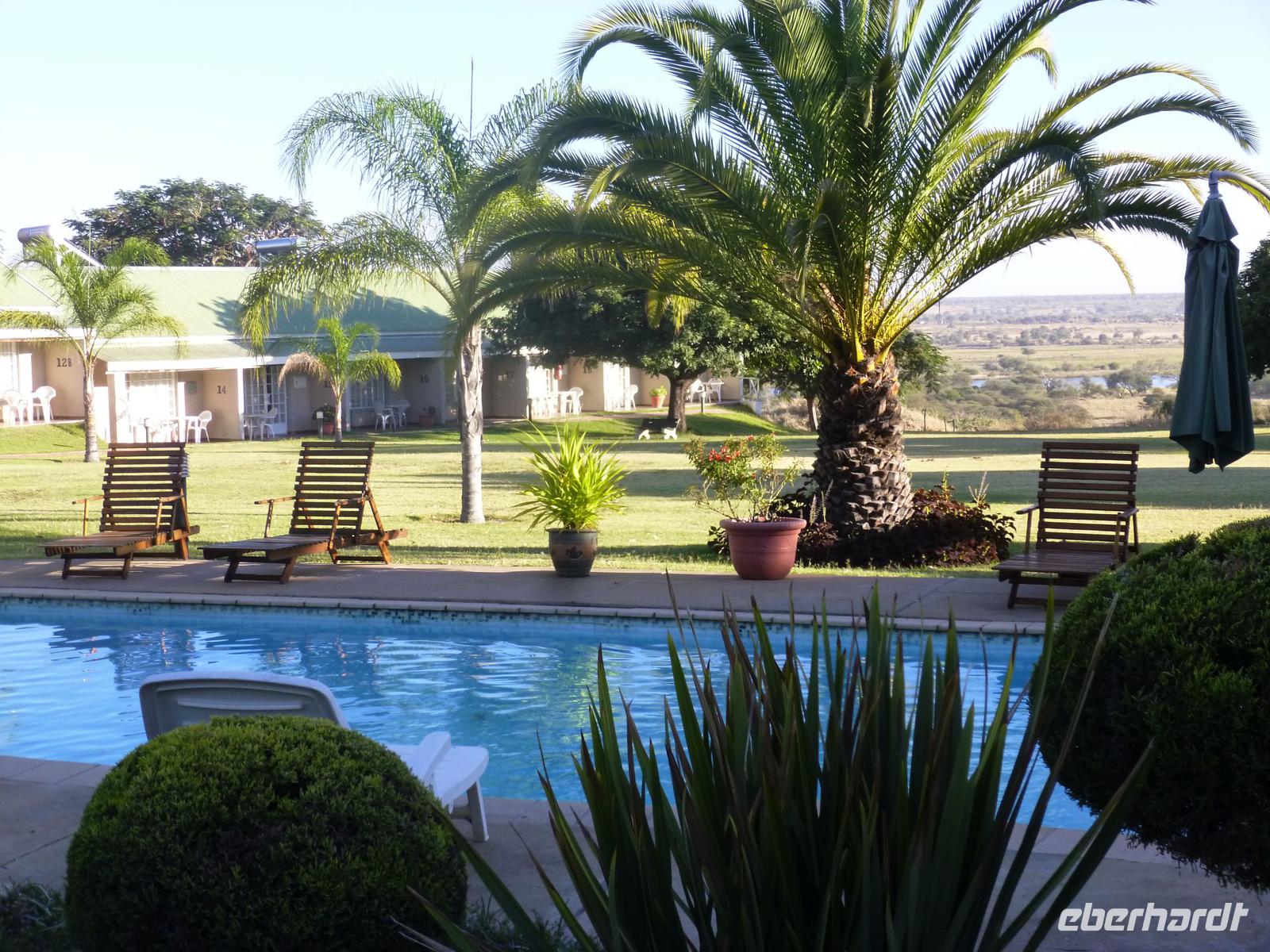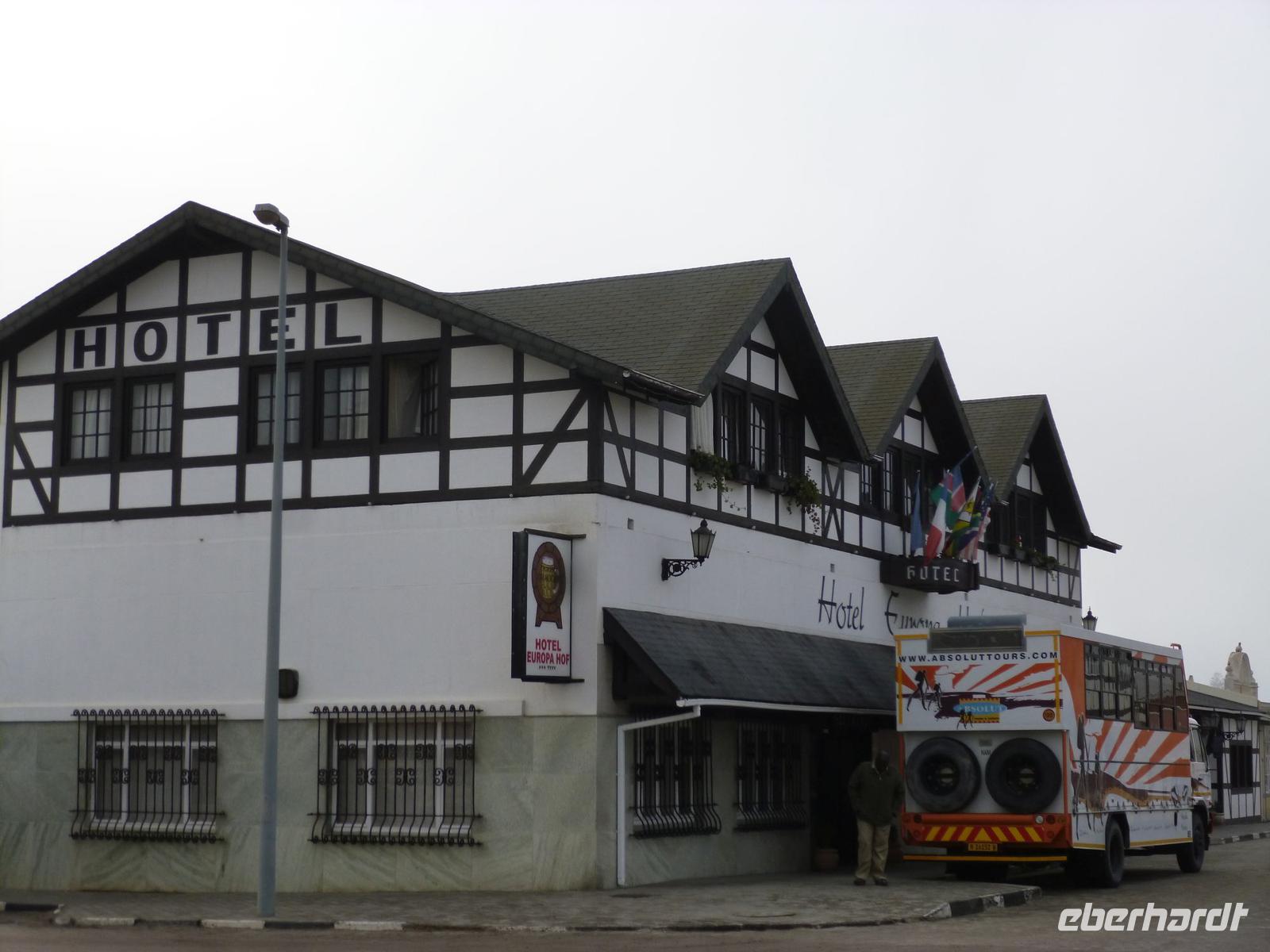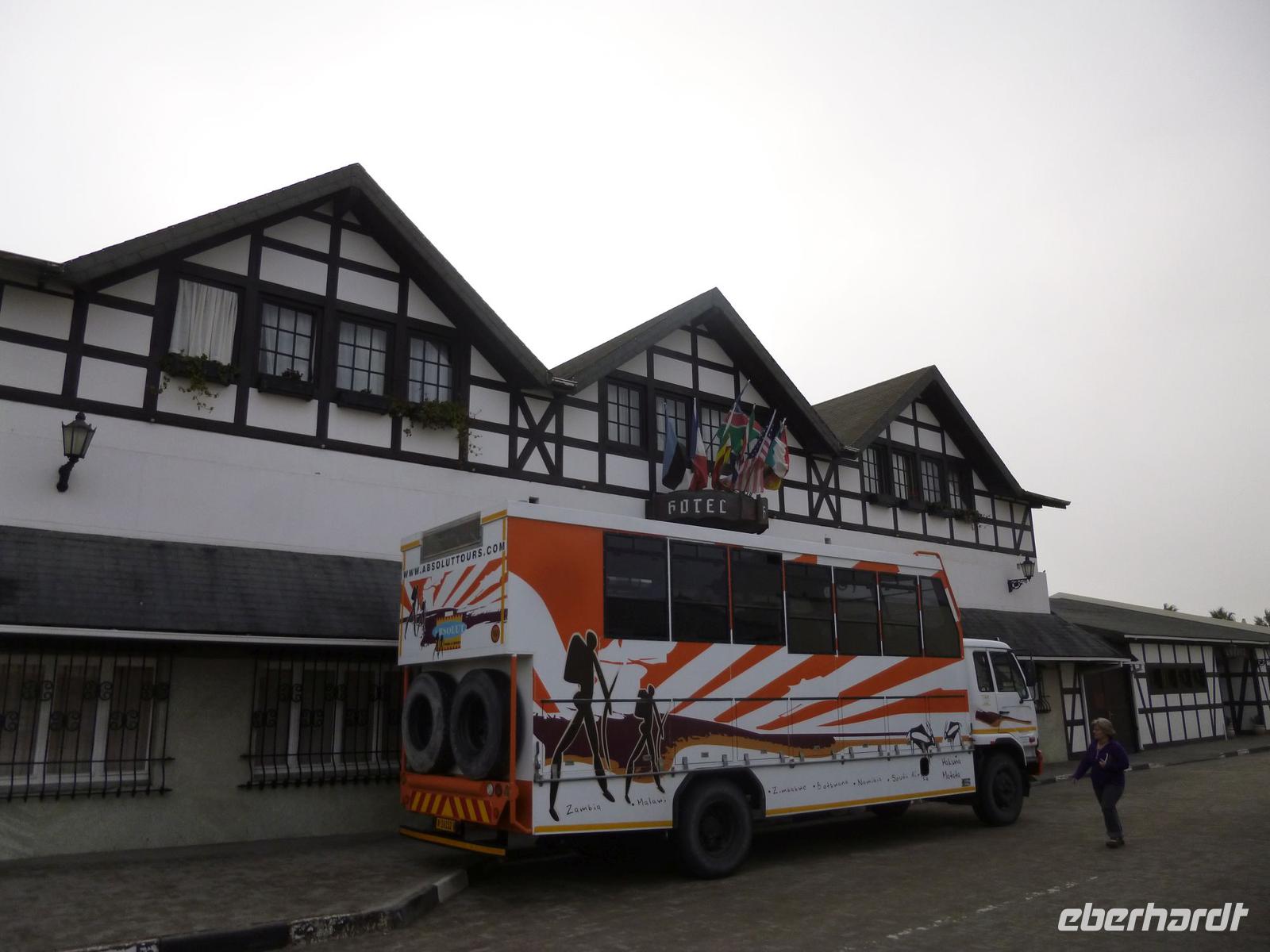 Wir freuen uns auf unsere Reise nach Namibia, Botswana und Zimbabwe. Unsere erste Station ist Windhoek. Wir sind alle sehr müde. Heute ist Sonntag und wir hatten das Gefühl, allein in der Stadt zu sein. Während unserer kleinen Rundfahrt sahen wir den Tintenpalast, die alte Festung, das Reiterdenkmal und die Christuskirche. Wir waren sehr erstaunt über das neu gebaute Unabhängigkeitsmuseum. Wir erreichen das Hotel "Thule". Es verfügte über eine schöne Lage oberhalb der Stadt. Wir nutzten die Zeit bis zum Abendessen für eine kleine Abkühlung im Pool oder einfach dafür, einen Kaffee zu trinken und zu relaxen. Nicht weit vom Hotel entfernt, besuchten wir am Abend Joes´Bierhaus. Das urige Restaurant ist ein Muss für jeden Touristen, der Windhoek besucht. Auch für uns war es ein Erlebnis, die verschieden eingerichteten Räumlichkeiten zu bestaunen. Wir konnten aus der Karte ein Gericht wählen und entschieden uns für einen Wildspieß mit verschiedenen Wildspezialitäten wie Zebra, Strauß, Krokodil, Onyx und Kudu. Jetzt freuten wir uns alle auf unser Bett.