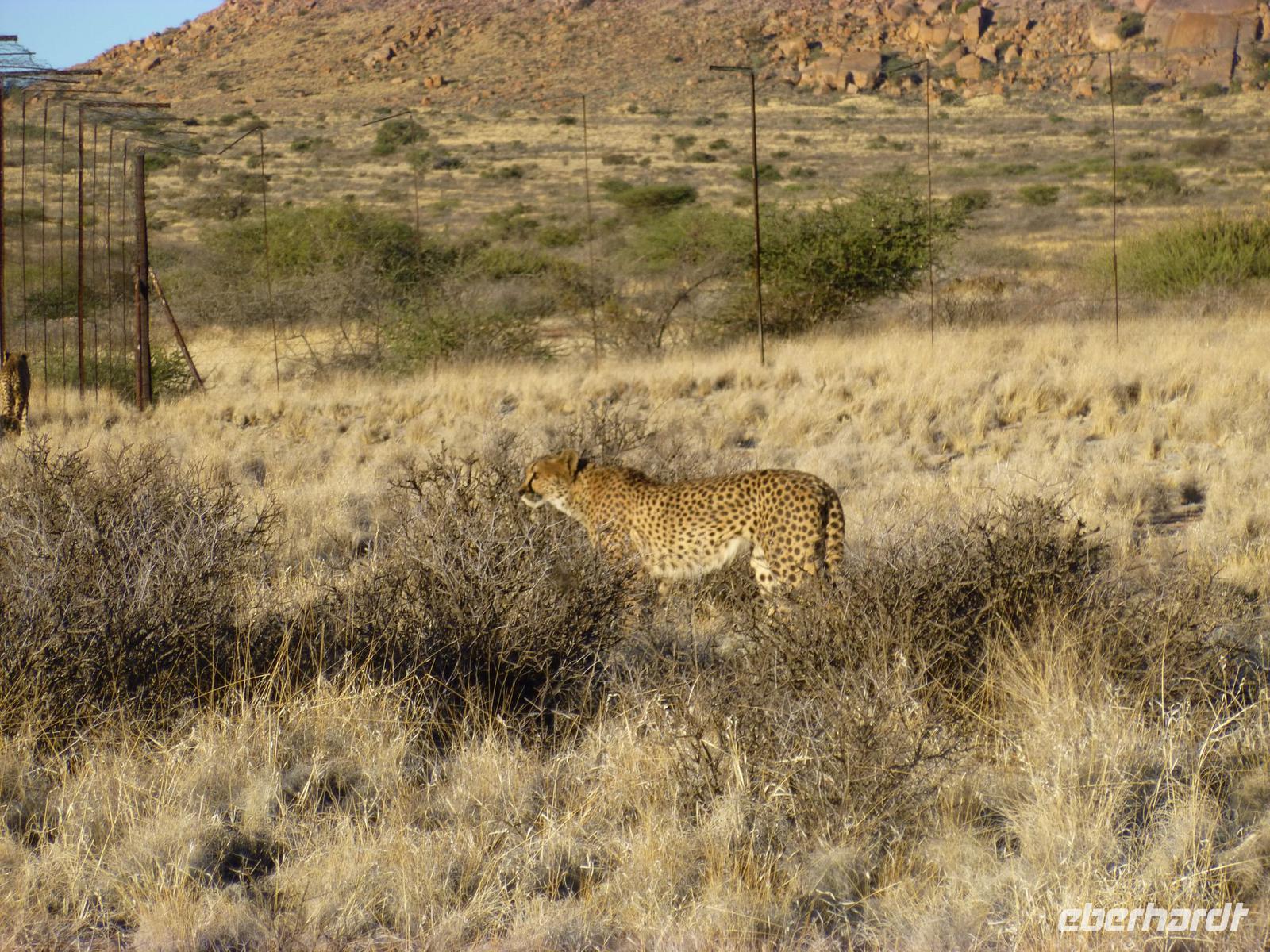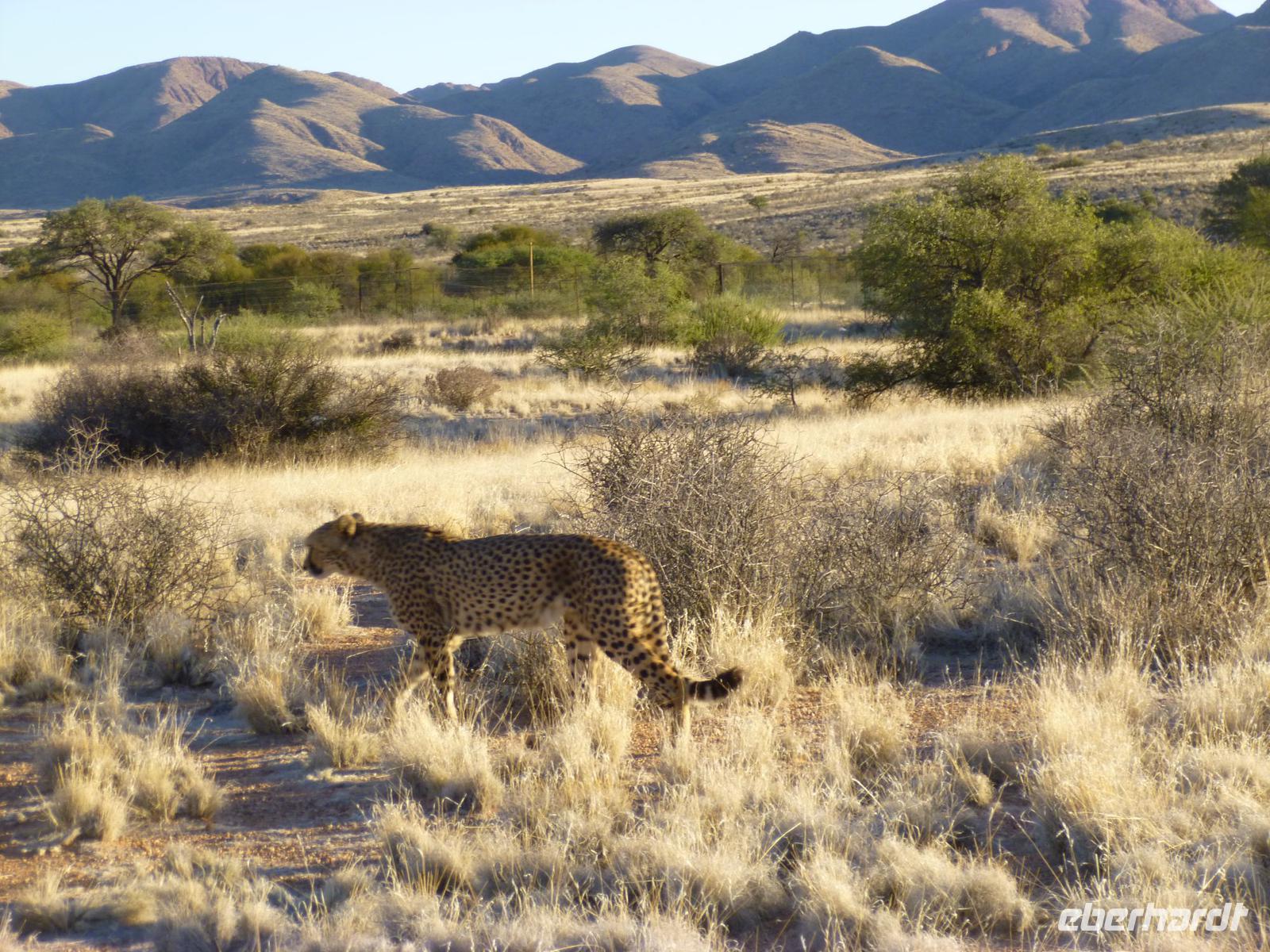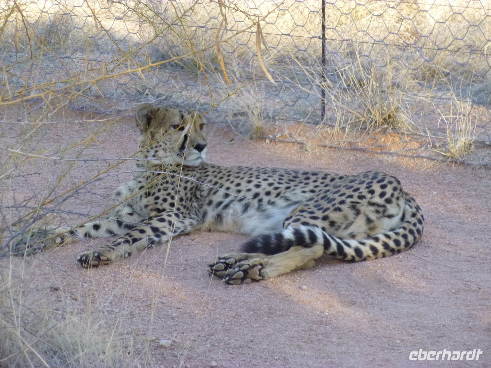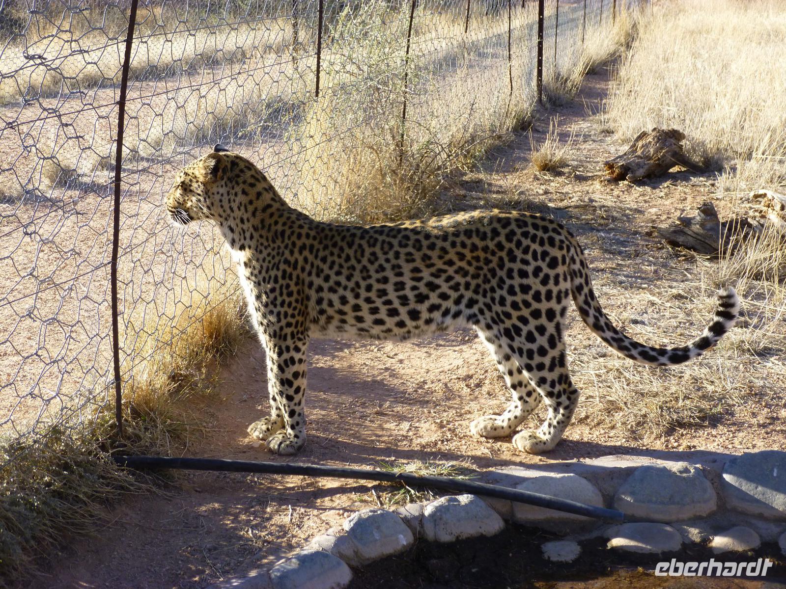Nach dem Frühstück besichtigen wir das Gelände der kleinen Farm. Neben der Schafzucht und Rinderzucht wird hier auch eine Käserei und Metzgerei betrieben. Wir waren auch erstaunt, dass in dieser trockenen Region sogar Wein angebaut wird. Wir verlassen die Region und fahren zurück in Richtung Marienthal und erreichen den kleinen Ort Maltahöhe. Der ehemalige Posten der deutschen Schutztruppen versorgt heute die umliegenden Farmen. In einem alten Kramerladen probierten wir Trockenfleisch und erfreuten uns an vielen alten Dingen, die hier gesammelt werden. In der Hammerstein Lodge erwartete uns ein besonderes Erlebnis, eine Katzen-Tour durch das angrenzende Gelände. Wir beobachteten die Leopardin Susi und begaben uns auf die Suche nach den Afrikanischen Wildkatzen, die sich unter einen Strauch versteckt hatten. Das zahme Geparden-Paar ließ sich sogar mit uns fotografieren!