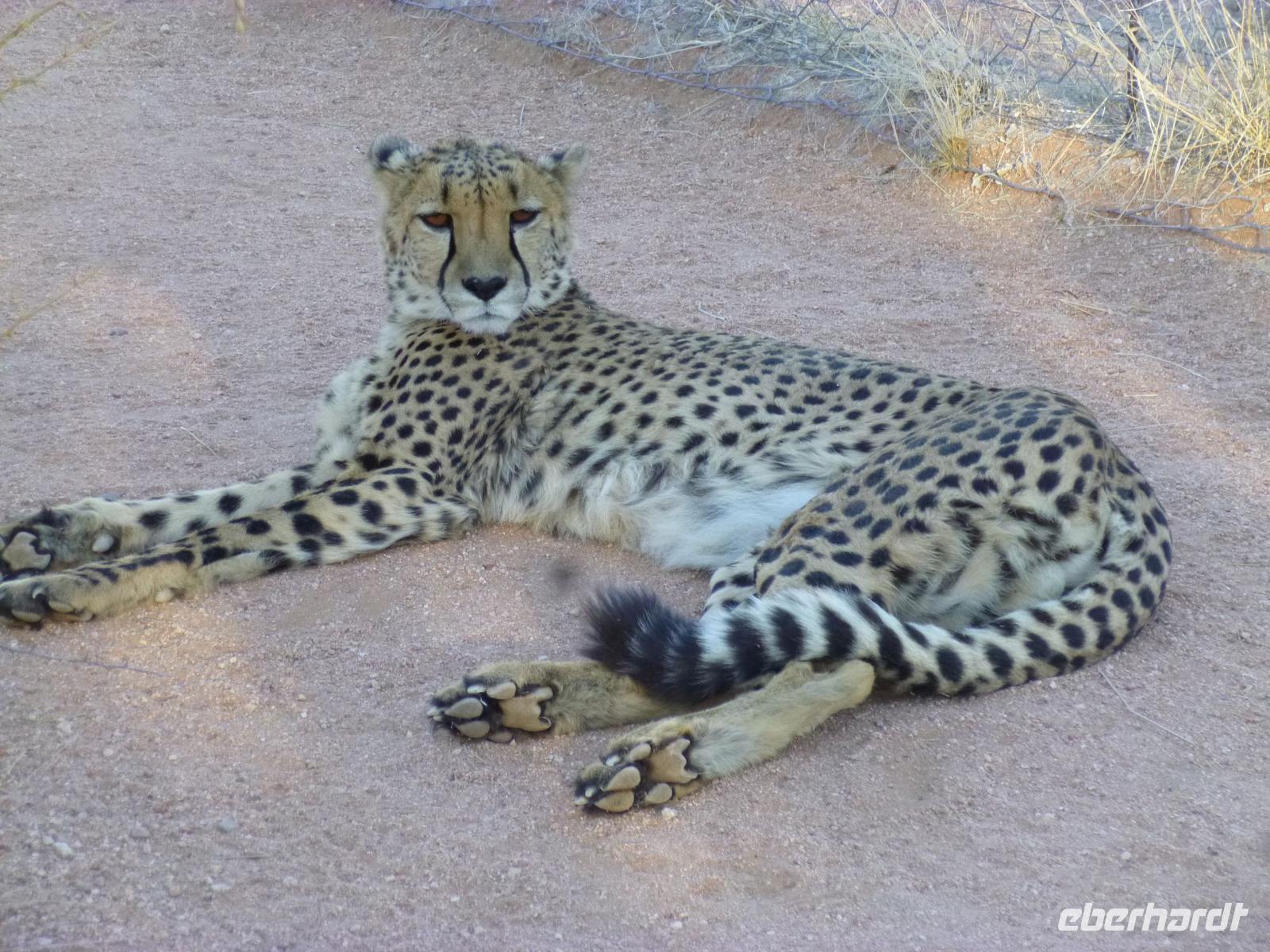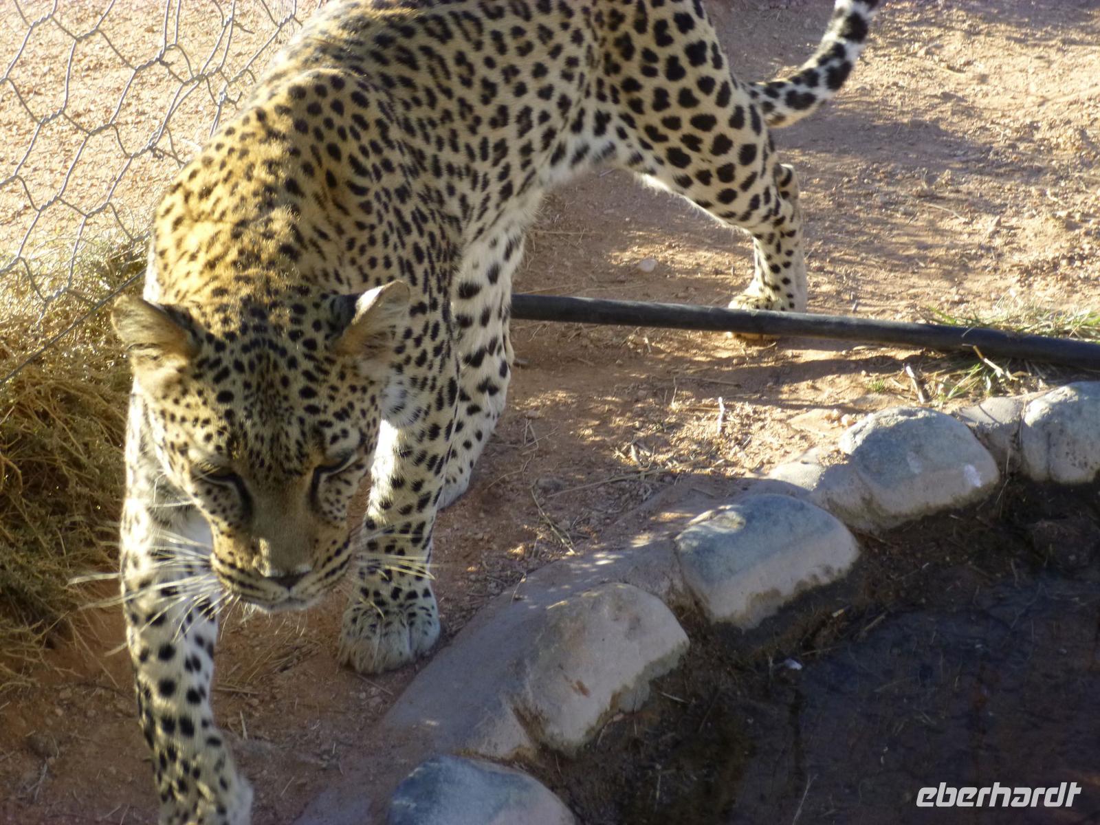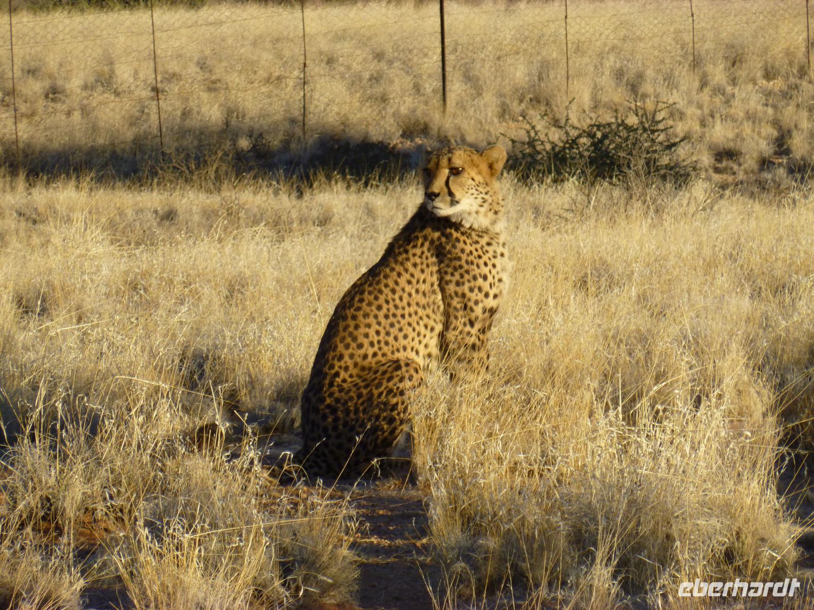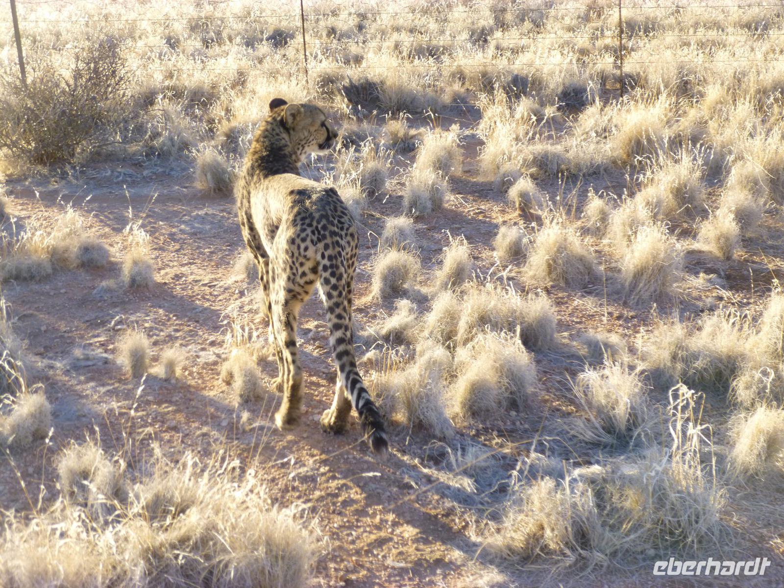 Nach dem Frühstück besichtigen wir das Gelände der kleinen Farm. Neben der Schafzucht und Rinderzucht wird hier auch eine Käserei und Metzgerei betrieben. Wir waren auch erstaunt, dass in dieser trockenen Region sogar Wein angebaut wird. Wir verlassen die Region und fahren zurück in Richtung Marienthal und erreichen den kleinen Ort Maltahöhe. Der ehemalige Posten der deutschen Schutztruppen versorgt heute die umliegenden Farmen. In einem alten Kramerladen probierten wir Trockenfleisch und erfreuten uns an vielen alten Dingen, die hier gesammelt werden. In der Hammerstein Lodge erwartete uns ein besonderes Erlebnis, eine Katzen-Tour durch das angrenzende Gelände. Wir beobachteten die Leopardin Susi und begaben uns auf die Suche nach den Afrikanischen Wildkatzen, die sich unter einen Strauch versteckt hatten. Das zahme Geparden-Paar ließ sich sogar mit uns fotografieren!