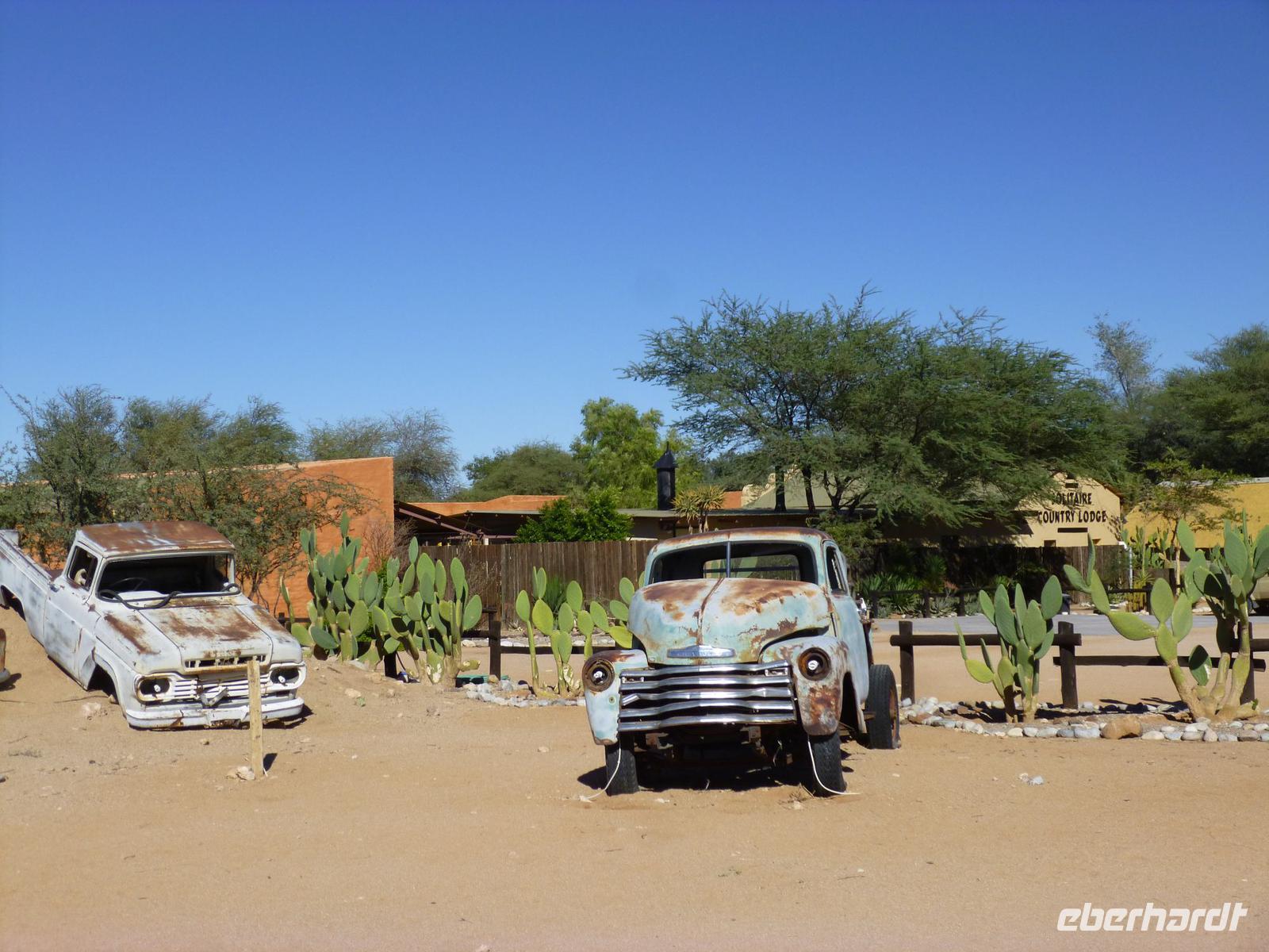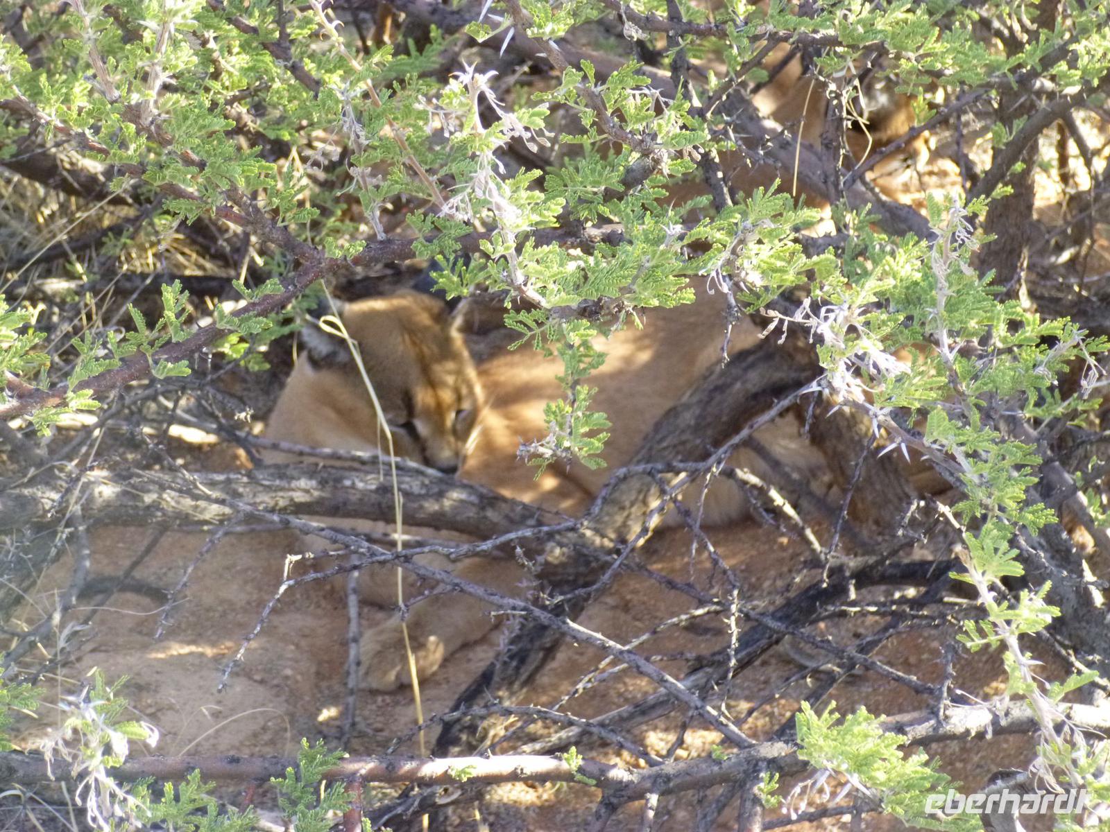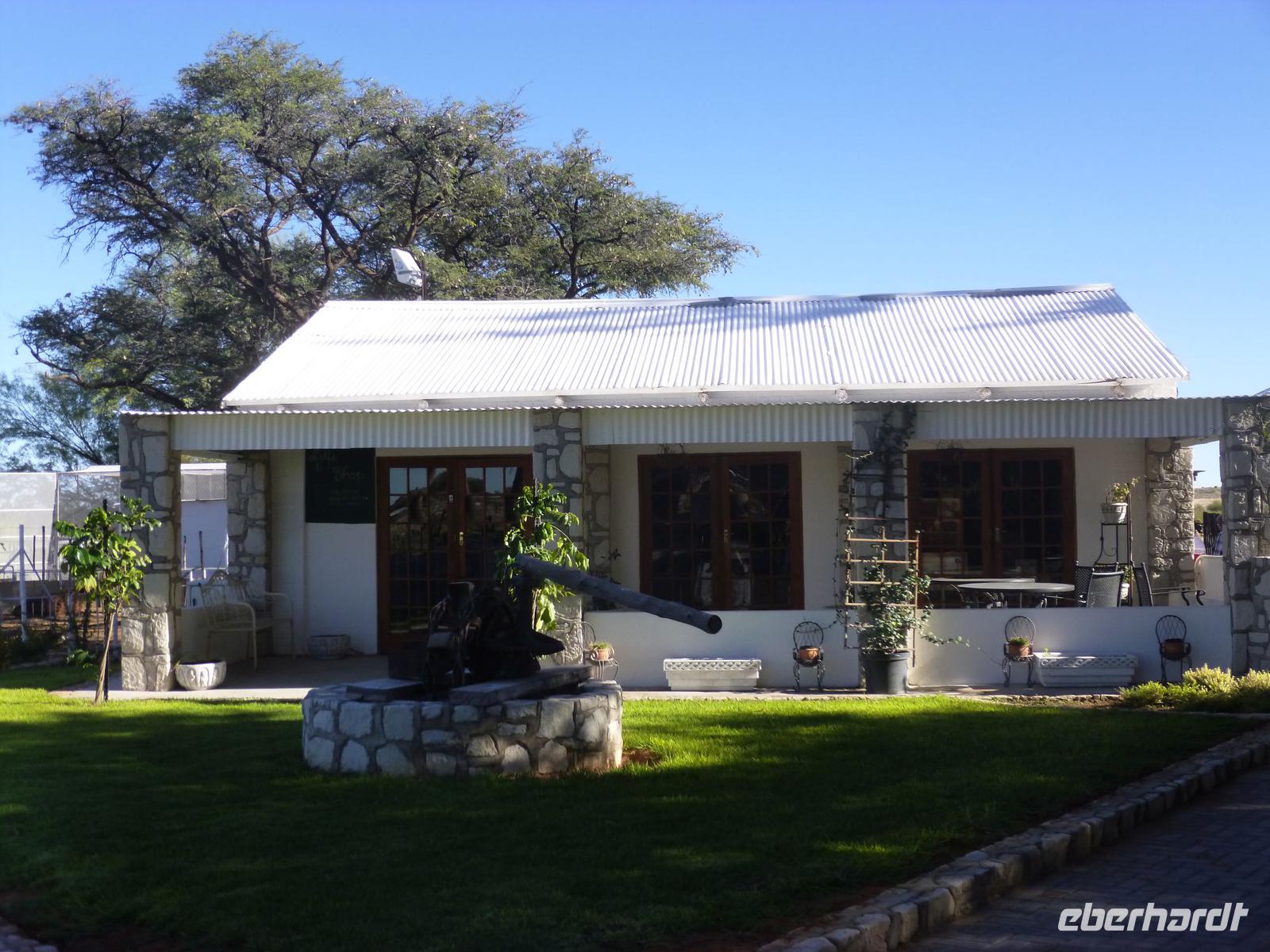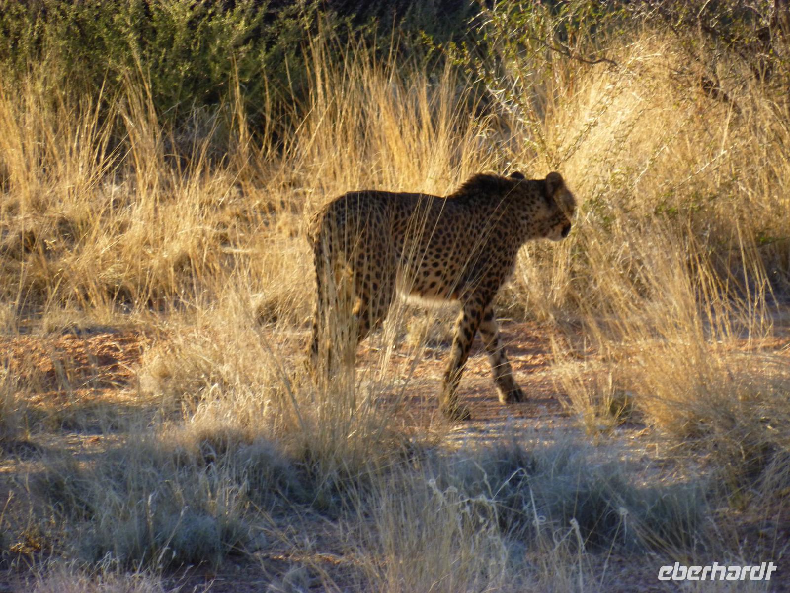 Nach dem Frühstück besichtigen wir das Gelände der kleinen Farm. Neben der Schafzucht und Rinderzucht wird hier auch eine Käserei und Metzgerei betrieben. Wir waren auch erstaunt, dass in dieser trockenen Region sogar Wein angebaut wird. Wir verlassen die Region und fahren zurück in Richtung Marienthal und erreichen den kleinen Ort Maltahöhe. Der ehemalige Posten der deutschen Schutztruppen versorgt heute die umliegenden Farmen. In einem alten Kramerladen probierten wir Trockenfleisch und erfreuten uns an vielen alten Dingen, die hier gesammelt werden. In der Hammerstein Lodge erwartete uns ein besonderes Erlebnis, eine Katzen-Tour durch das angrenzende Gelände. Wir beobachteten die Leopardin Susi und begaben uns auf die Suche nach den Afrikanischen Wildkatzen, die sich unter einen Strauch versteckt hatten. Das zahme Geparden-Paar ließ sich sogar mit uns fotografieren!