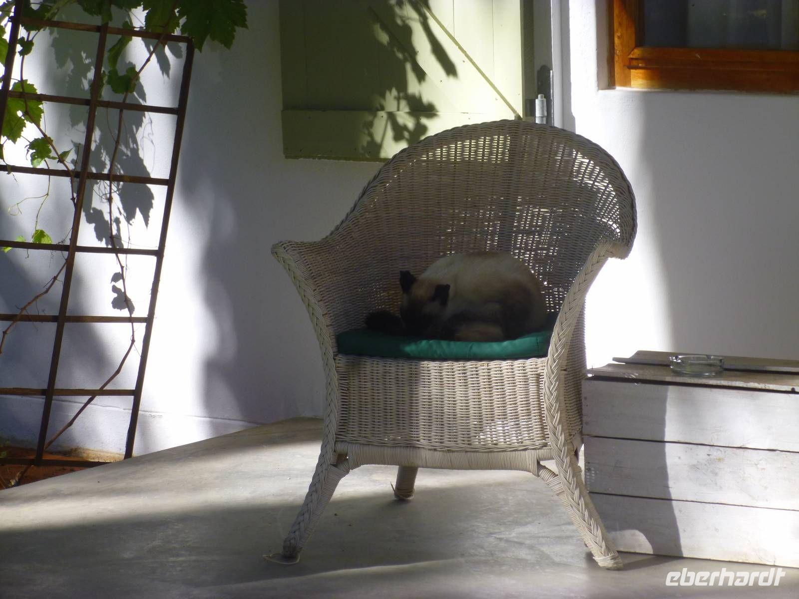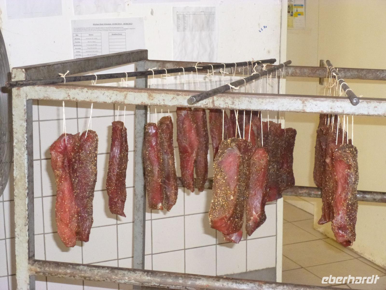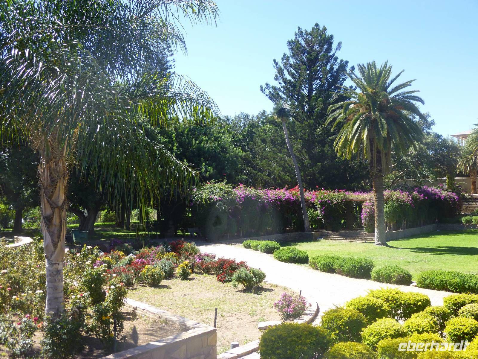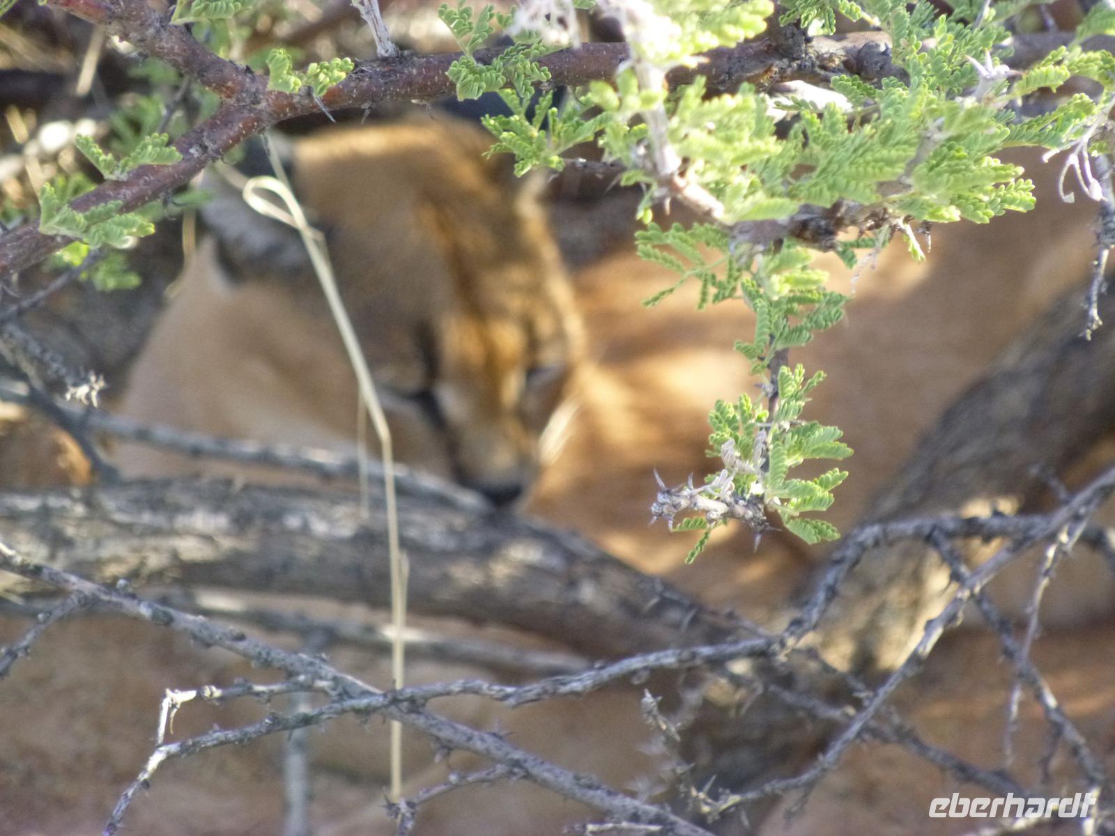 Nach dem Frühstück besichtigen wir das Gelände der kleinen Farm. Neben der Schafzucht und Rinderzucht wird hier auch eine Käserei und Metzgerei betrieben. Wir waren auch erstaunt, dass in dieser trockenen Region sogar Wein angebaut wird. Wir verlassen die Region und fahren zurück in Richtung Marienthal und erreichen den kleinen Ort Maltahöhe. Der ehemalige Posten der deutschen Schutztruppen versorgt heute die umliegenden Farmen. In einem alten Kramerladen probierten wir Trockenfleisch und erfreuten uns an vielen alten Dingen, die hier gesammelt werden. In der Hammerstein Lodge erwartete uns ein besonderes Erlebnis, eine Katzen-Tour durch das angrenzende Gelände. Wir beobachteten die Leopardin Susi und begaben uns auf die Suche nach den Afrikanischen Wildkatzen, die sich unter einen Strauch versteckt hatten. Das zahme Geparden-Paar ließ sich sogar mit uns fotografieren!
